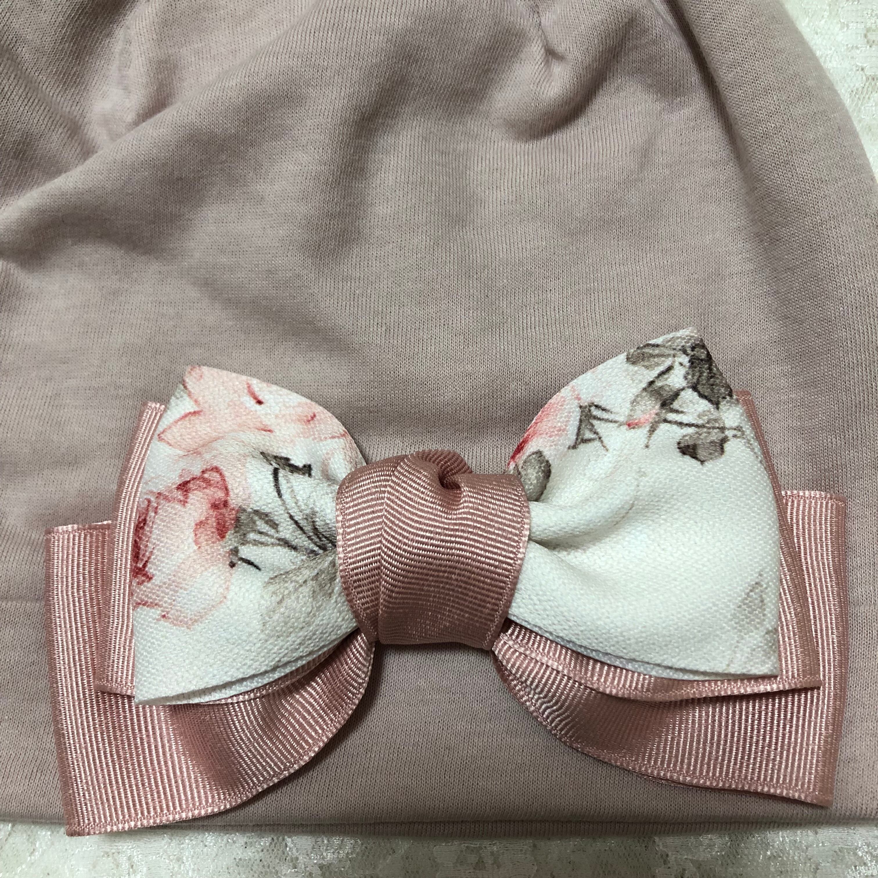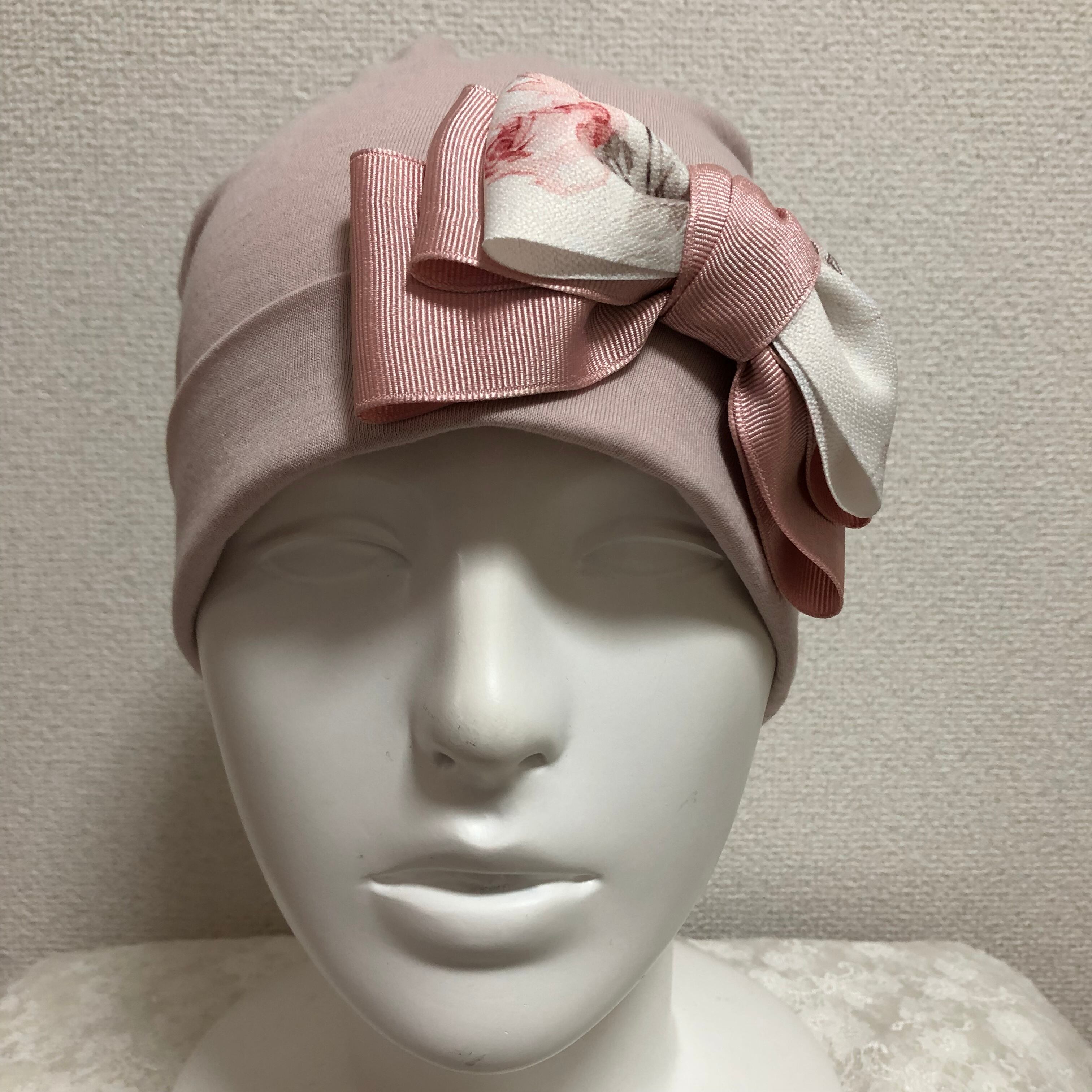 肌触りの良い、伸縮性のあるお生地で作ったお帽子に、薔薇の柄入りリボンを付けた素敵なデザインです。