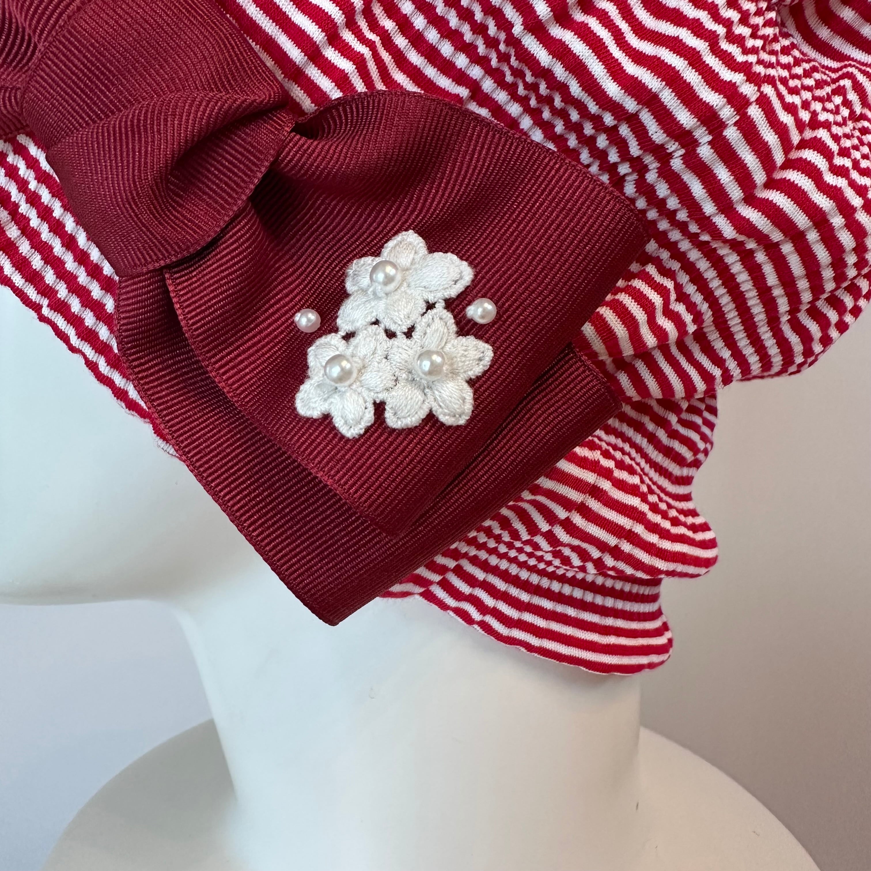 肌触りの良い、伸縮性のあるお生地で作ったお帽子に、お花モチーフ付きグログランリボンを付けた素敵なデザインです。
