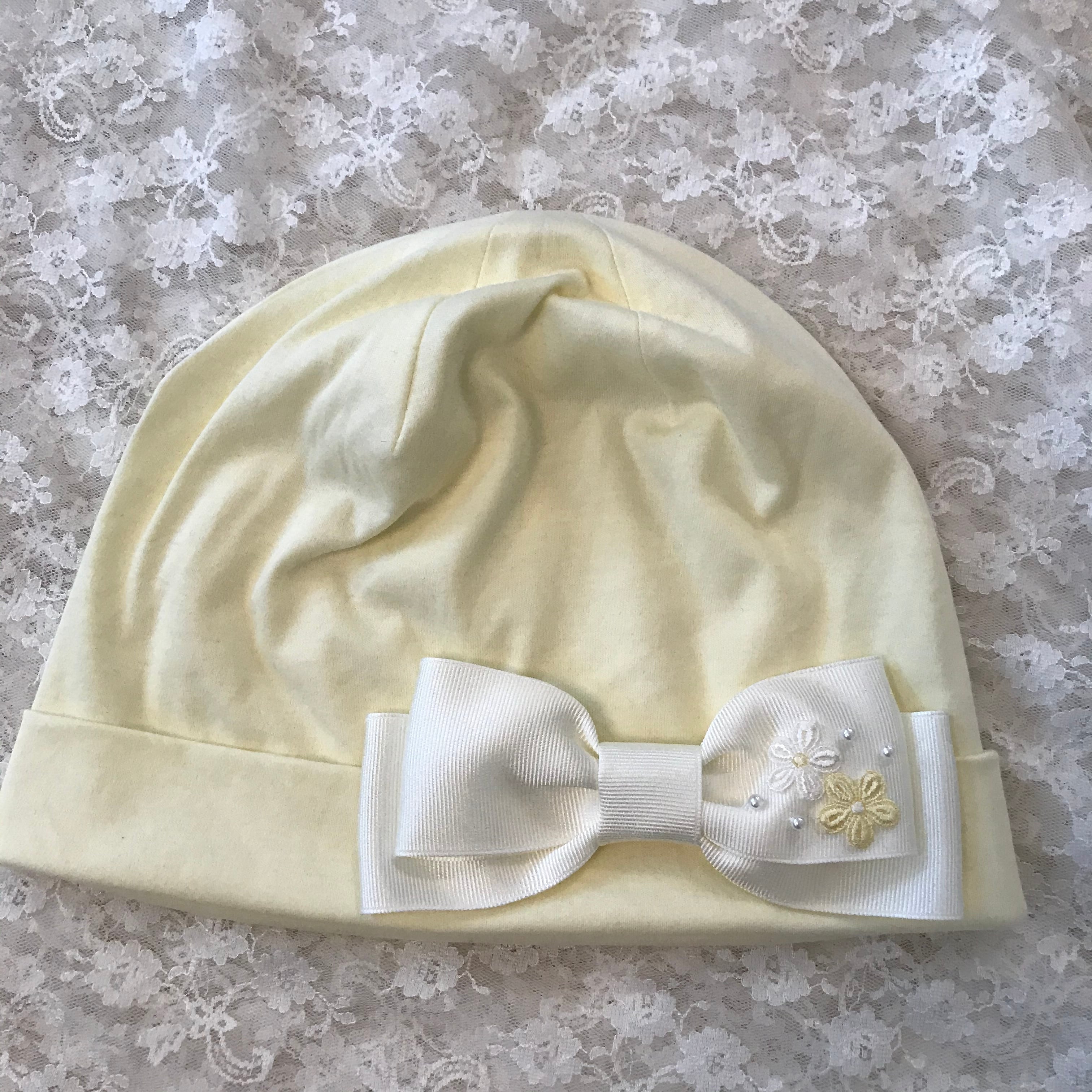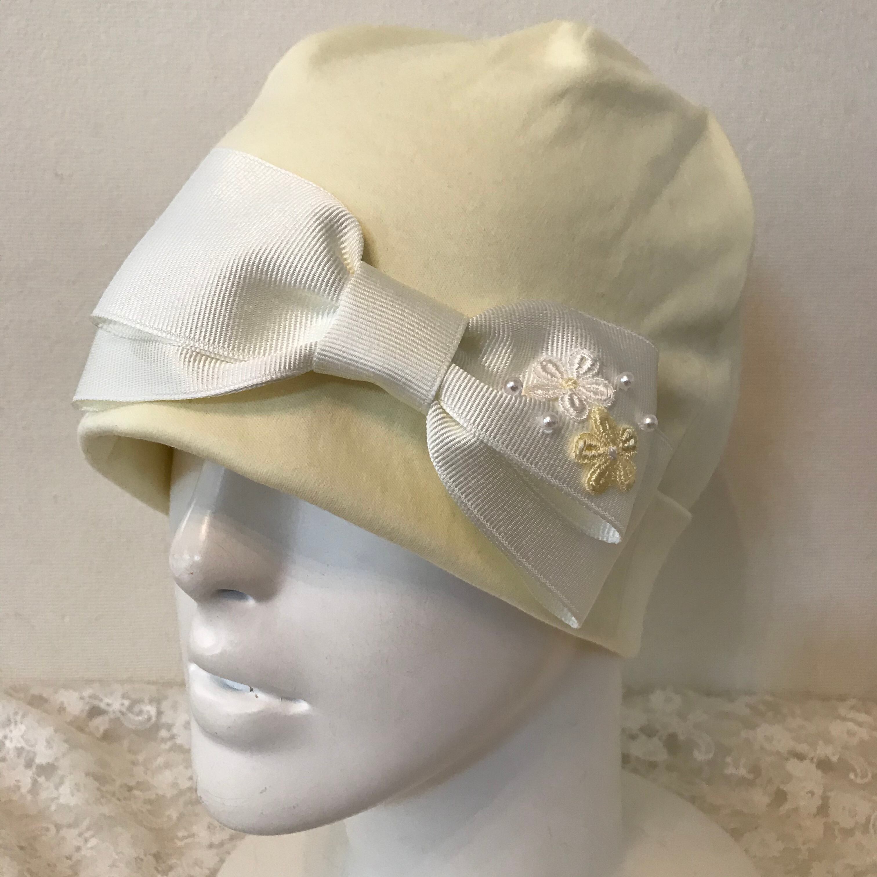 肌触りの良い、伸縮性のあるお生地で作ったお帽子に、お花モチーフ付きグログランリボンを付けた素敵なデザインです。