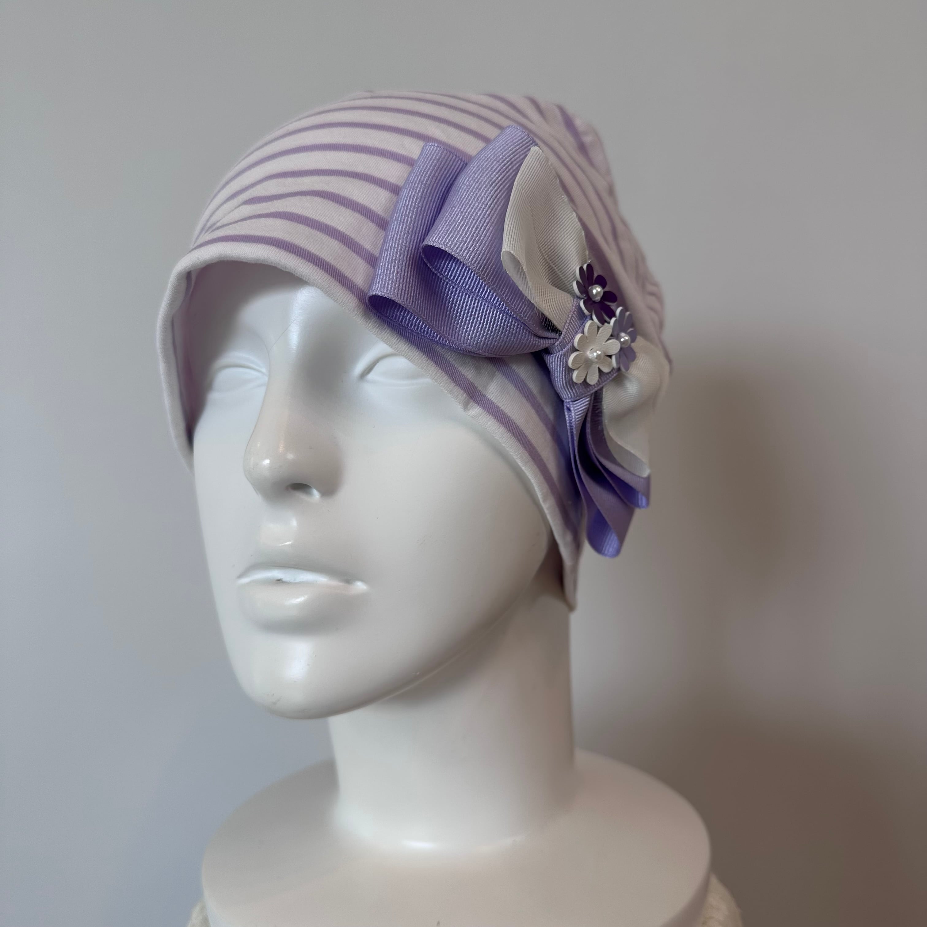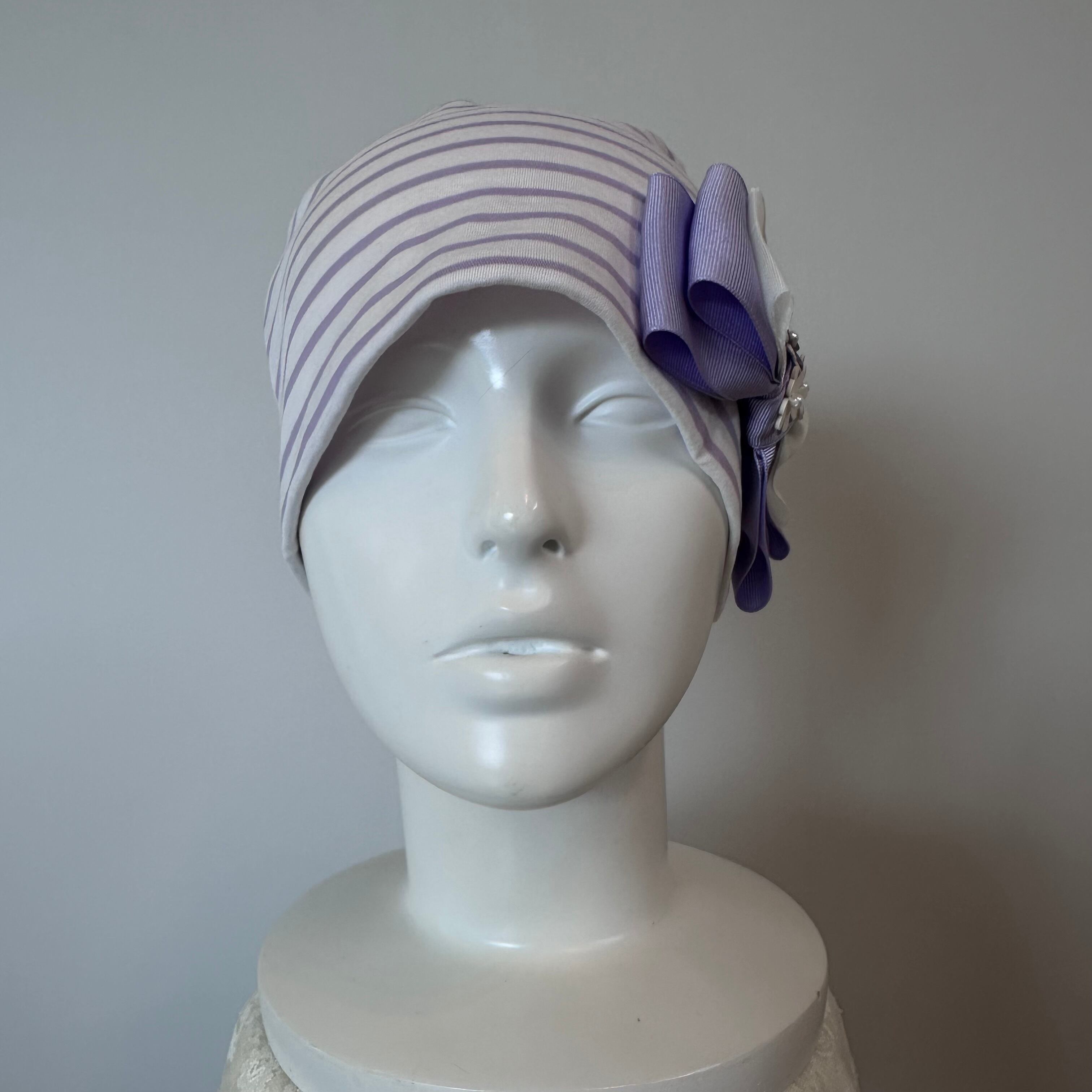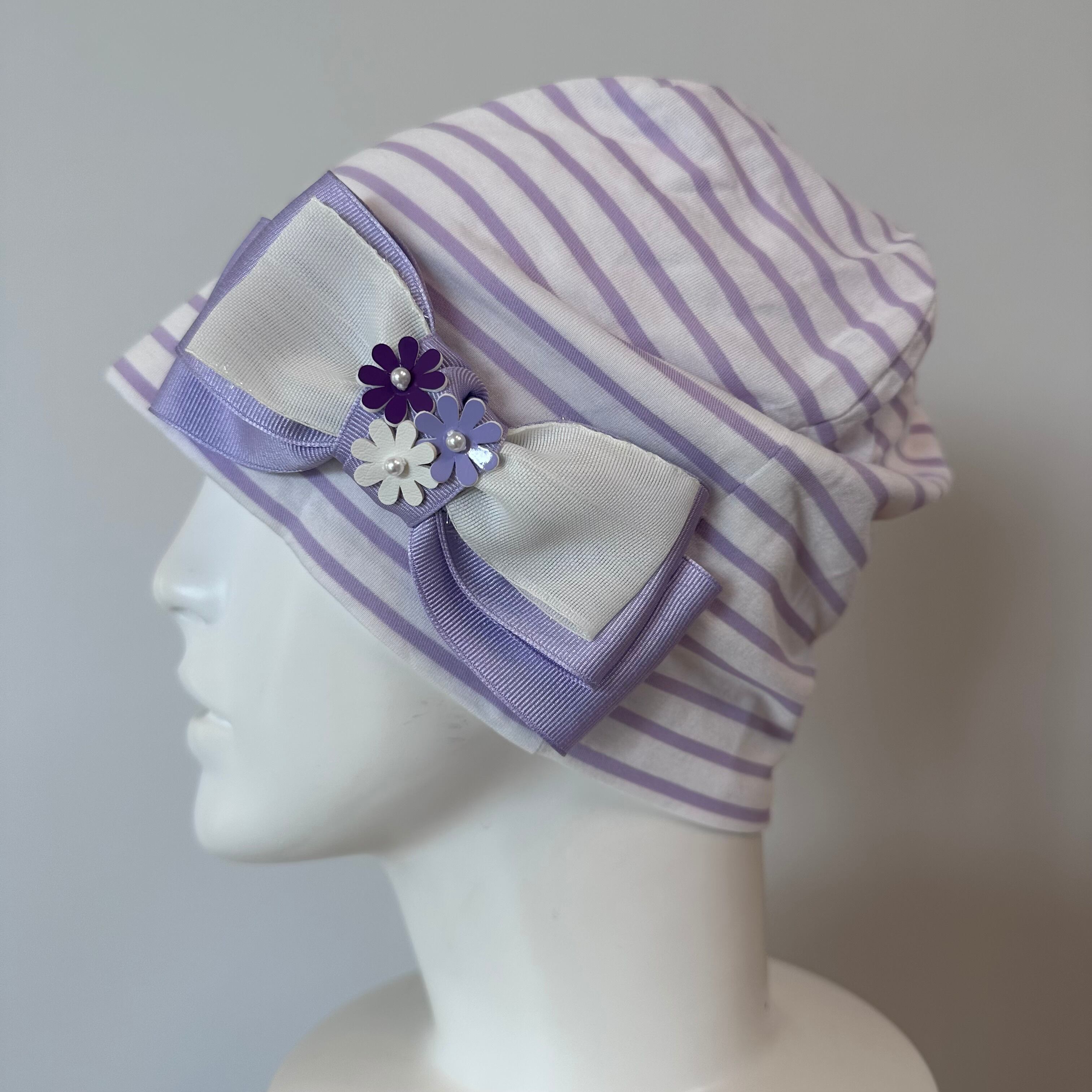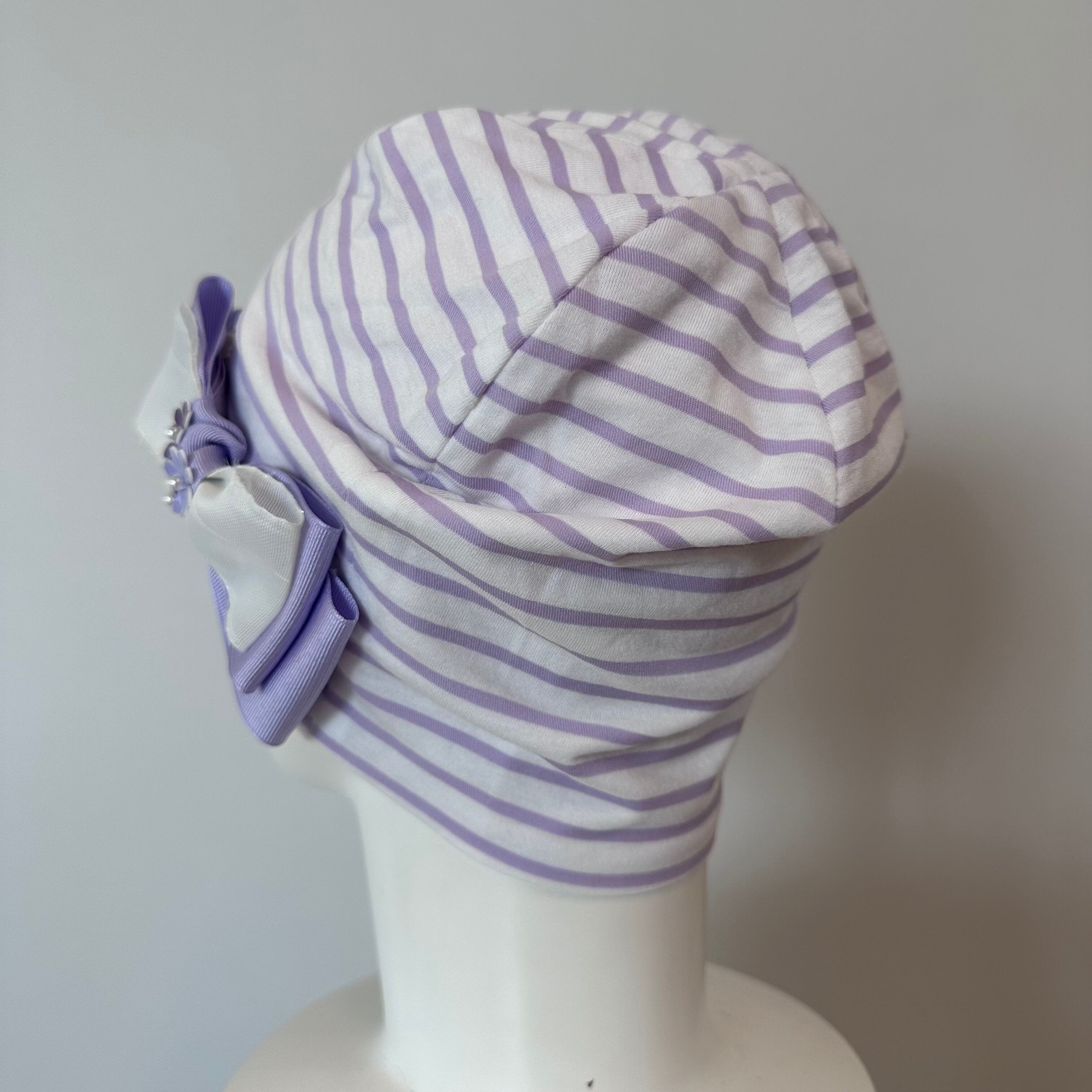 肌触りの良い、伸縮性のあるお生地で作ったお帽子に、おリボンを付けた素敵なデザインです。