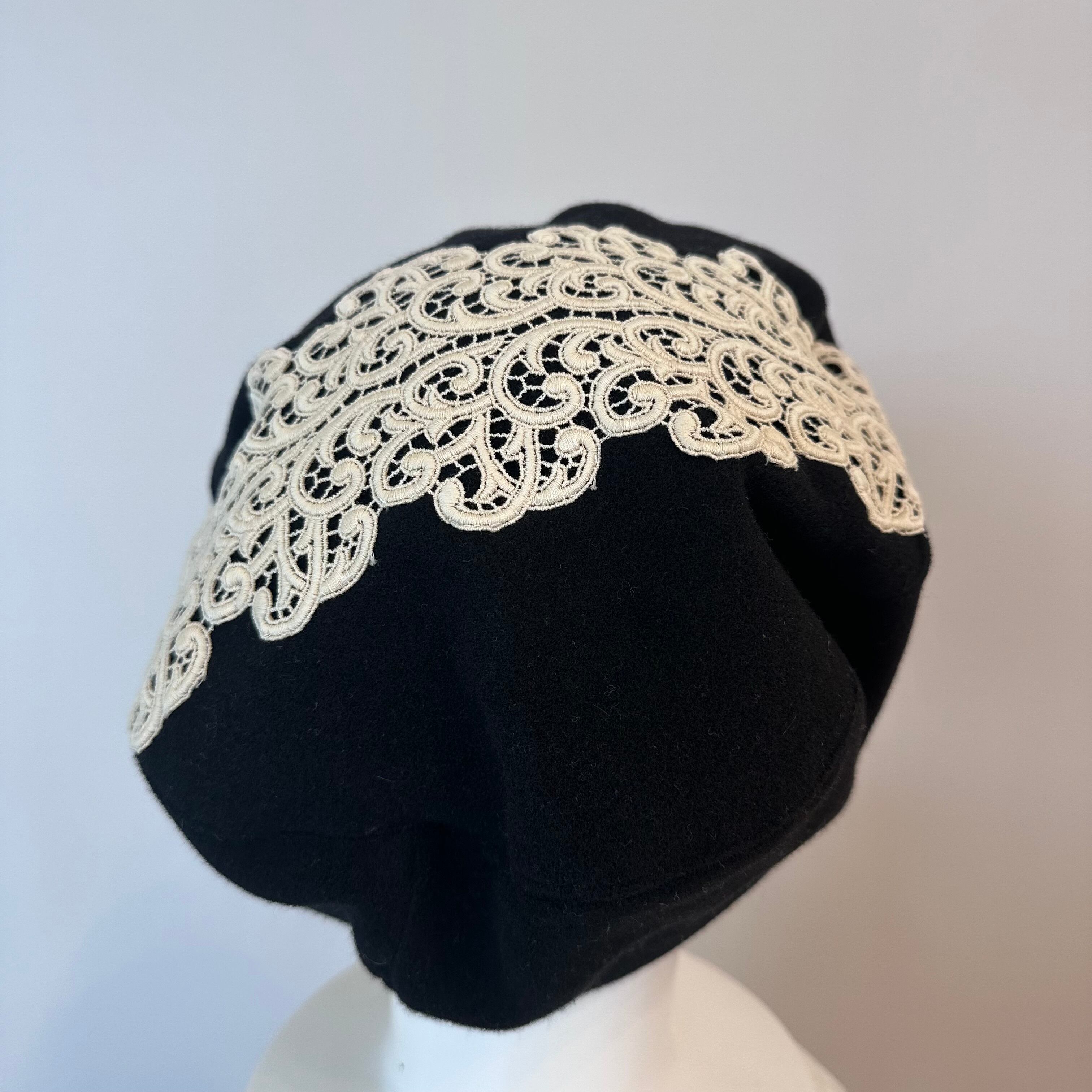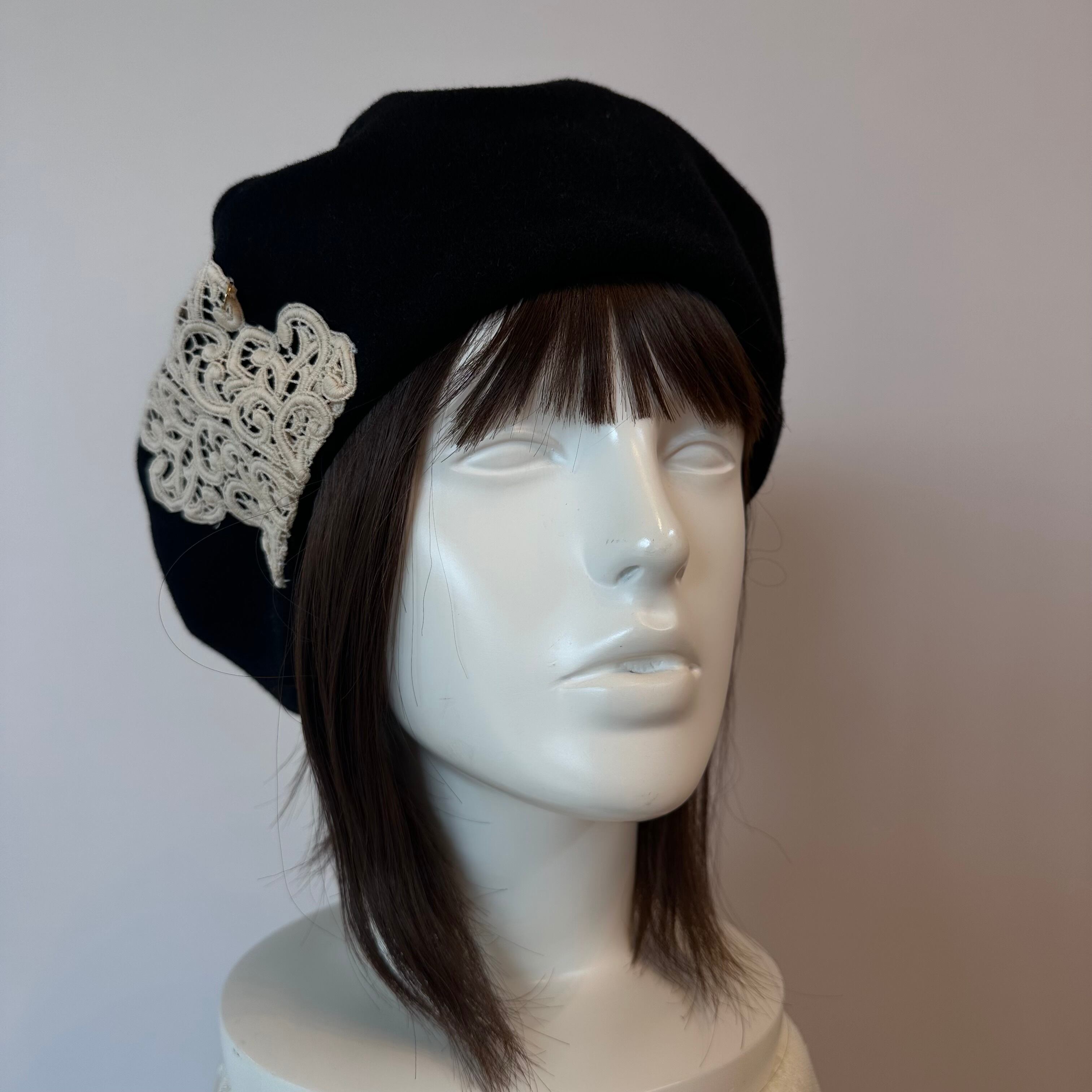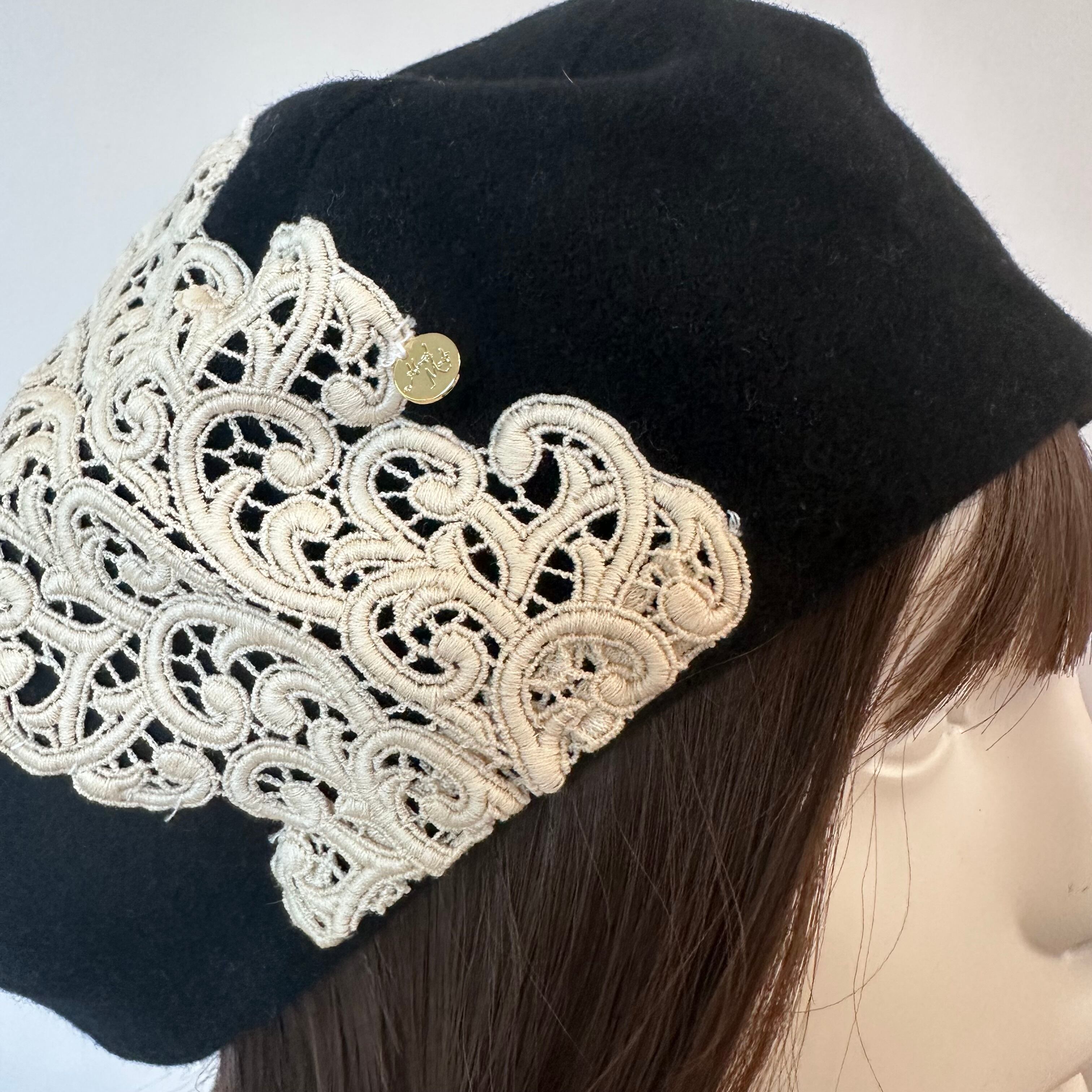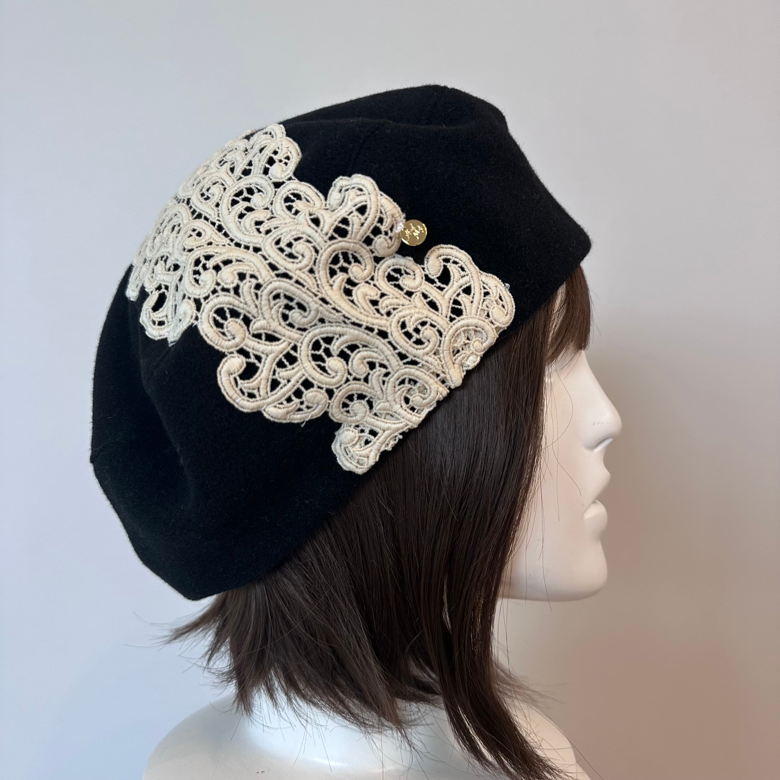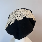 お生地たっぷりベレー帽 ウールブラック レース付き