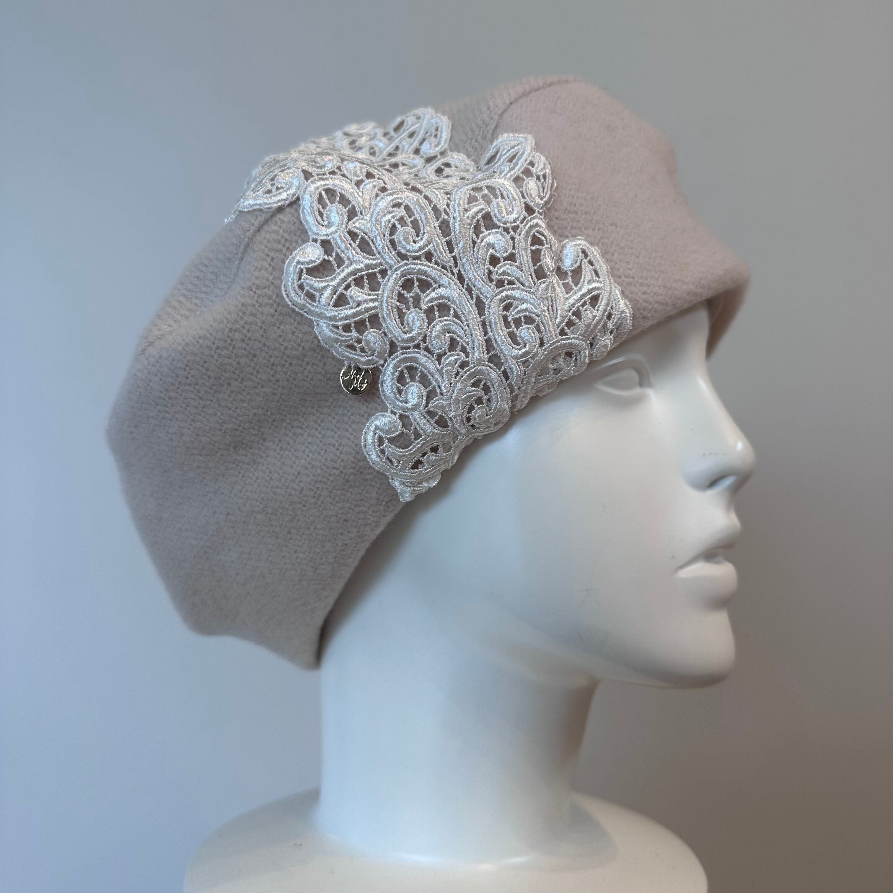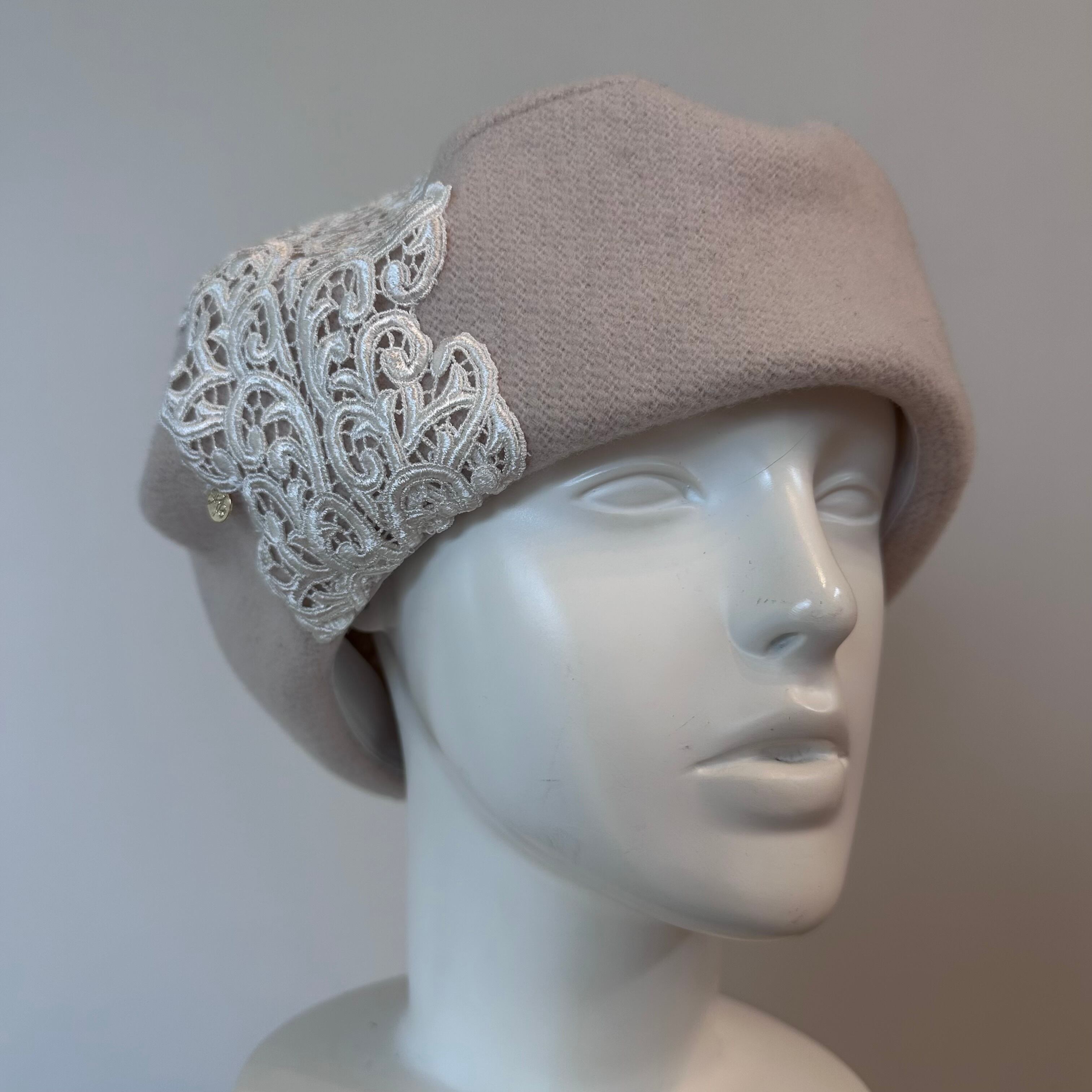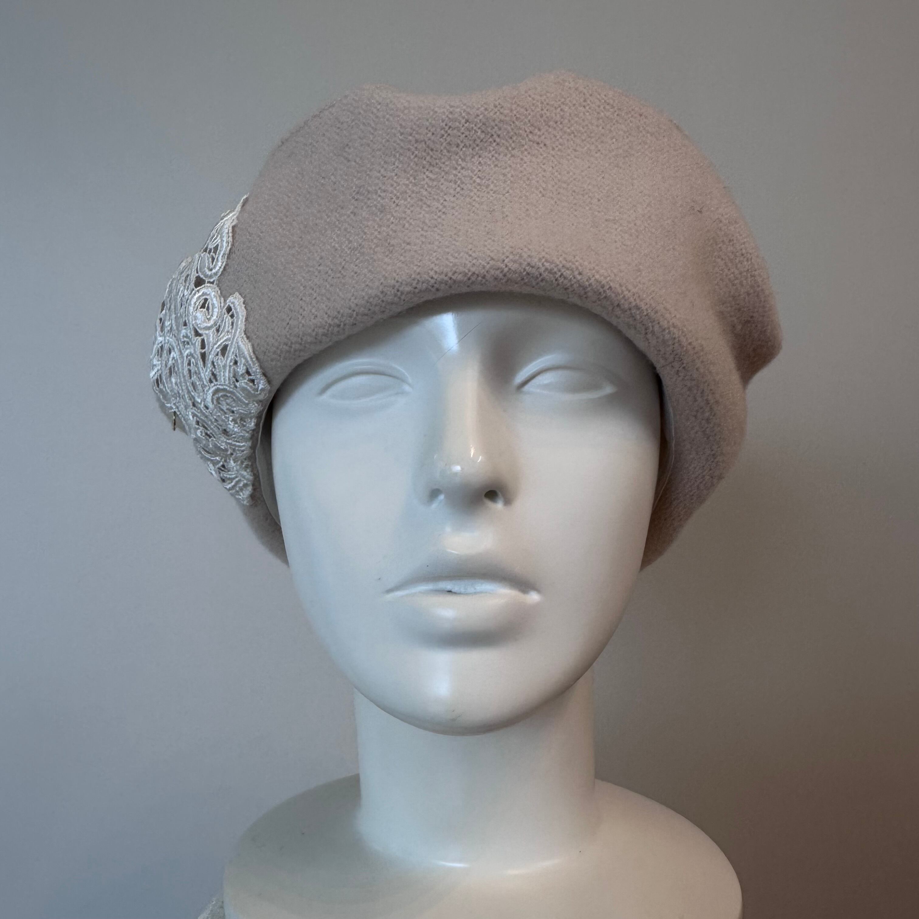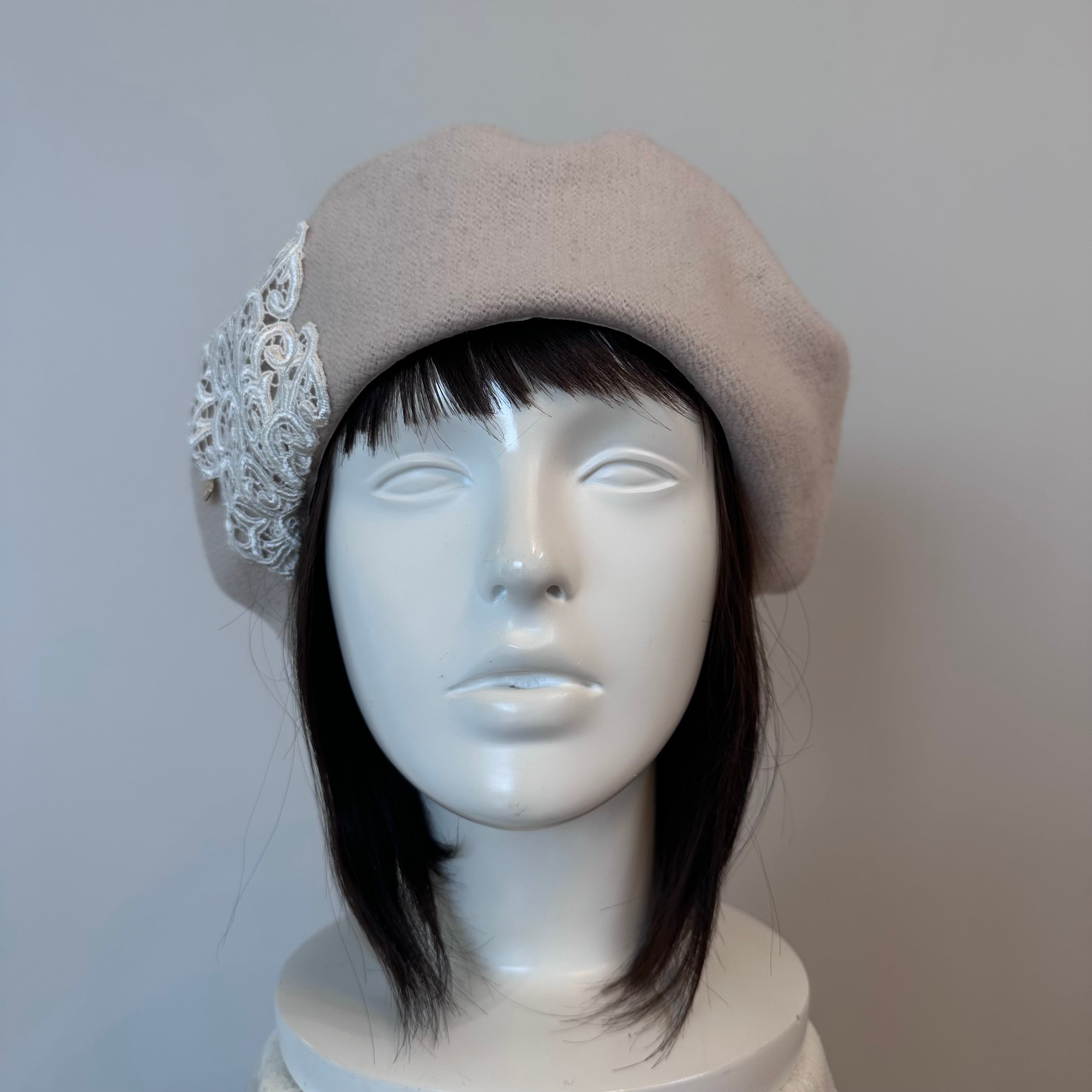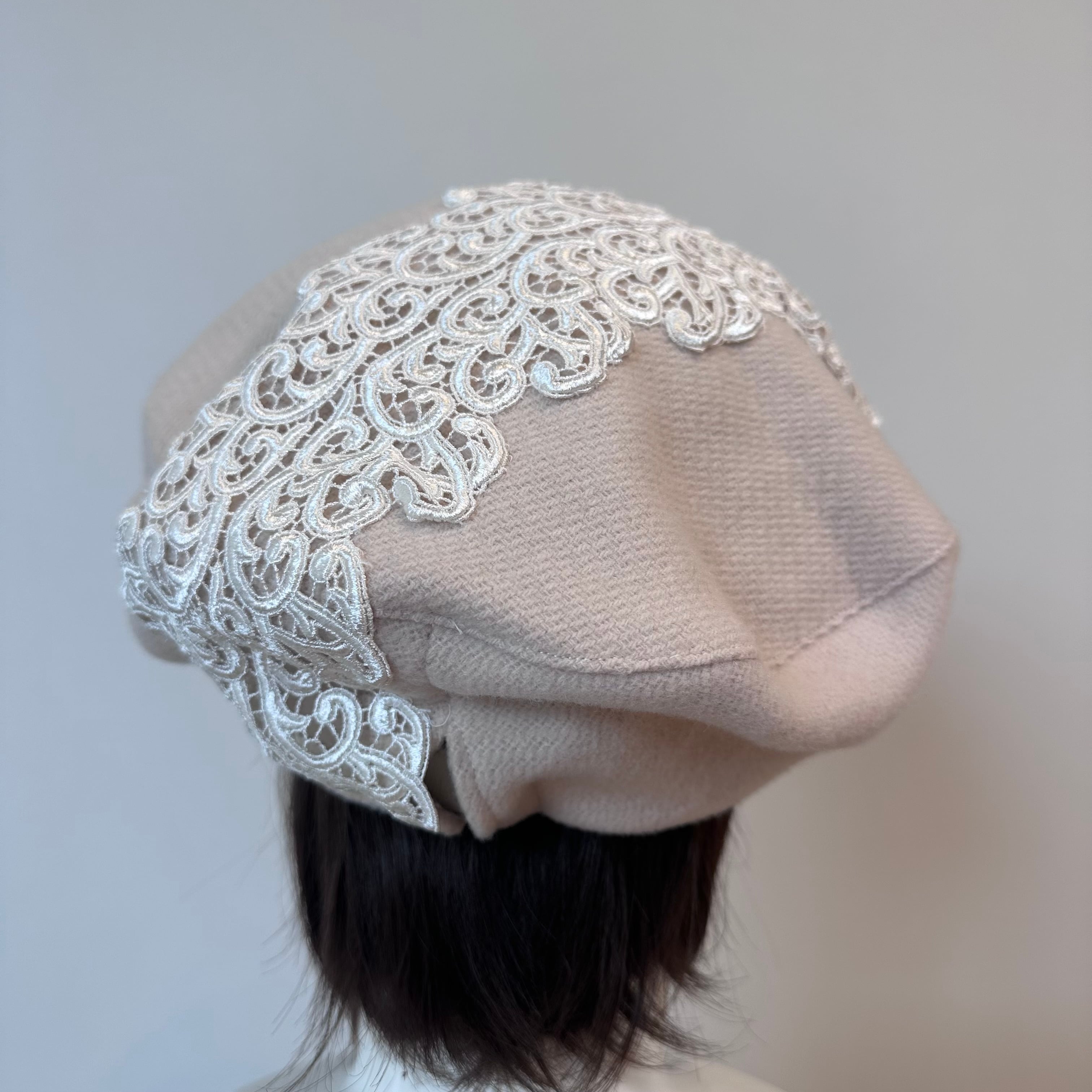 お生地たっぷりベレー帽 ウールベージュ レース付き