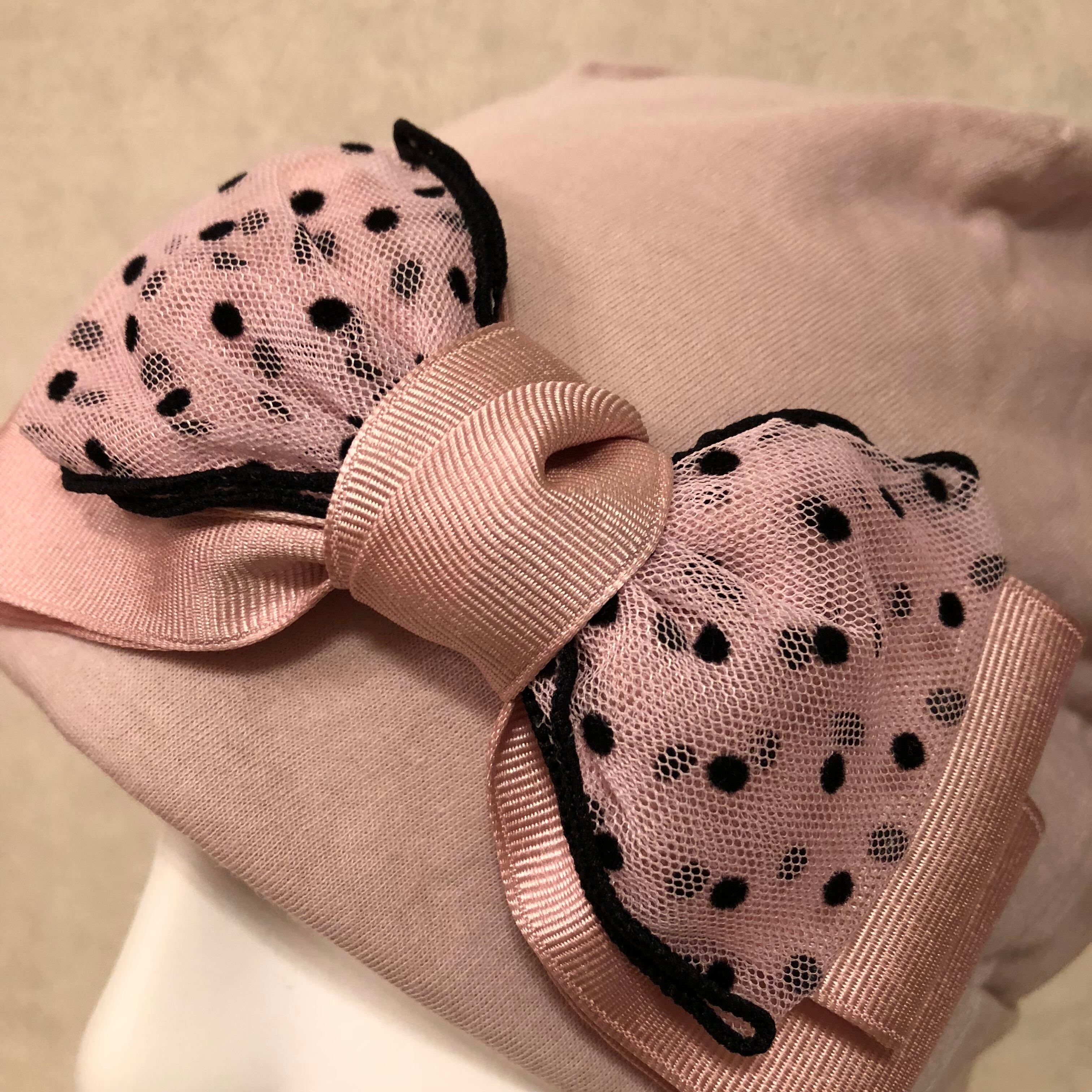 肌触りの良い、伸縮性のあるコットン100%のお生地で作ったお帽子に、ドットチュールリボンを付けた素敵なデザインです。