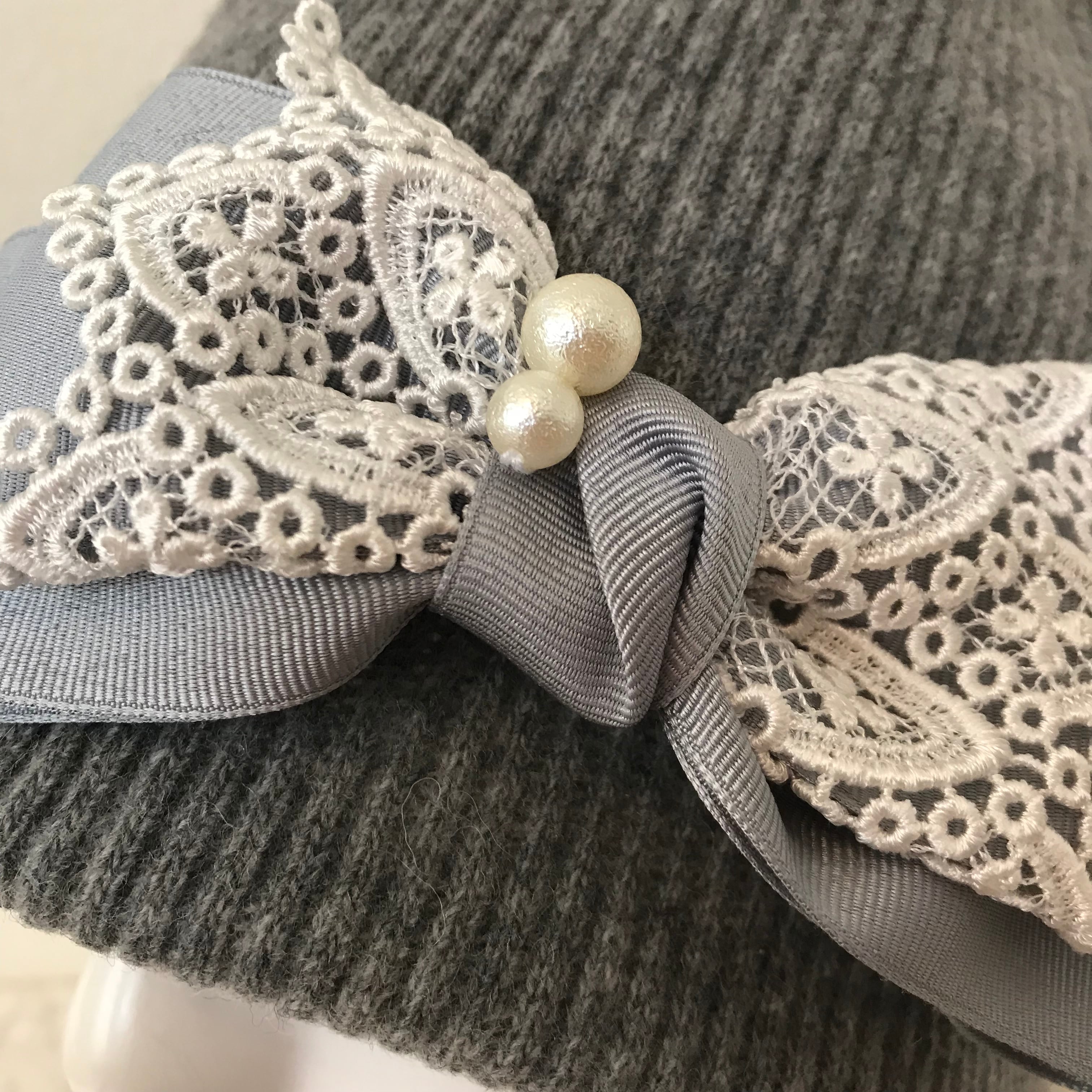 コットンパールとレースのケア帽子 ウール薄いグレー