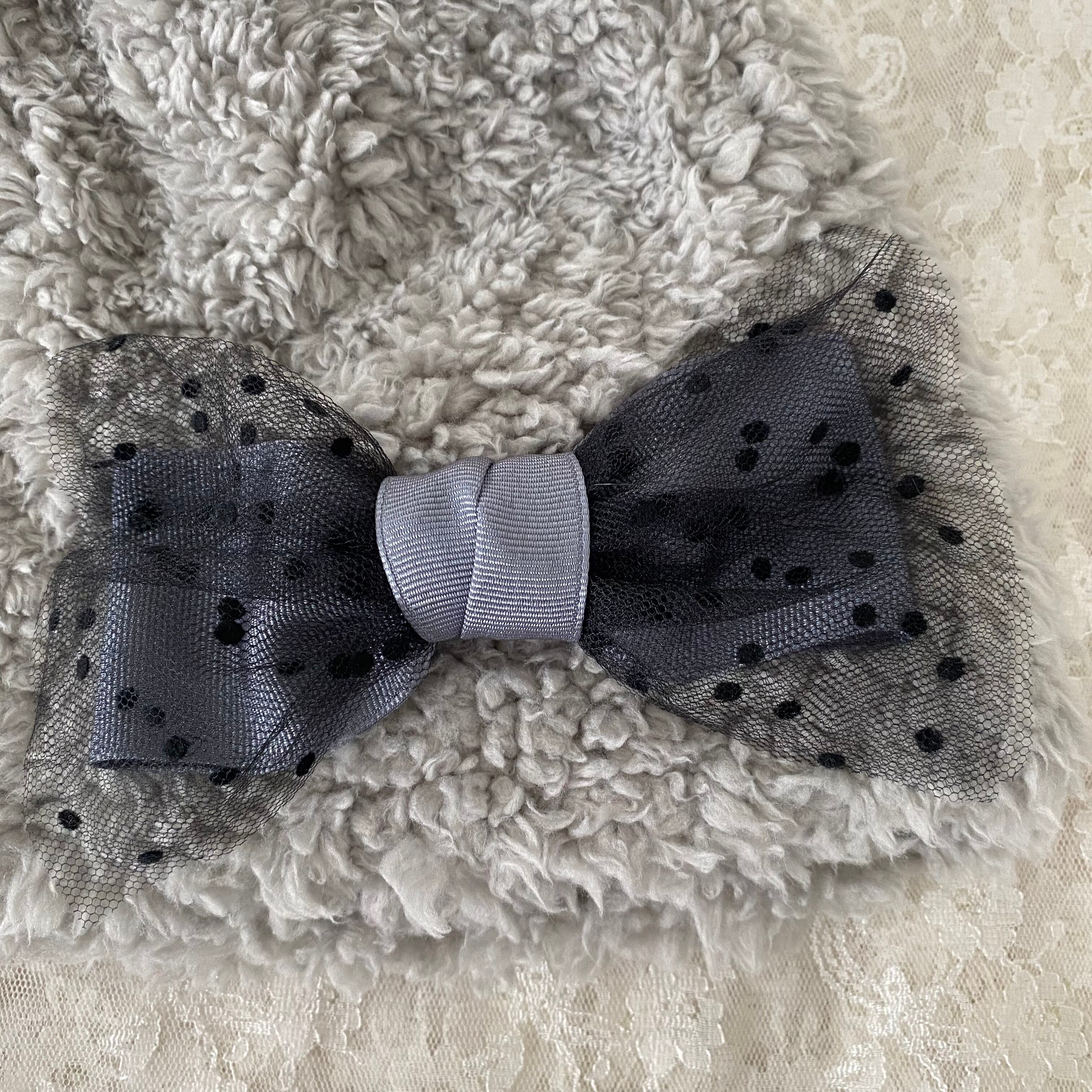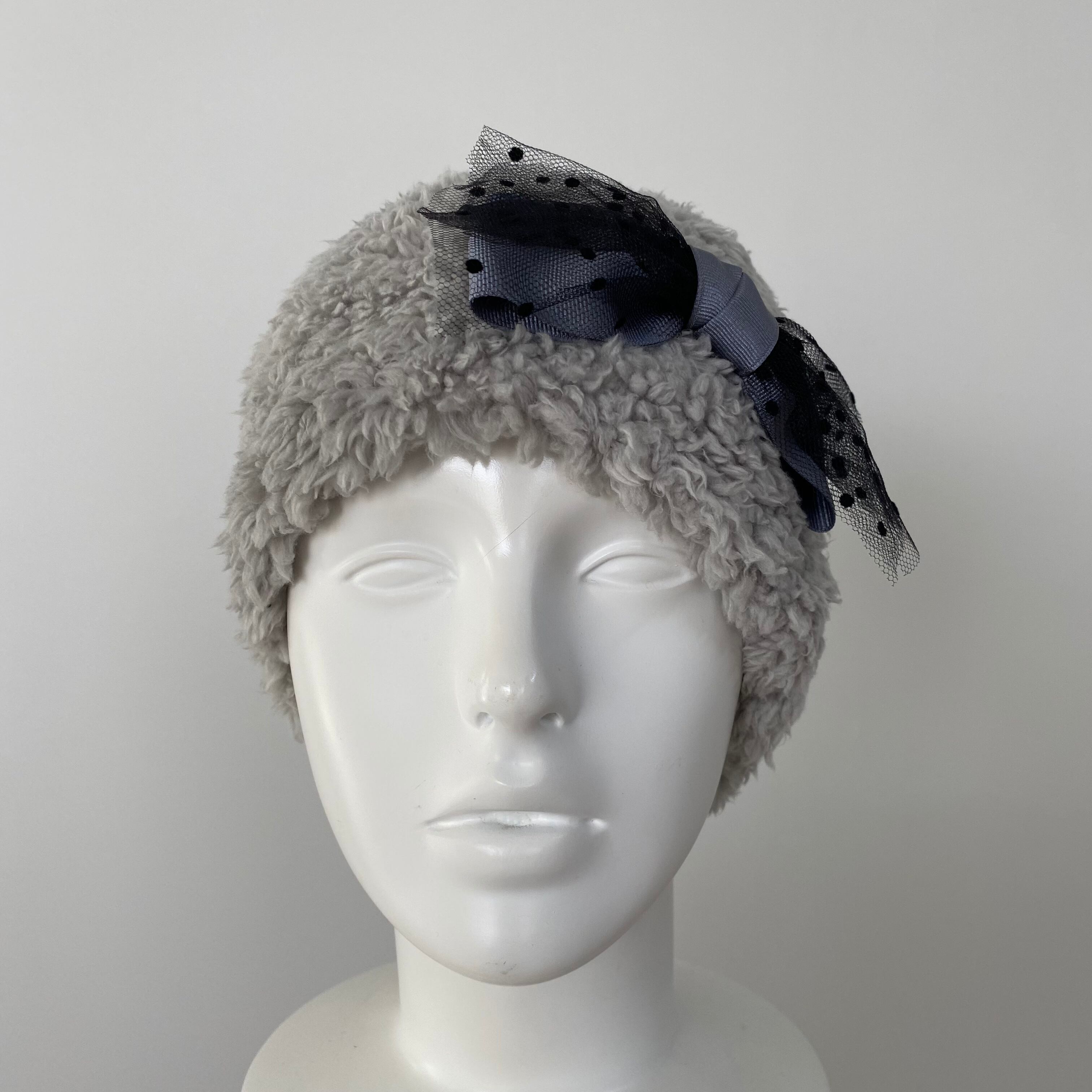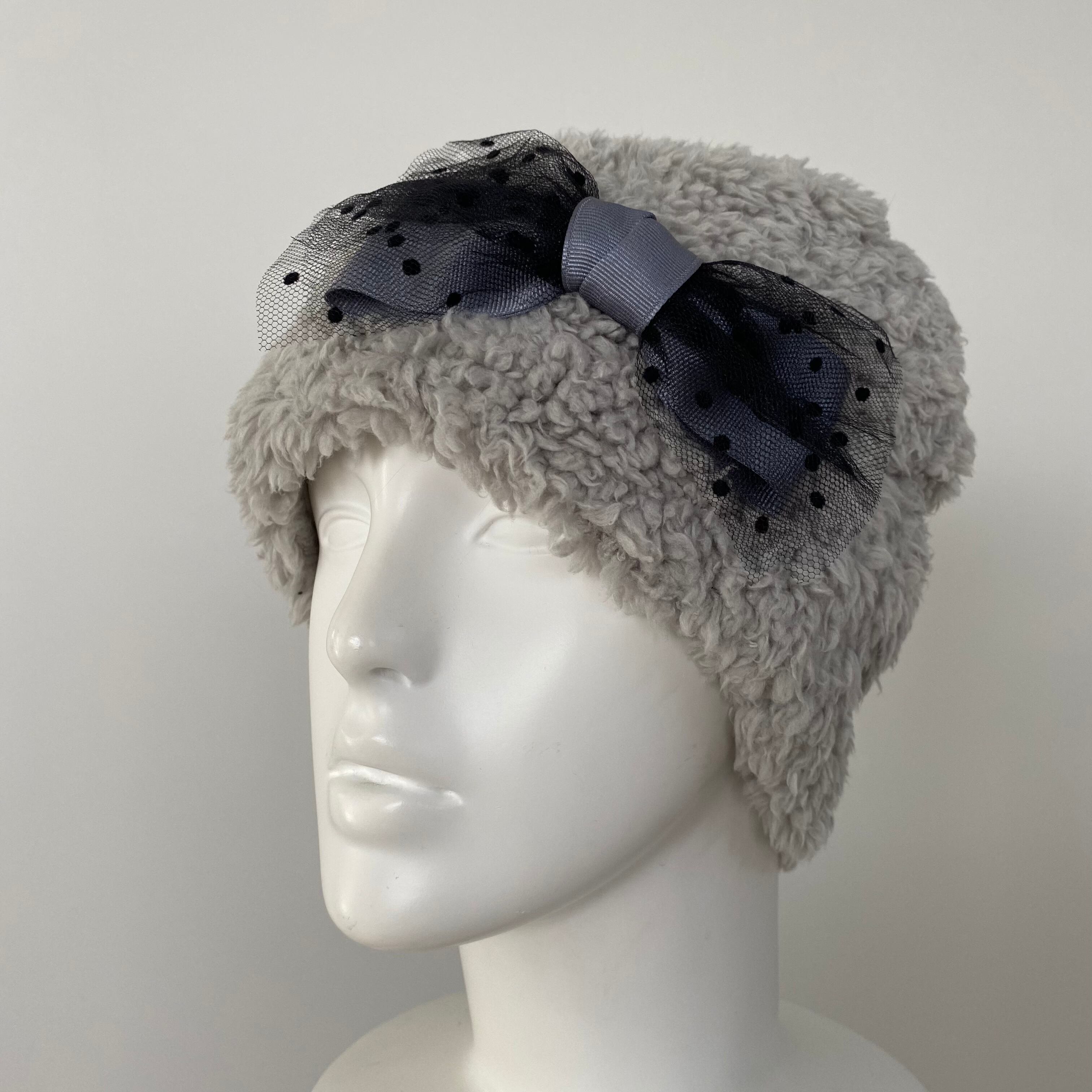 暖かいフワフワのファー生地で作ったケア帽子にリボンにチュールを重ねた可愛いデザインです。