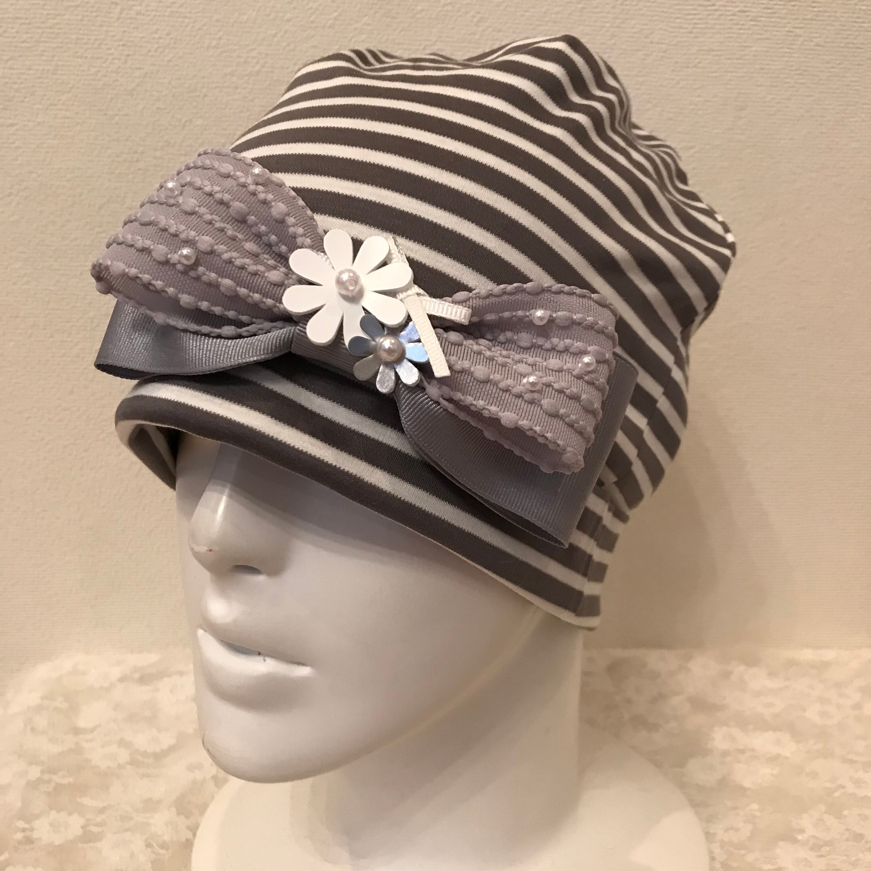 お花とポップコーンリボンのケア帽子グレーボーダー