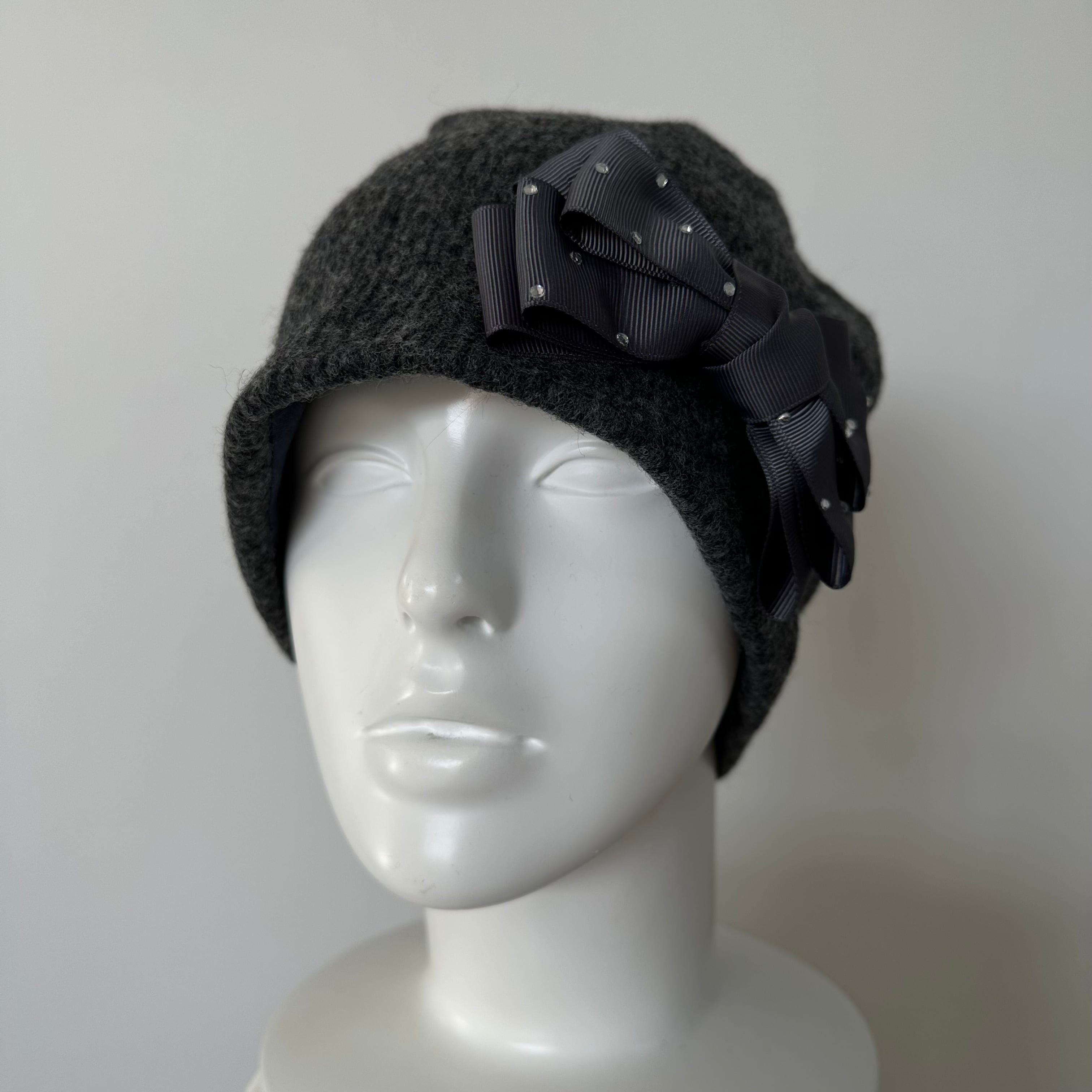 ラインストーンリボンのケア帽子 グレーニット