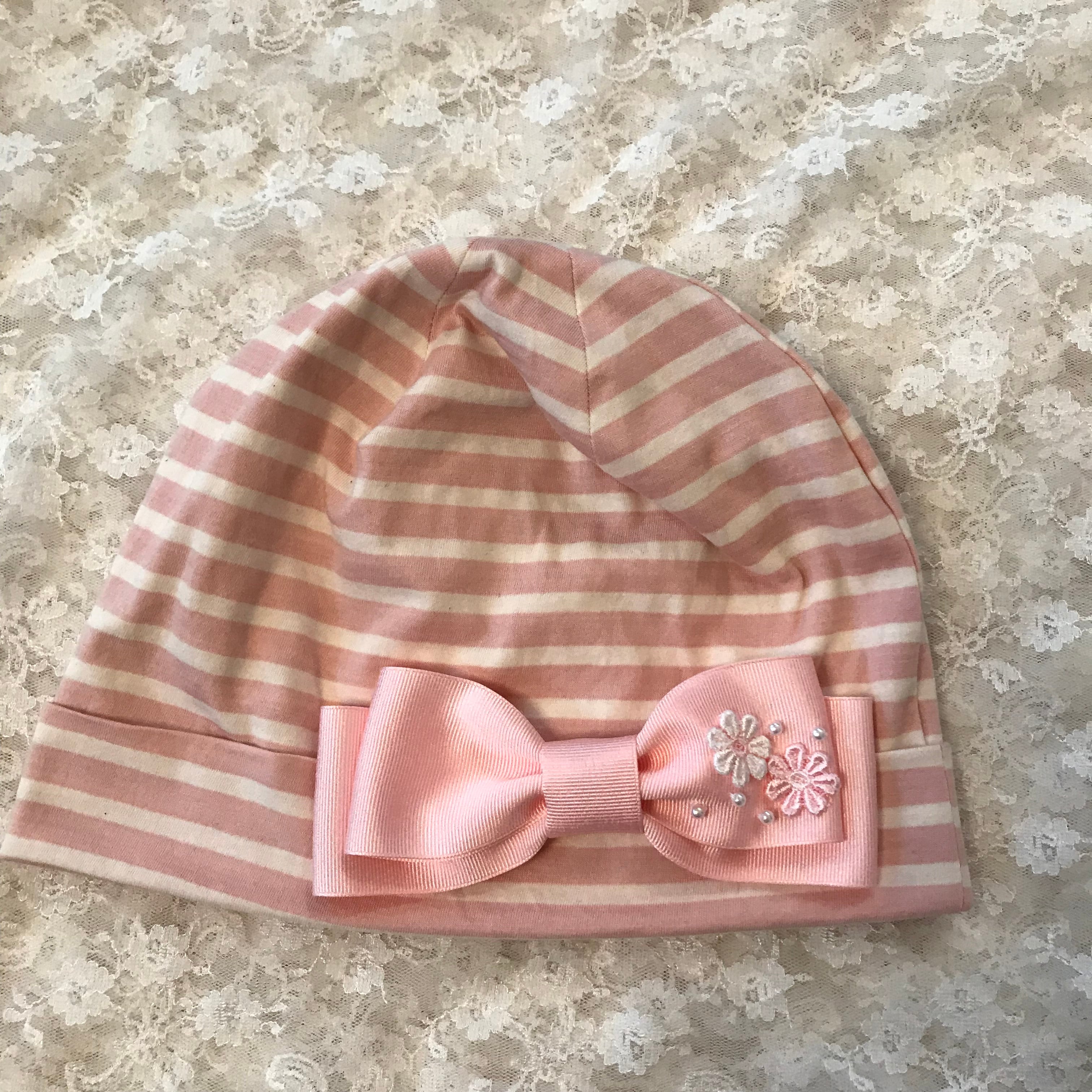 片側お花とパールのケア帽子 ピンク白ボーダー