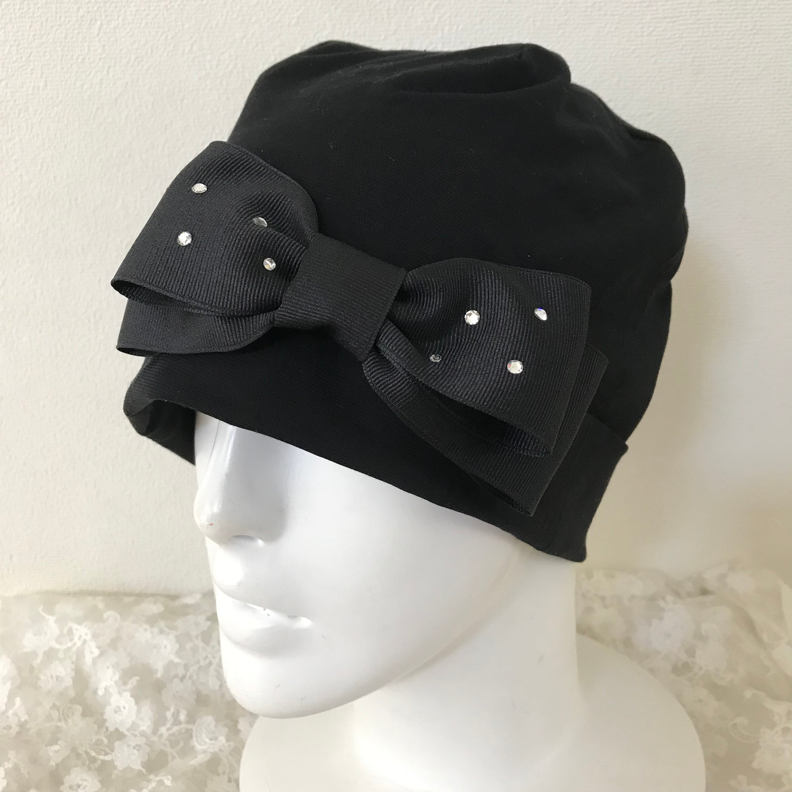肌触りの良い、伸縮性のあるお生地で作ったお帽子に、スワロフスキー付きグログランリボンを付けた素敵なデザインです。