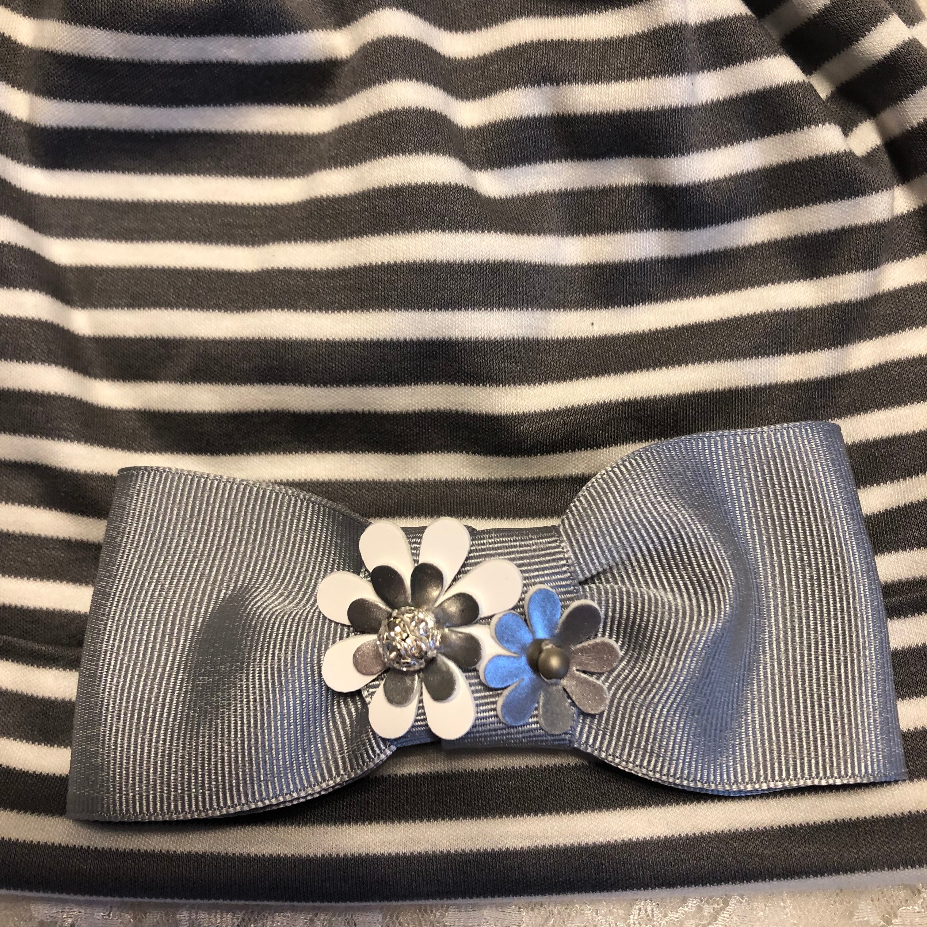 肌触りの良い、伸縮性のあるお生地で作ったお帽子に、おリボンとお花を付けた素敵なデザインです。
