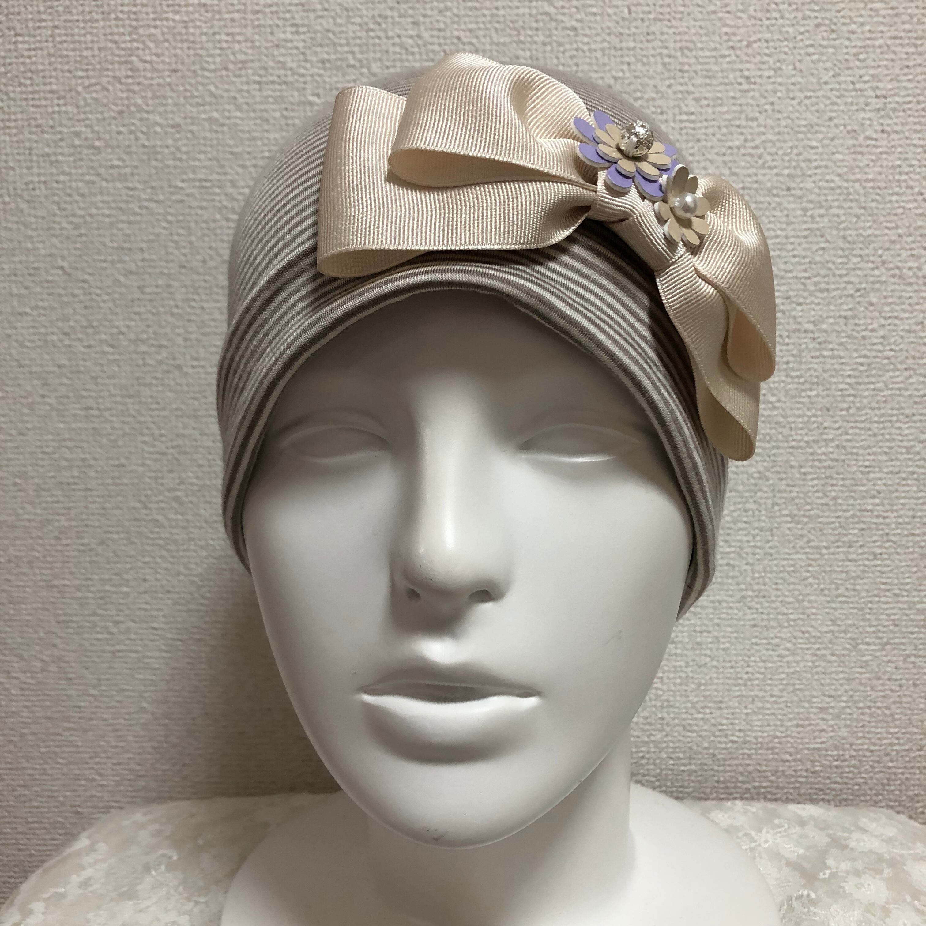 おリボンとお花のケア帽子 ベージュ系ボーダー