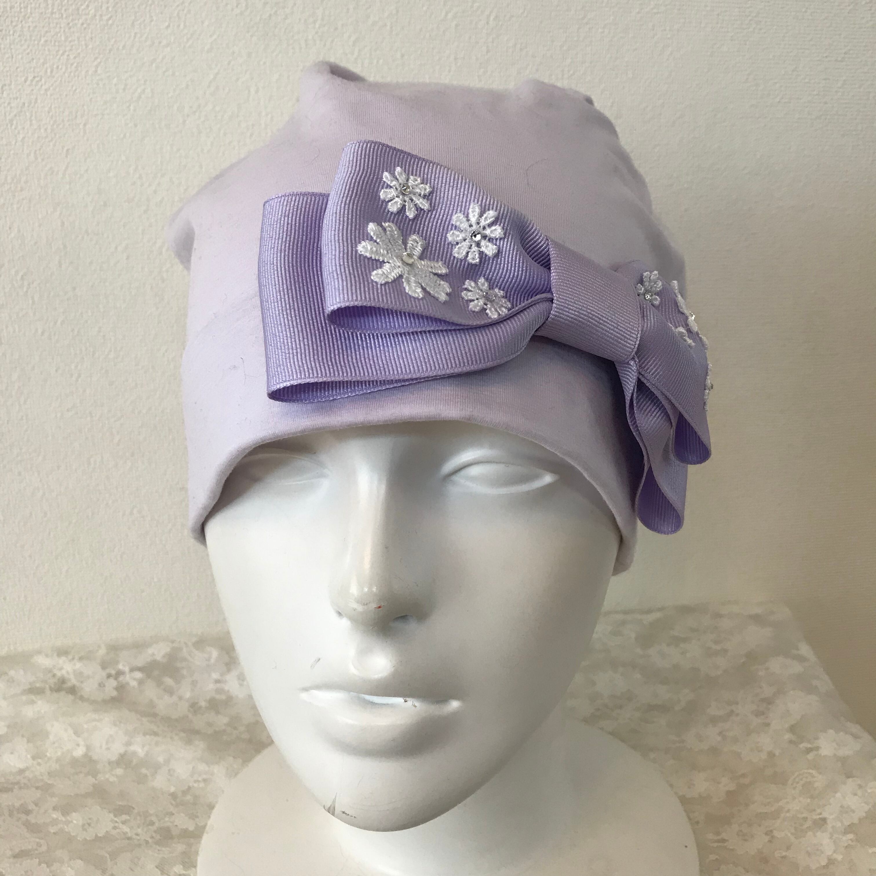 お花モチーフとリボンのケア帽子 ラベンダー