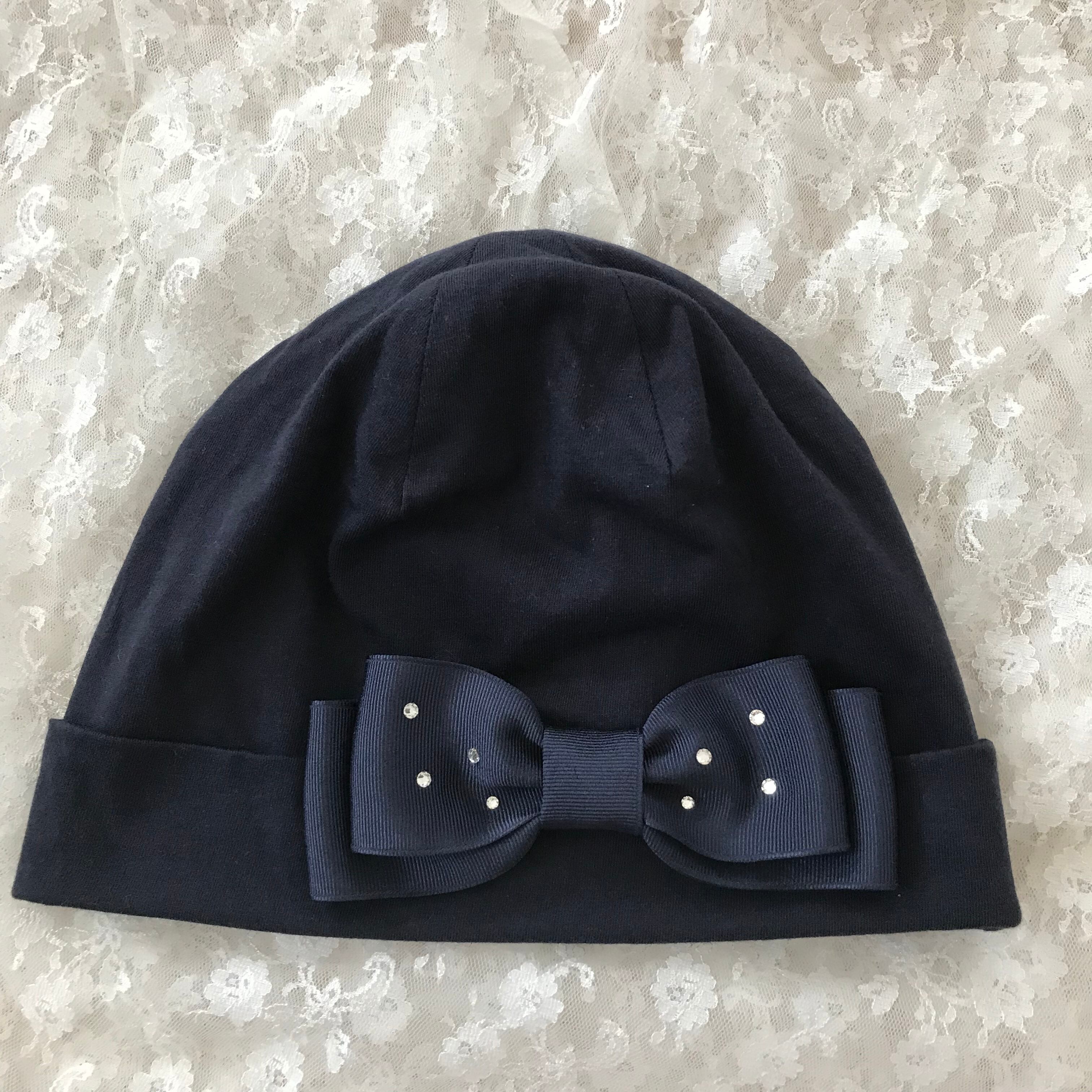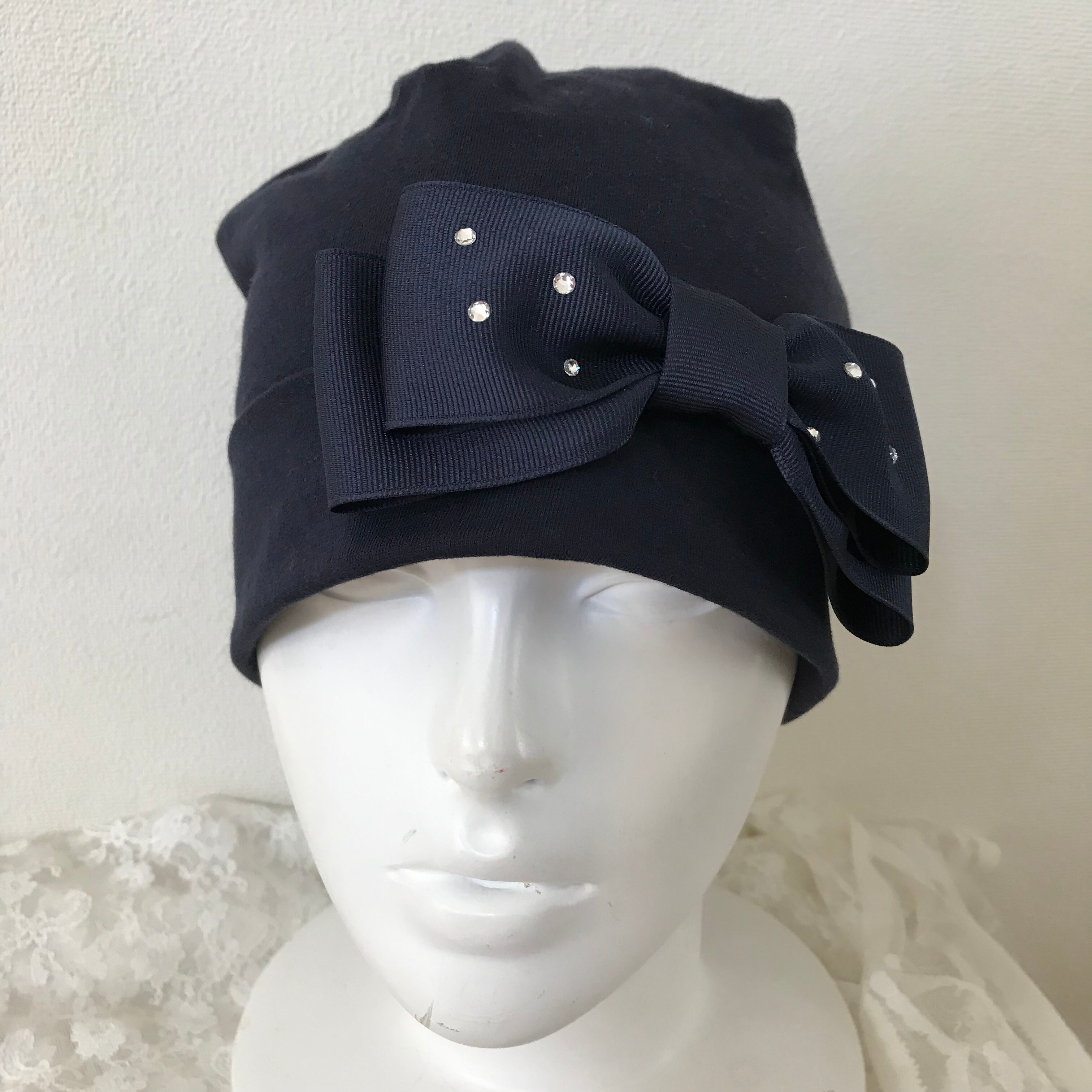 肌触りの良い、伸縮性のあるお生地で作ったお帽子に、スワロフスキー付きグログランリボンを付けた素敵なデザインです。