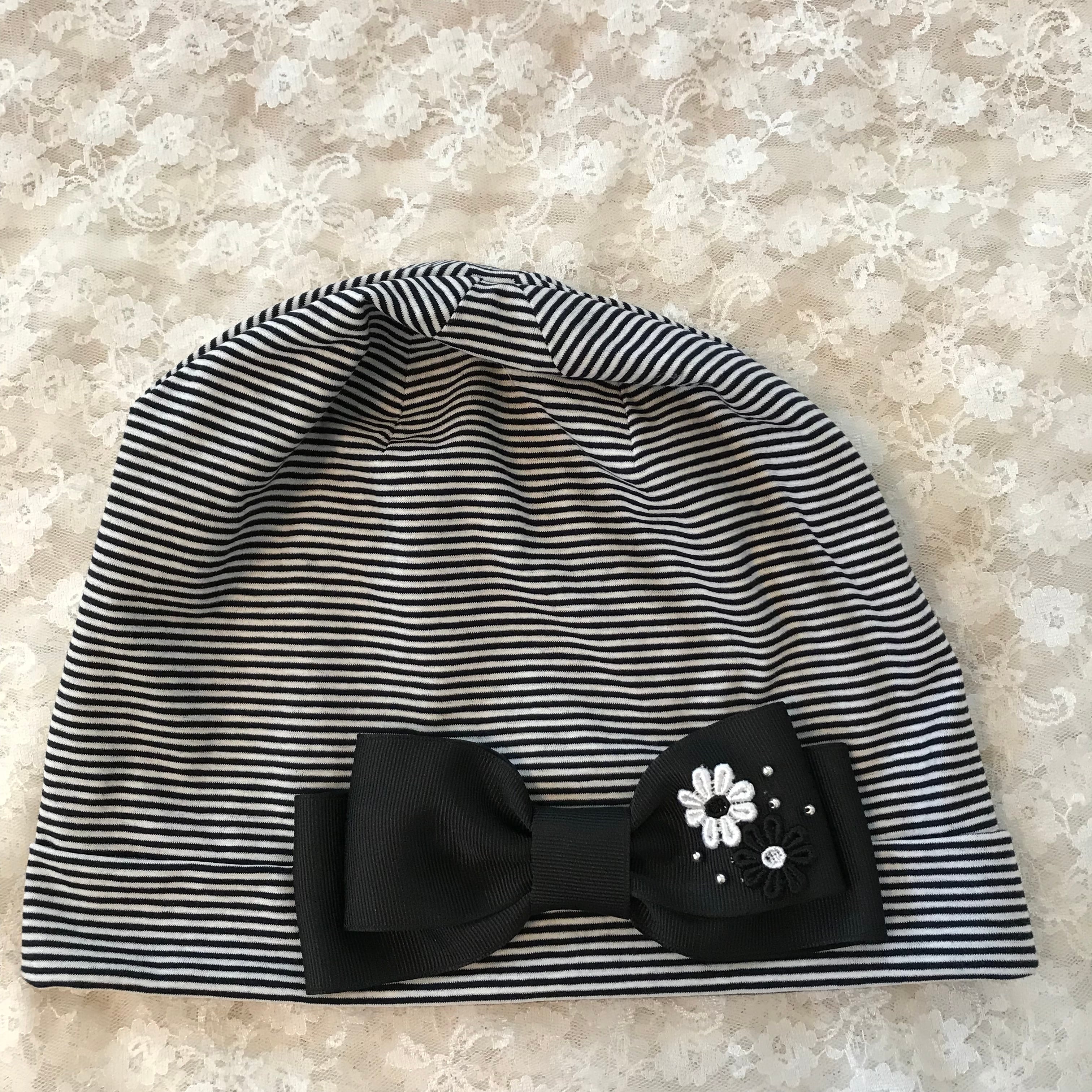 片側お花とリボンのケア帽子 白黒細ボーダー