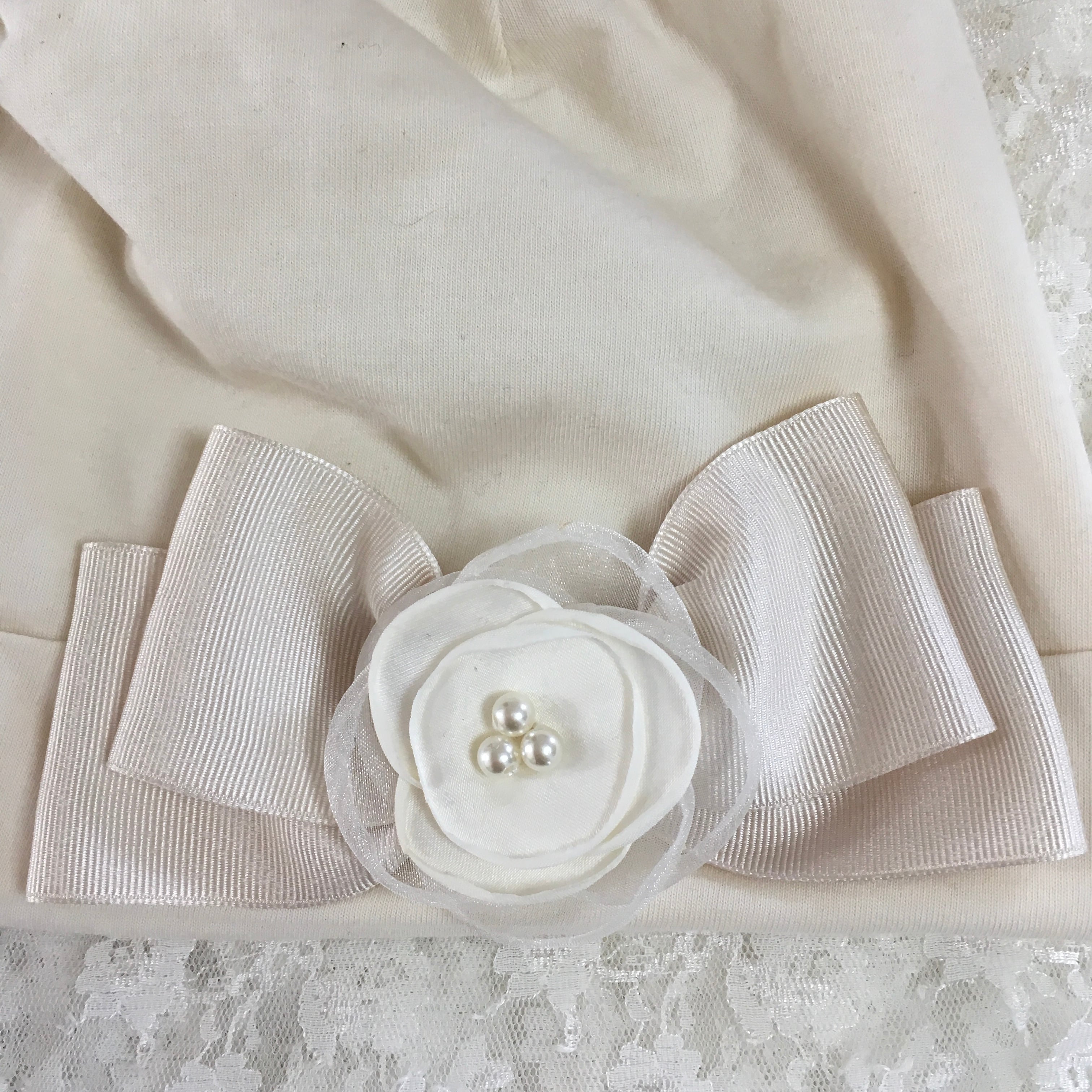 肌触りの良い、伸縮性のあるお生地で作ったお帽子に、おリボンとお花を付けた素敵なデザインです。