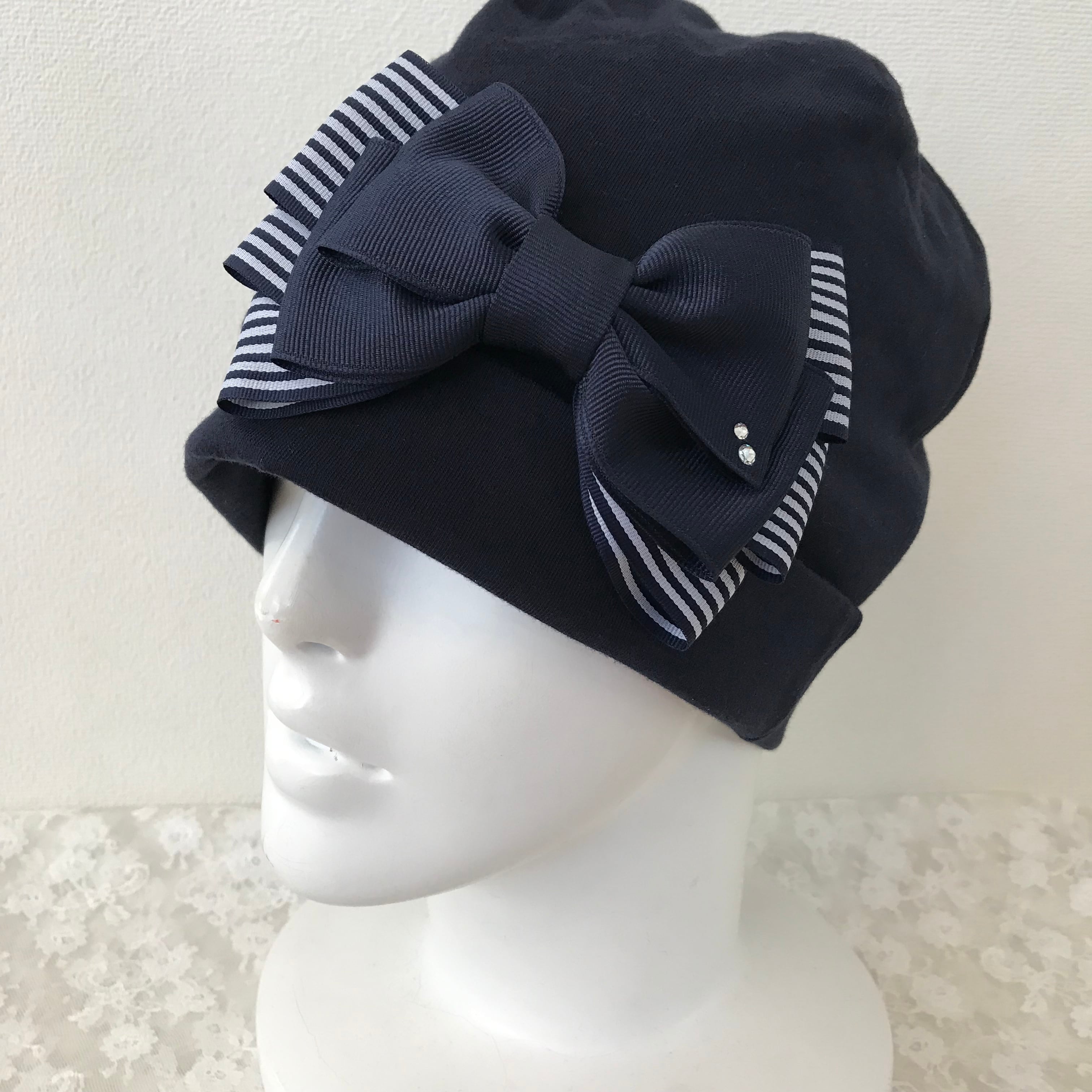 スワロフスキーとストライプリボンのケア帽子 ネイビー