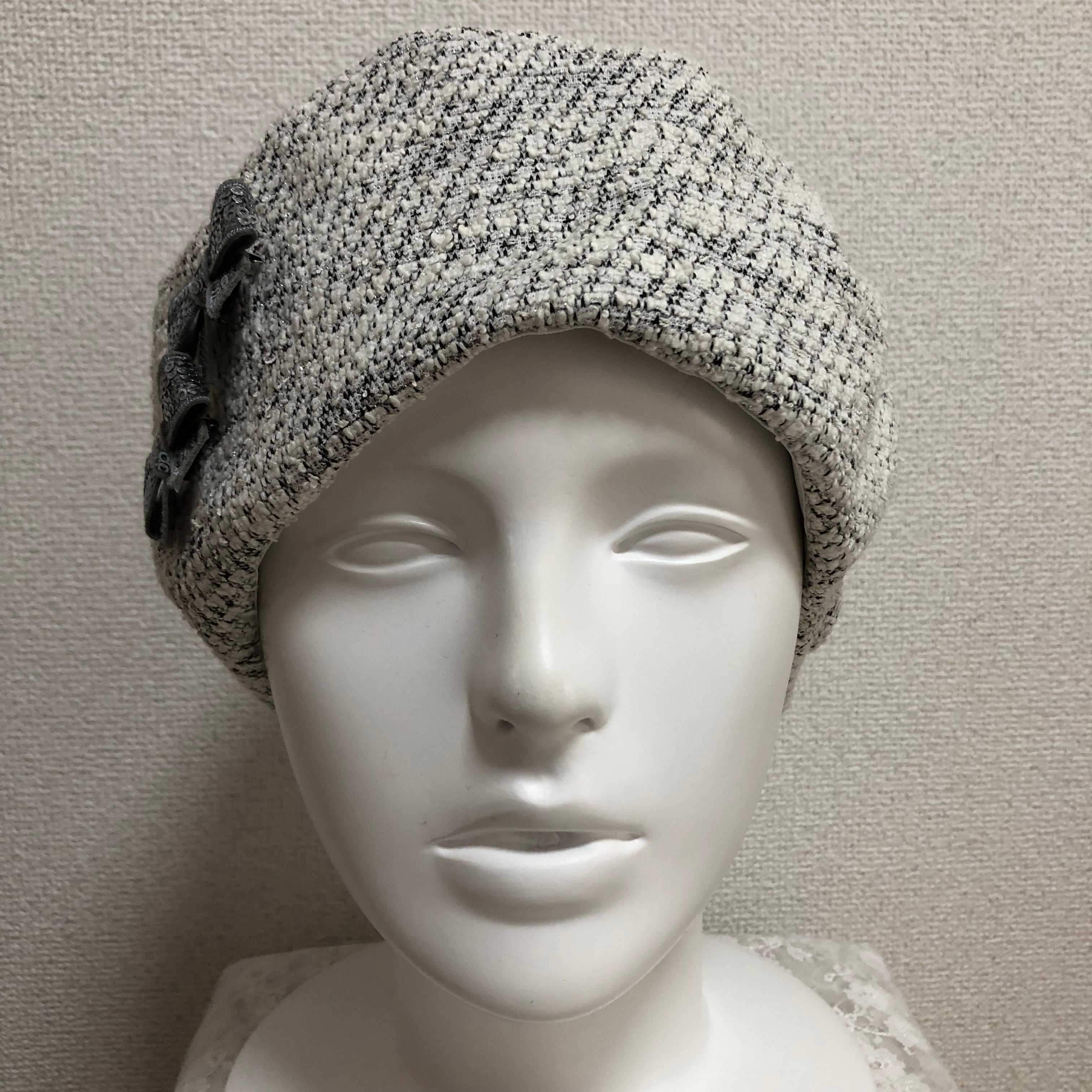 お生地たっぷりベレー帽 ツィードシルバーラメ おリボンシルバー