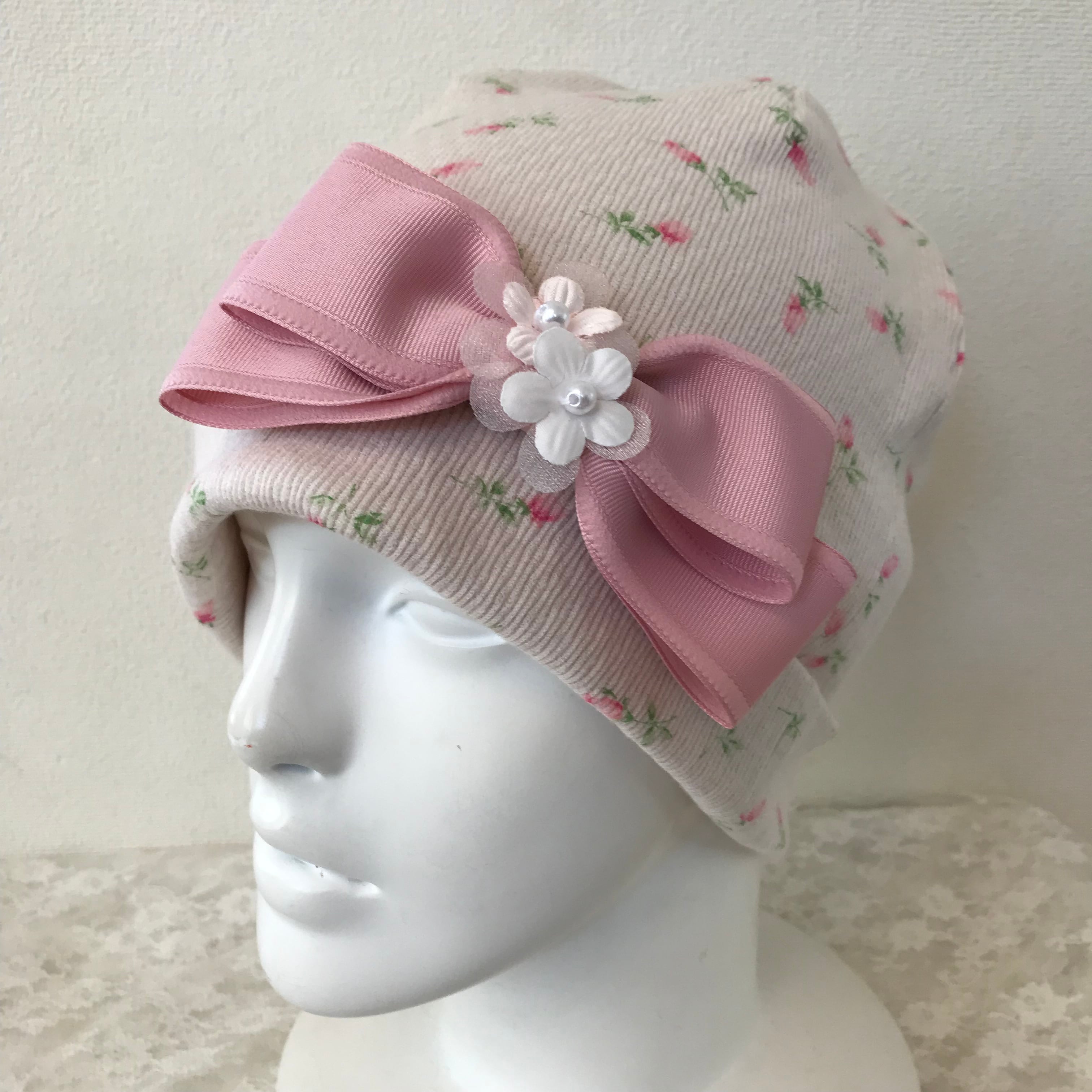 お花と縁取りリボンのケア帽子 小花柄ベージュ
