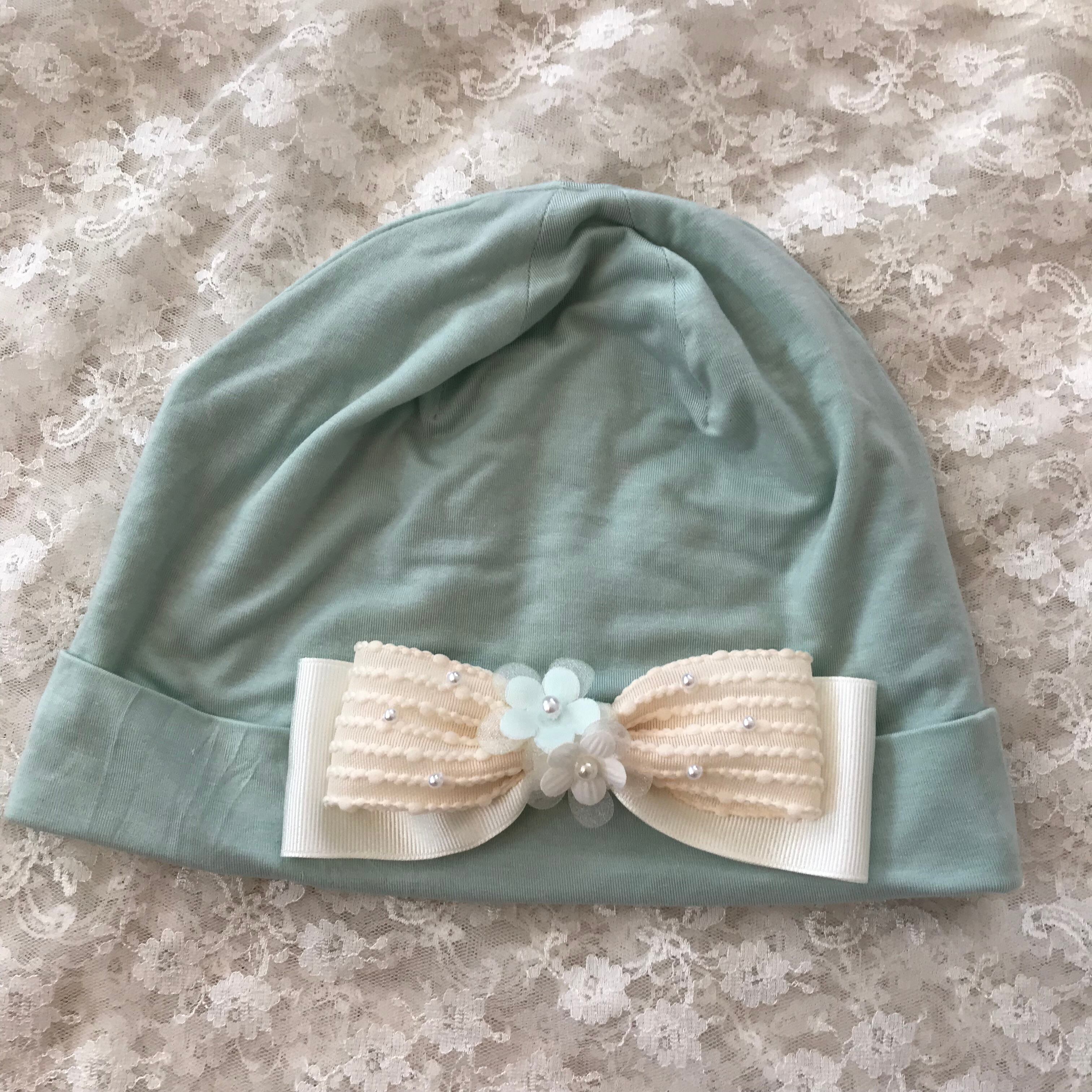 肌触りの良い、伸縮性のあるお生地で作ったお帽子に、お花付きポップコーンリボンとグログランリボンを付けた素敵なデザインです。