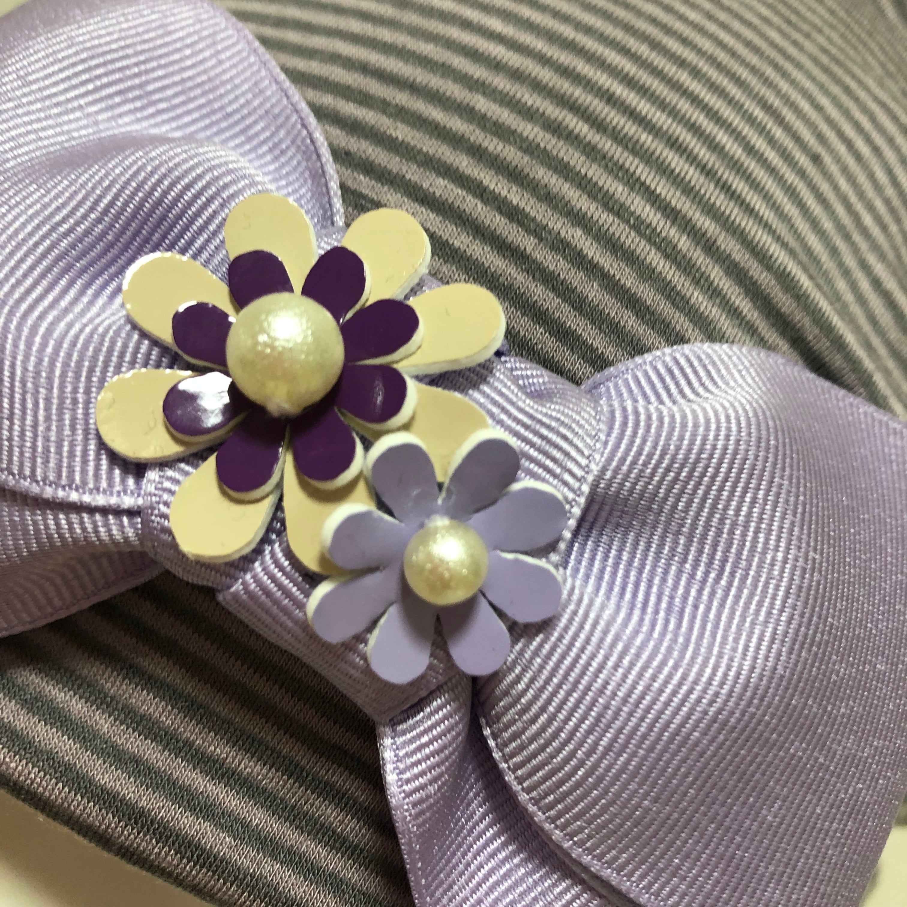 肌触りの良い、伸縮性のあるお生地で作ったお帽子に、おリボンとお花を付けた素敵なデザインです。