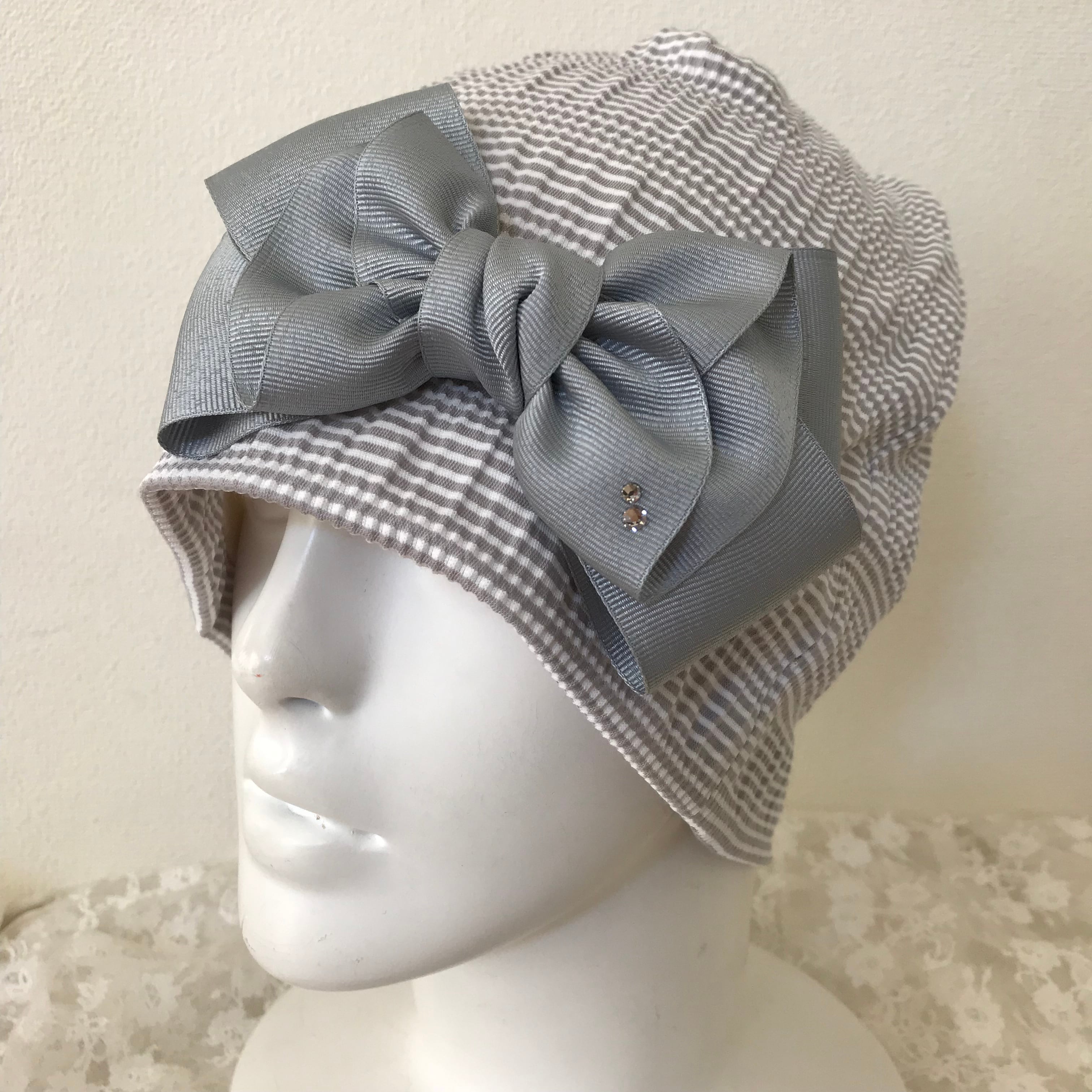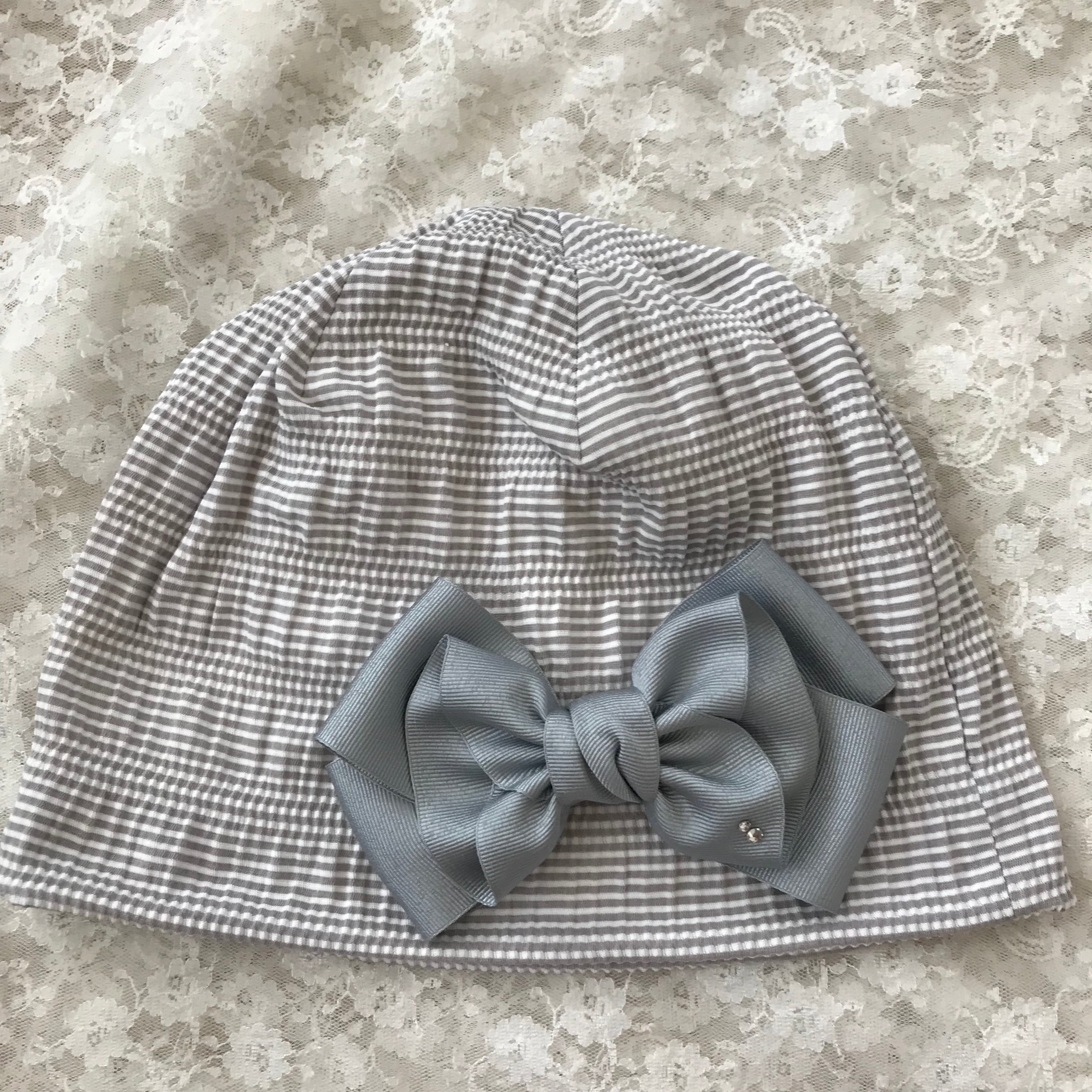 スワロフスキー付きレディリボンのケア帽子 シャーリング グレー白1