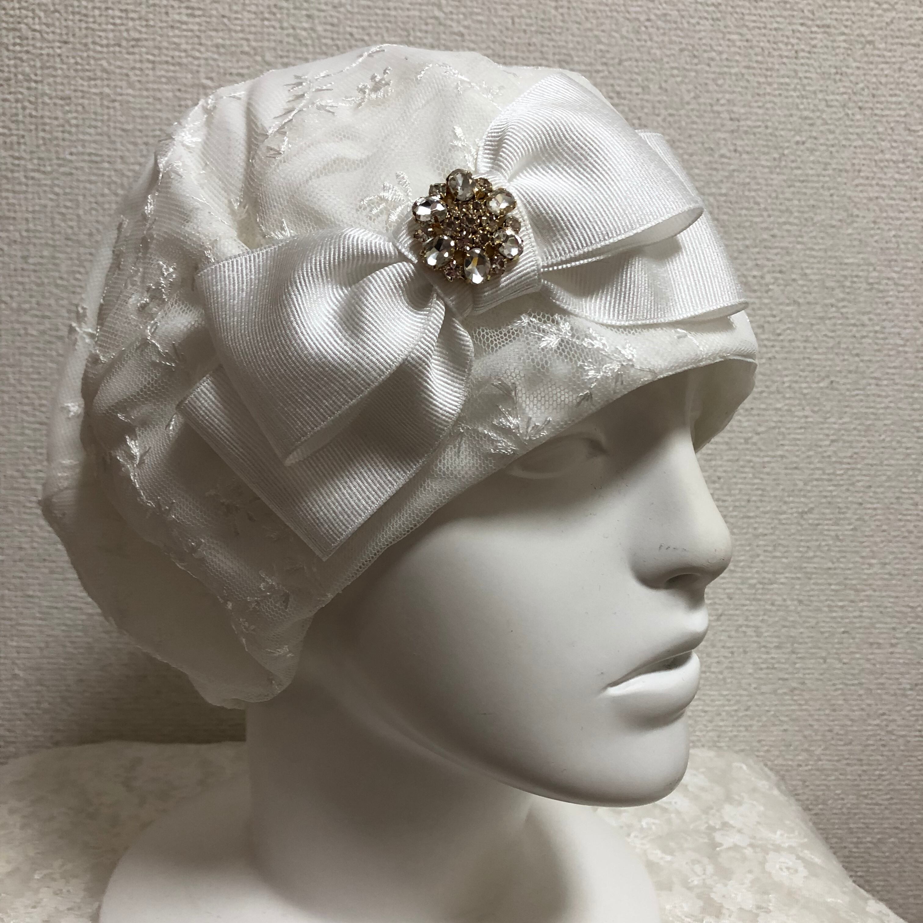 そのお帽子にキラキラビジュー付きリボンを付けた素敵なデザインです。