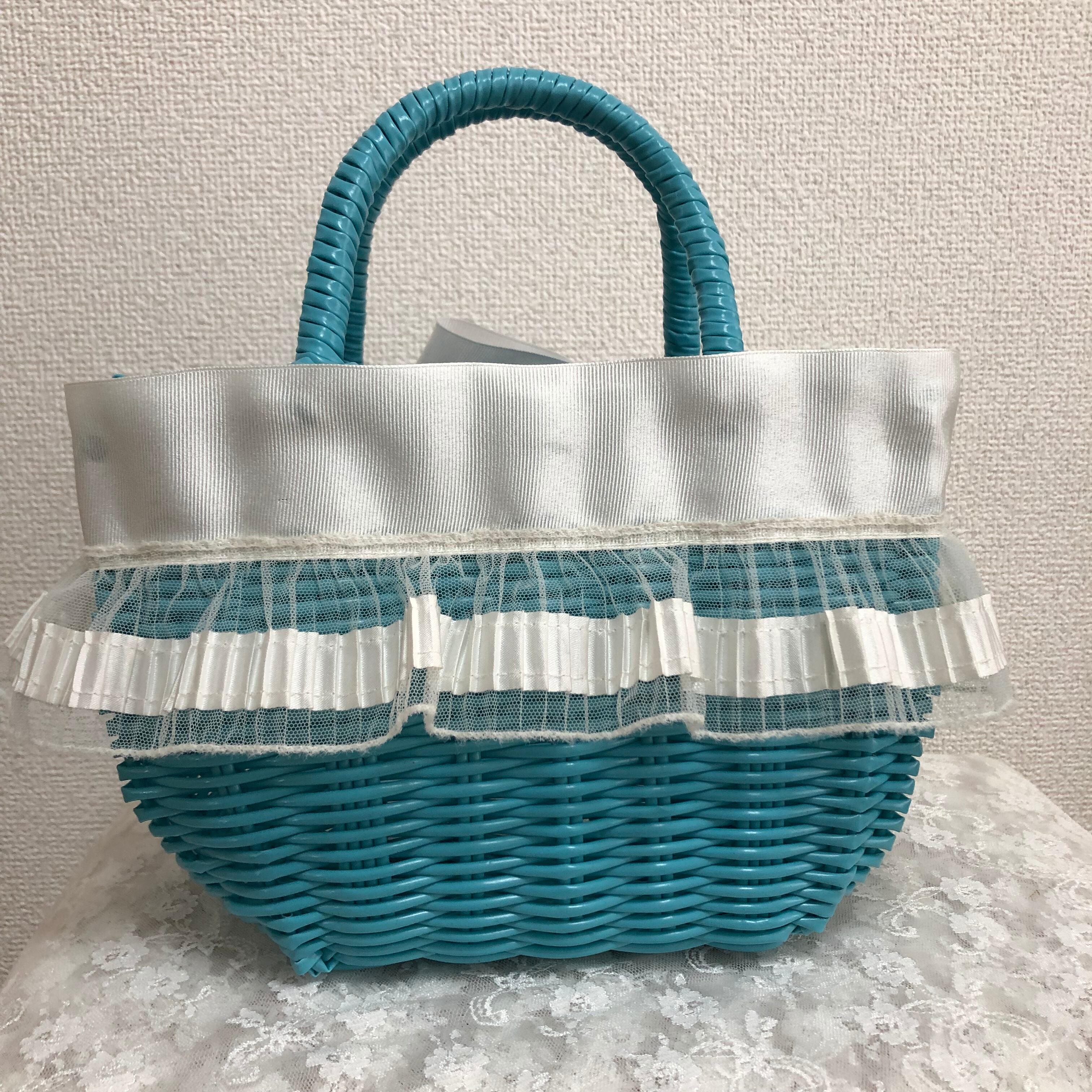 フリルとリボンのカゴバッグ ブルー