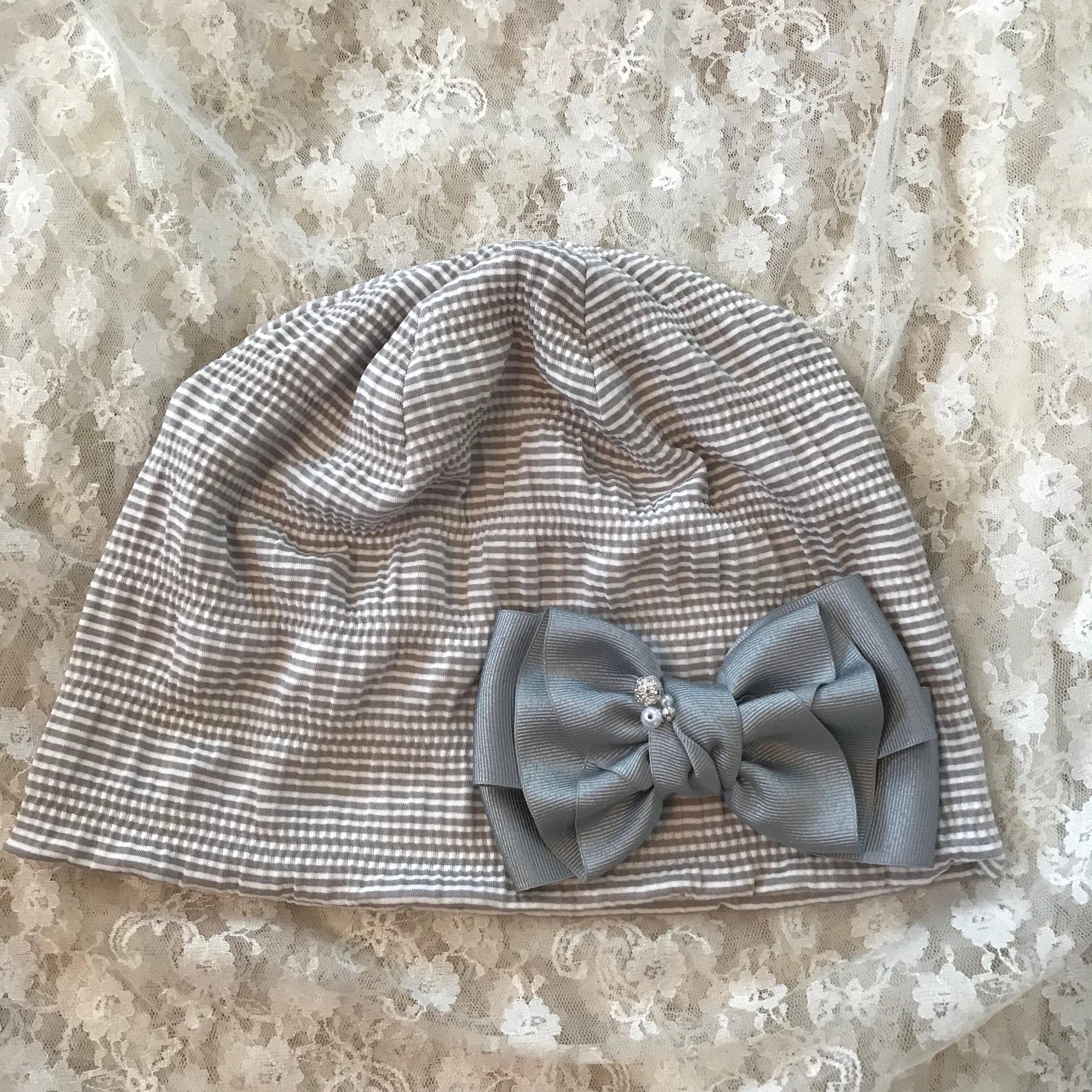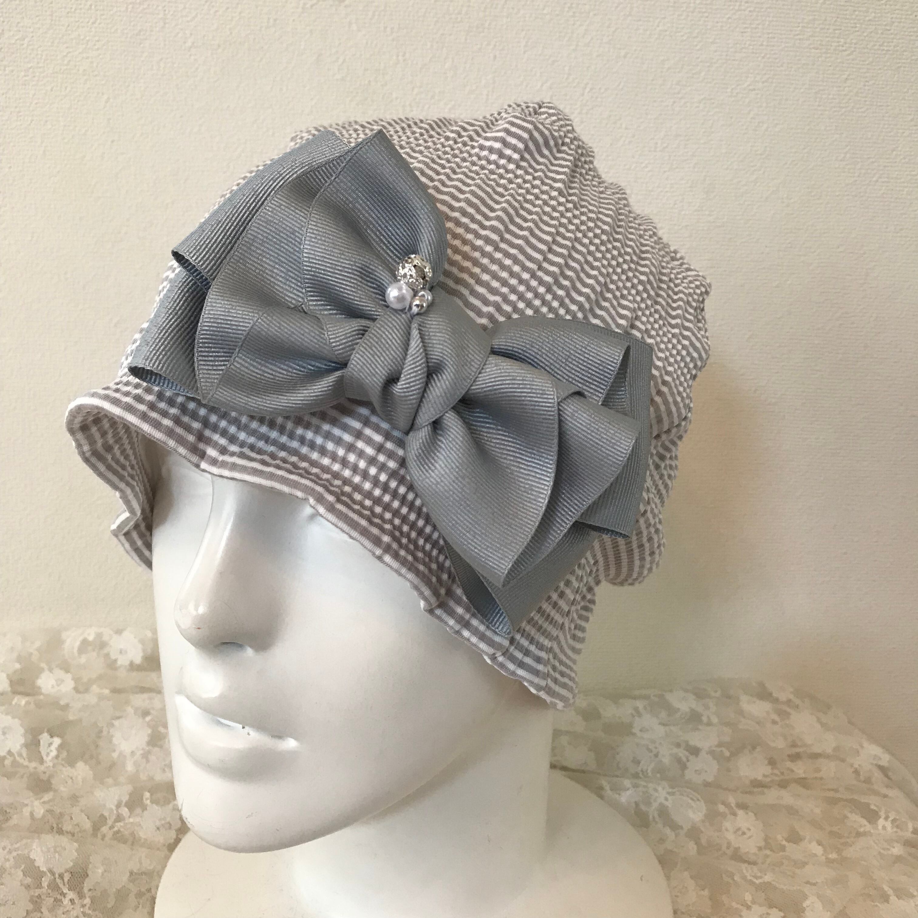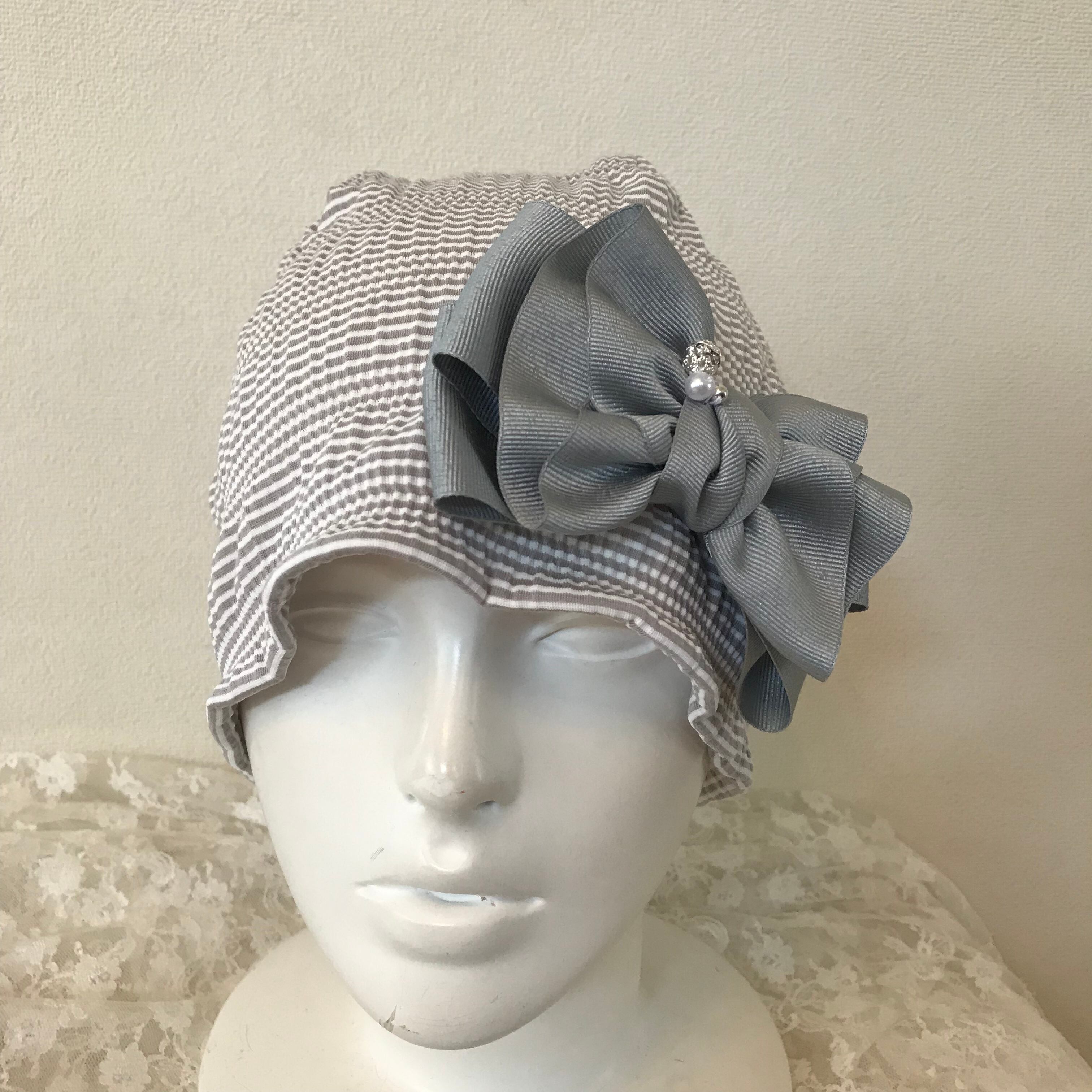 キラキラボールとレディリボンのケア帽子 シャーリンググレー
