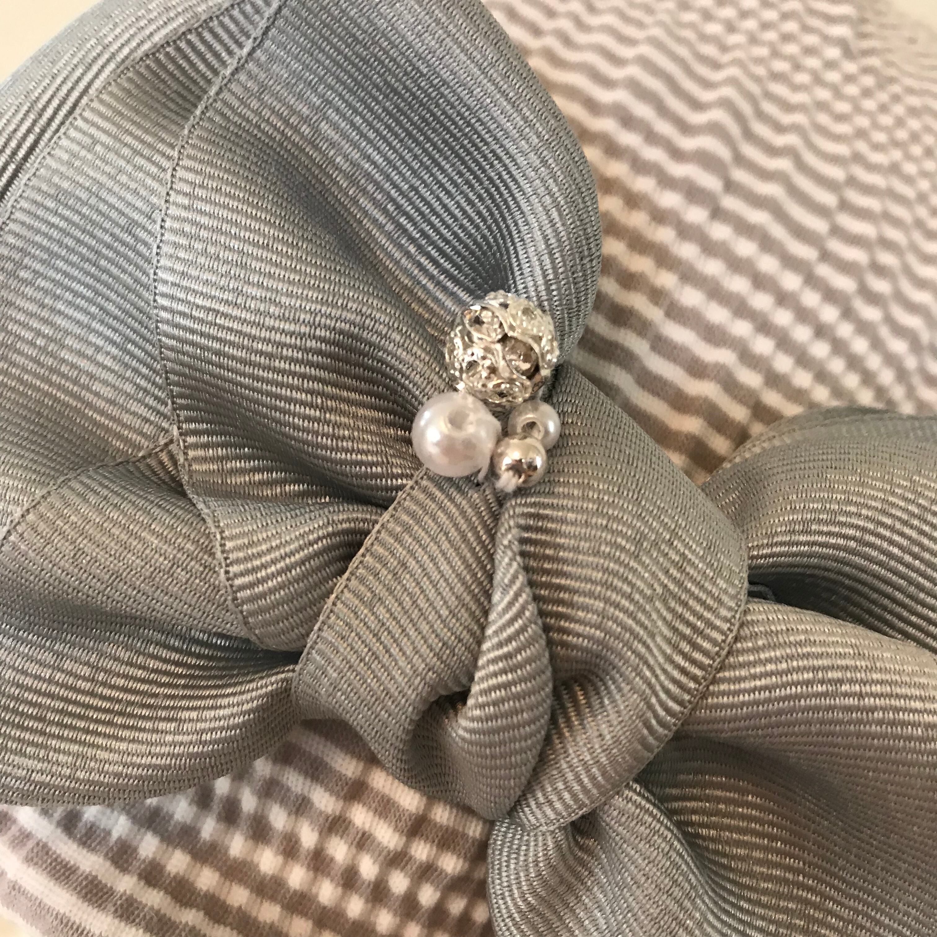 肌触りの良い、伸縮性のあるお生地で作ったお帽子に、キラキラボールとパール付きグログランリボンを付けた素敵なデザインです。