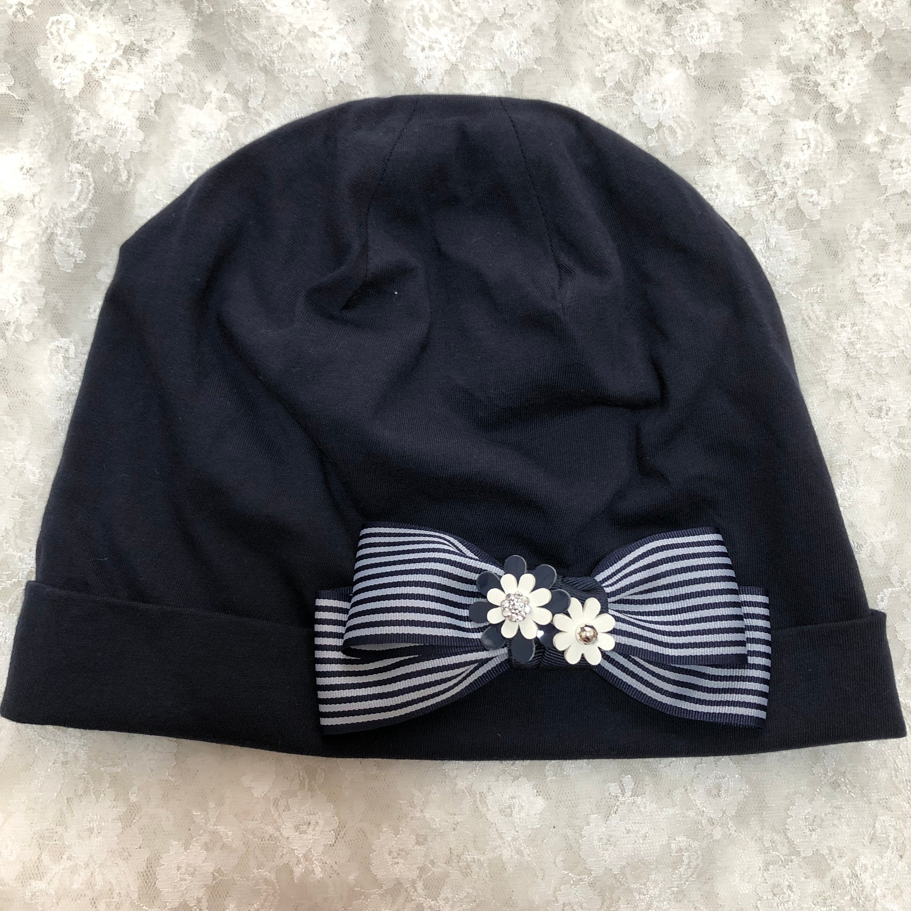 肌触りの良い、伸縮性のあるお生地で作ったお帽子に、お花付きストライプリボンを付けた素敵なデザインです。