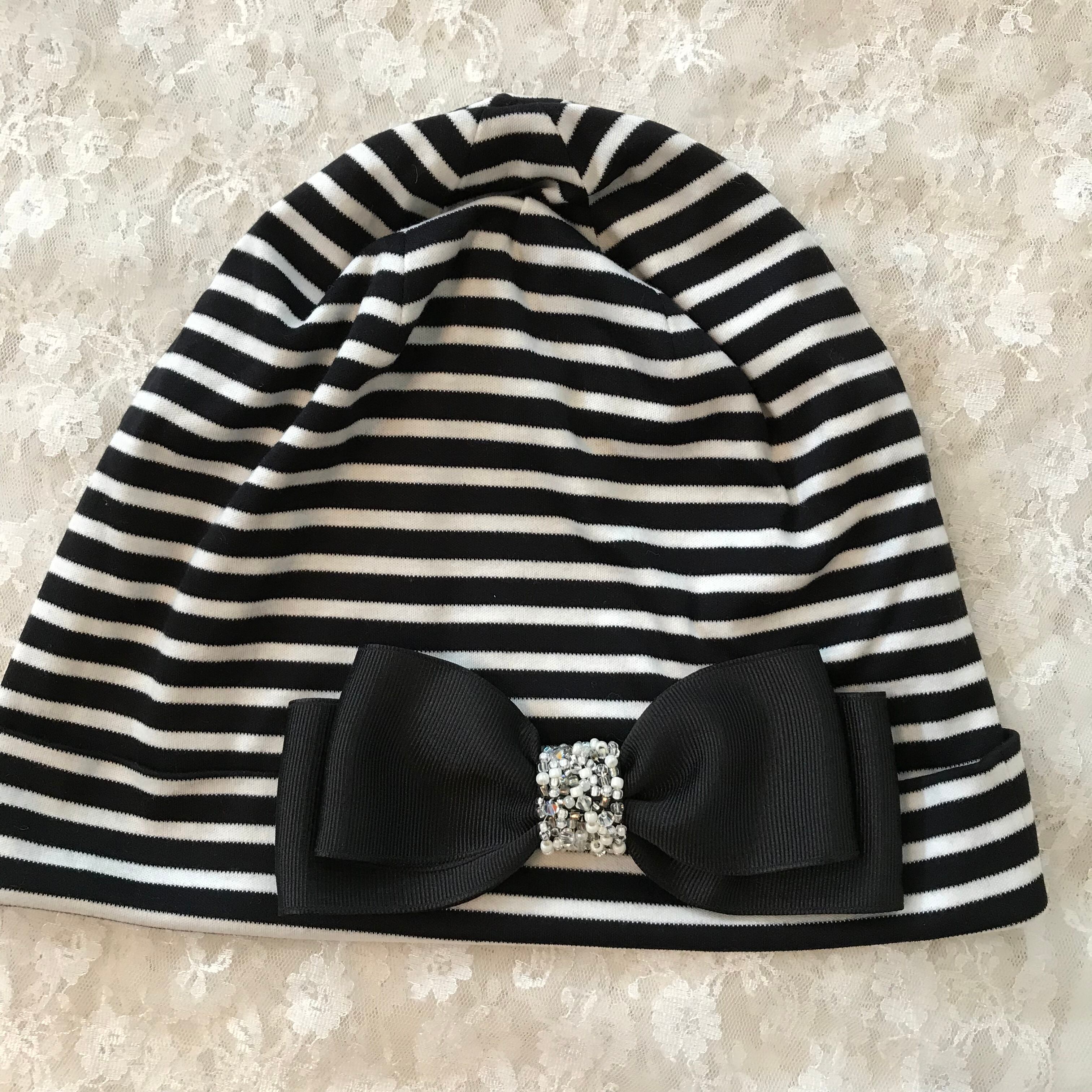 スワロフスキーとビーズのケア帽子 白黒ボーダー28