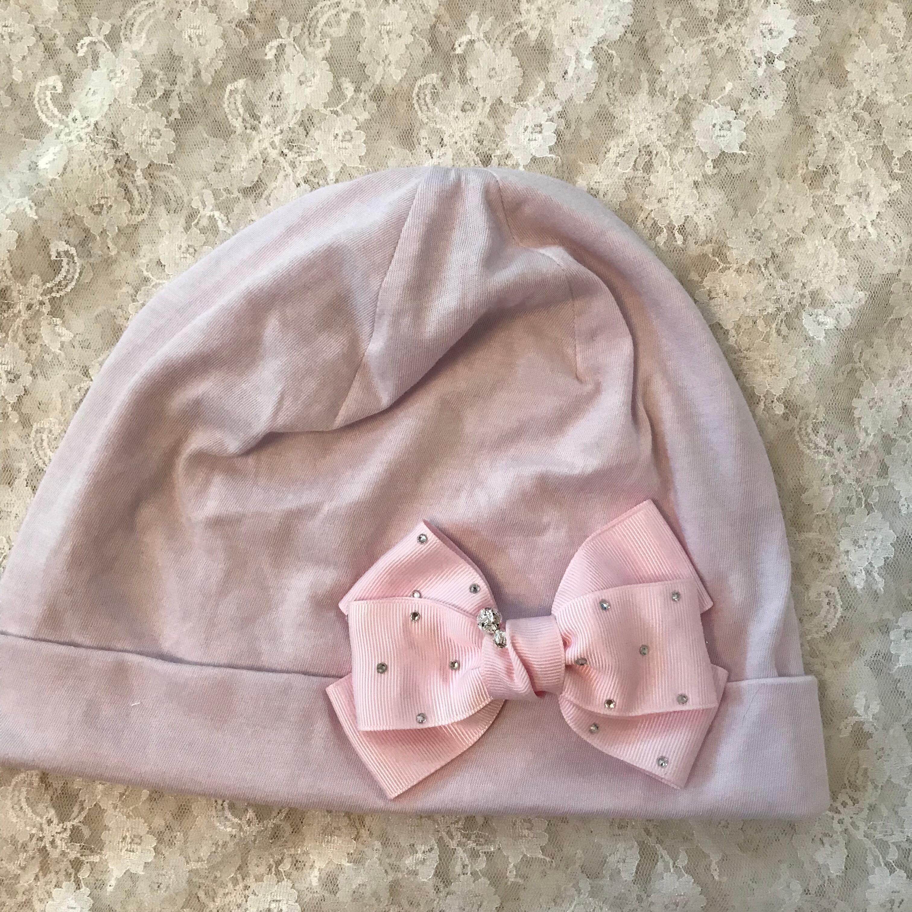 肌触りの良い、伸縮性のあるお生地で作ったお帽子に、キラキラボール付きラインストーンリボンとグログランリボンを付けた素敵なデザインです。
