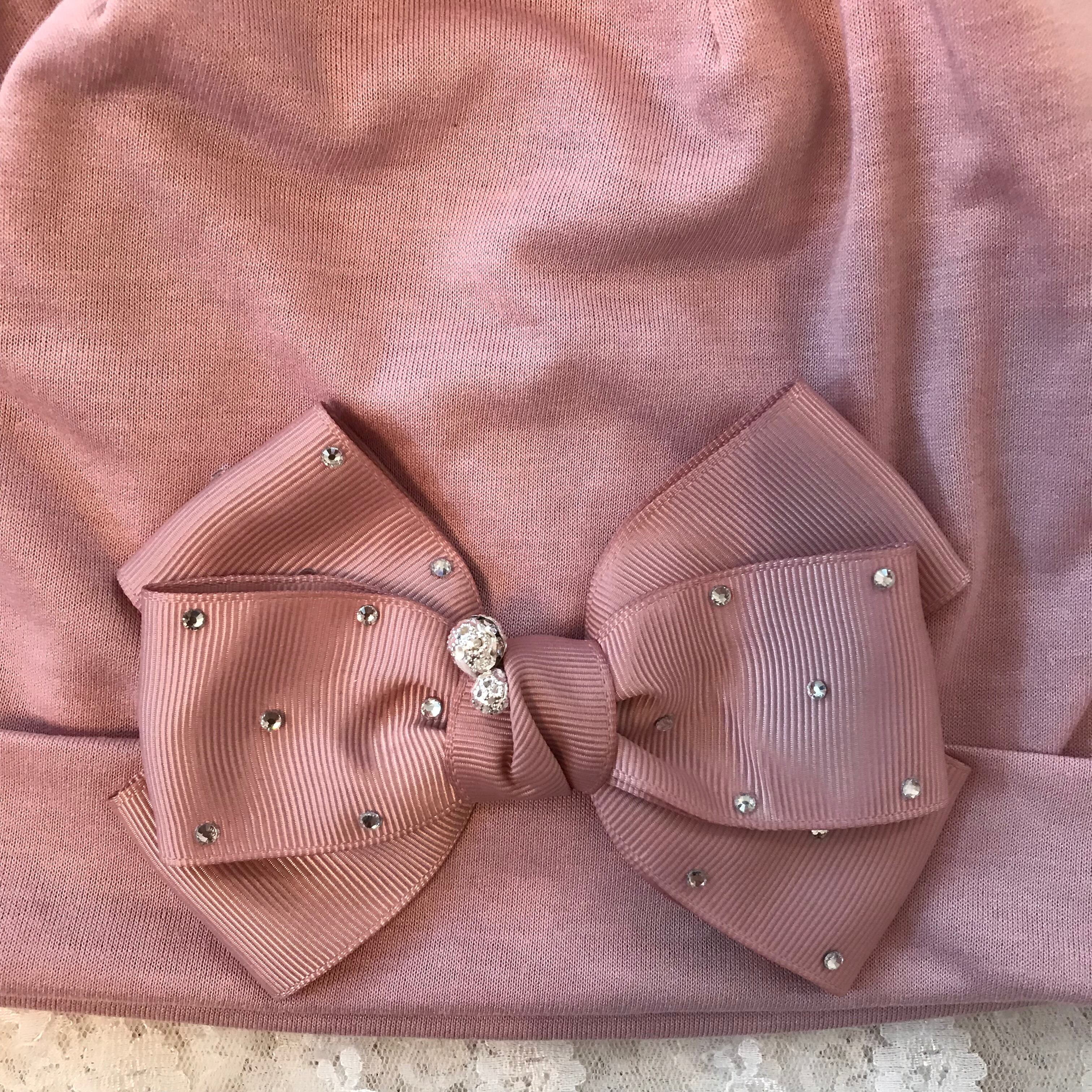肌触りの良い、伸縮性のあるお生地で作ったお帽子に、キラキラボール付きラインストーンリボンとグログランリボンを付けた素敵なデザインです。