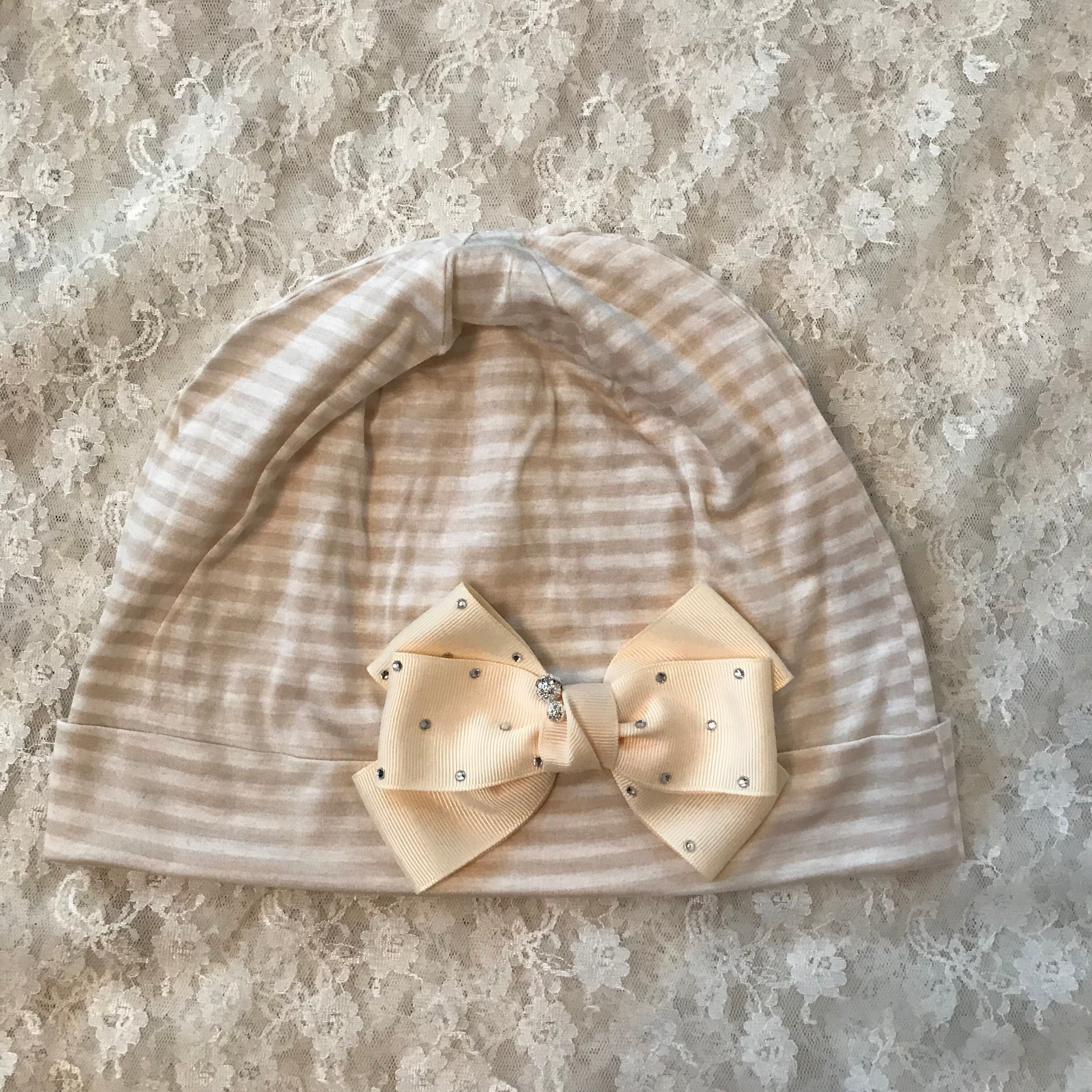 キラキラボールとラインストーンリボンのケア帽子アイボリー系ストライプ17