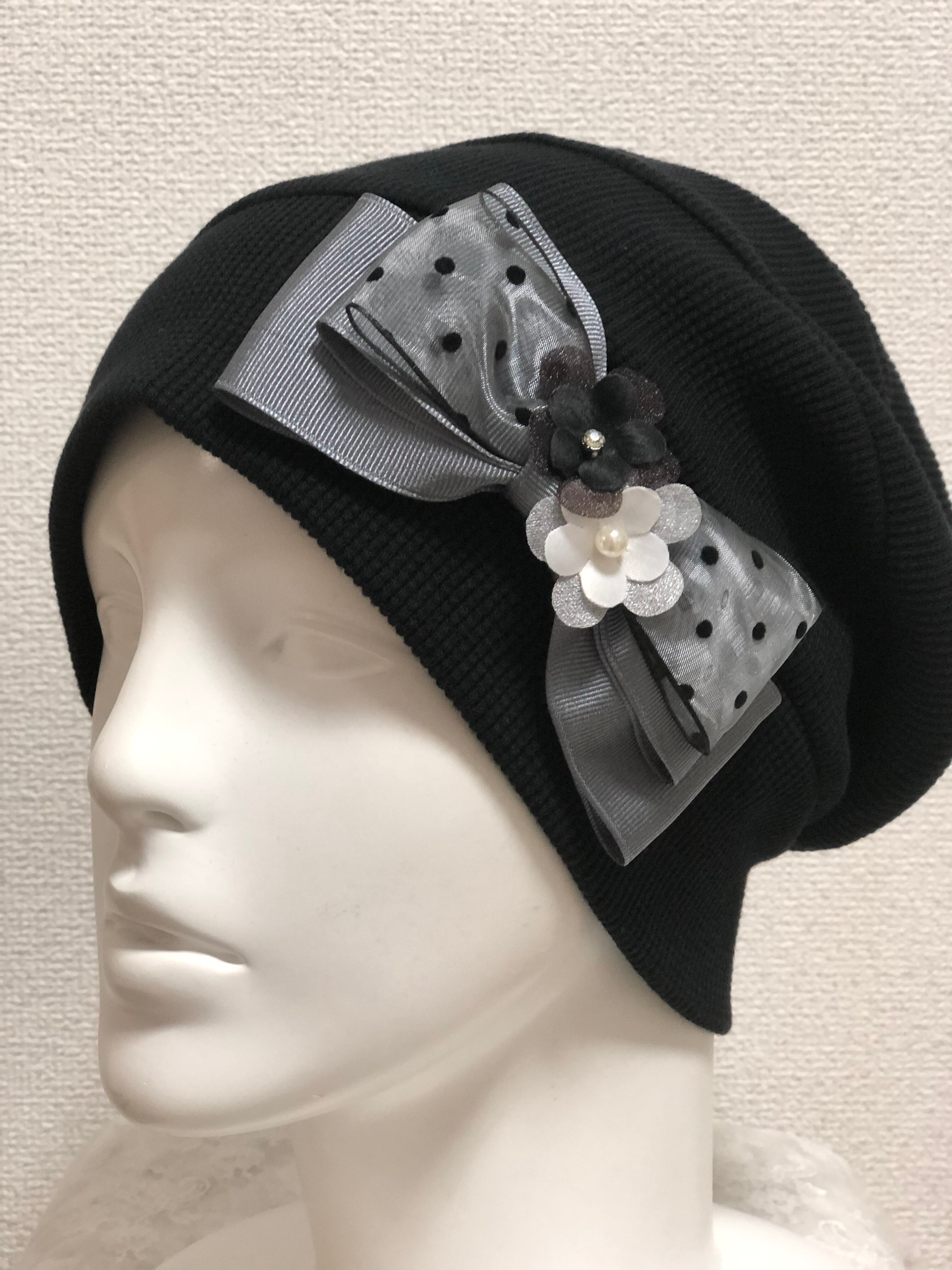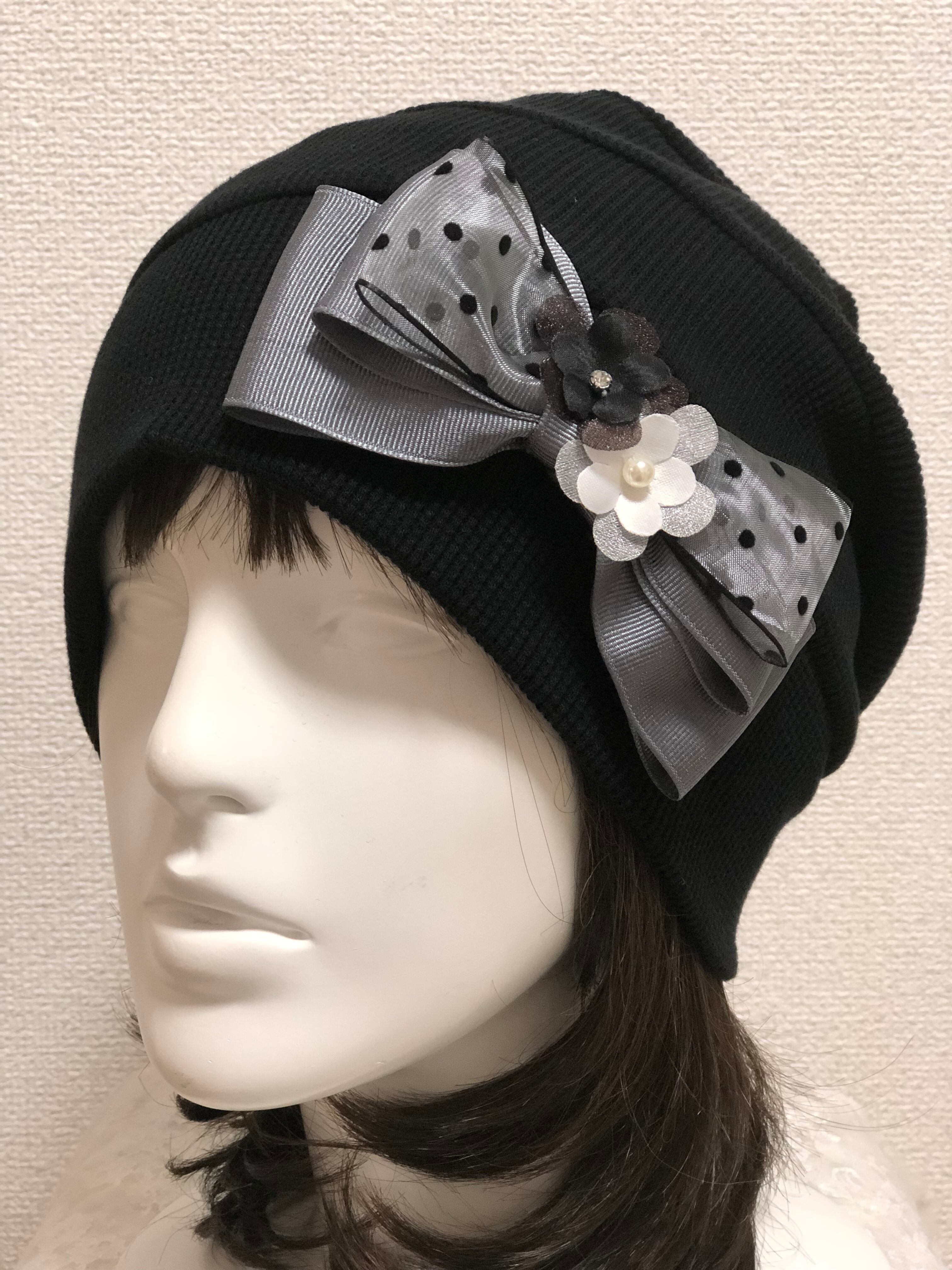 オーガニックコットンワッフル生地のケア帽子チュールのお花 黒