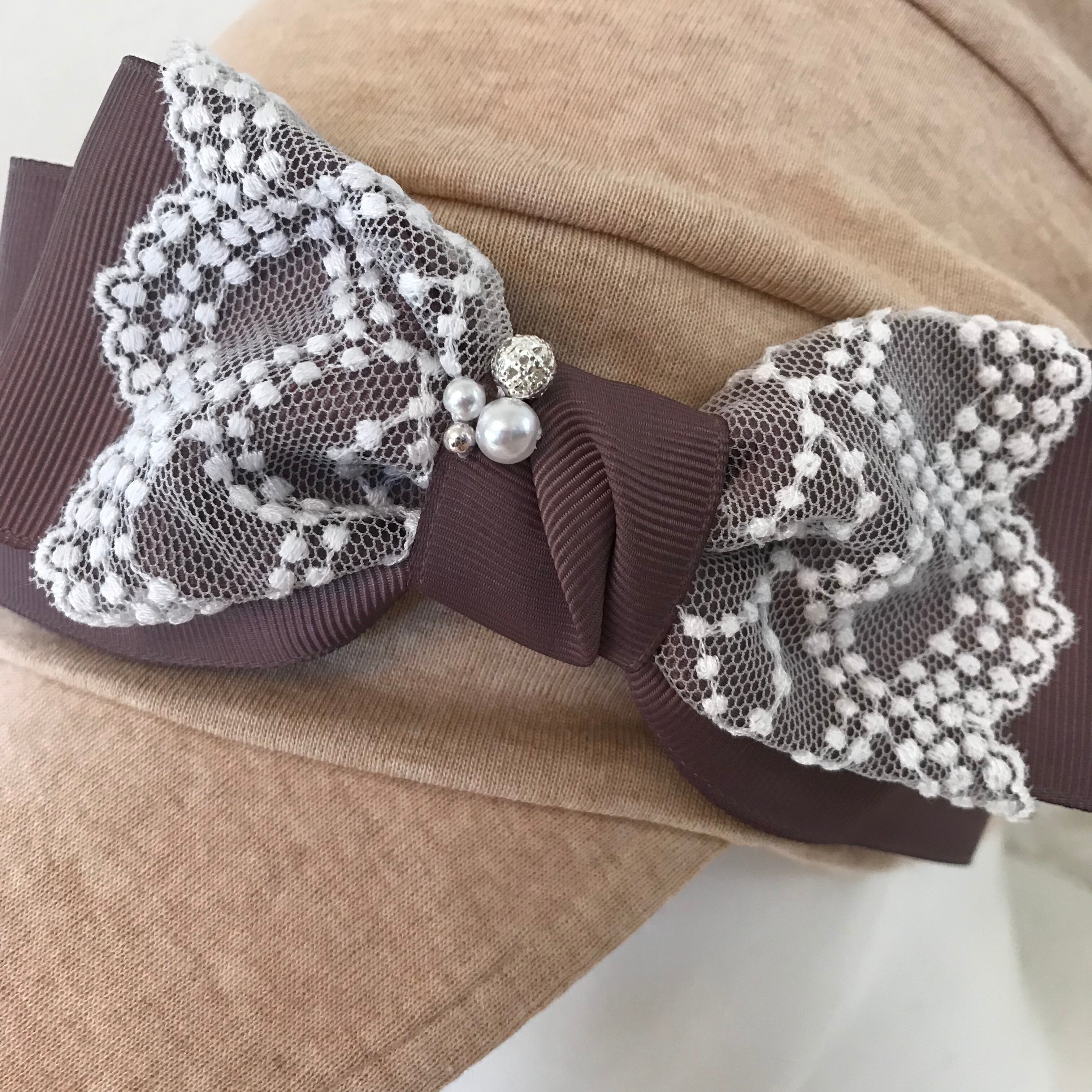 NOCオーガニック認定を受けた100%オーガニック素材の優しい肌触りの生地で作ったキャスケット帽子に、パールとキラキラボール、レース付きグログランリボンを付けた可愛いお品です。