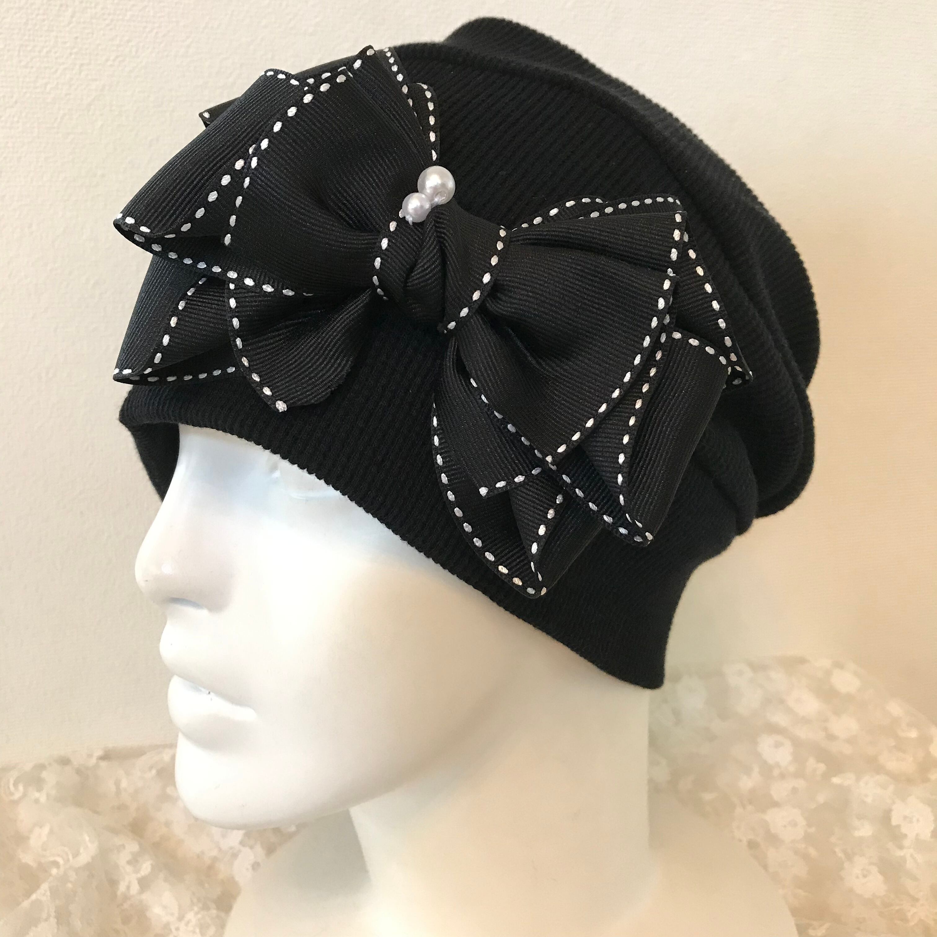 パールと華やかステッチリボンの オーガニックワッフルコットン生地 黒