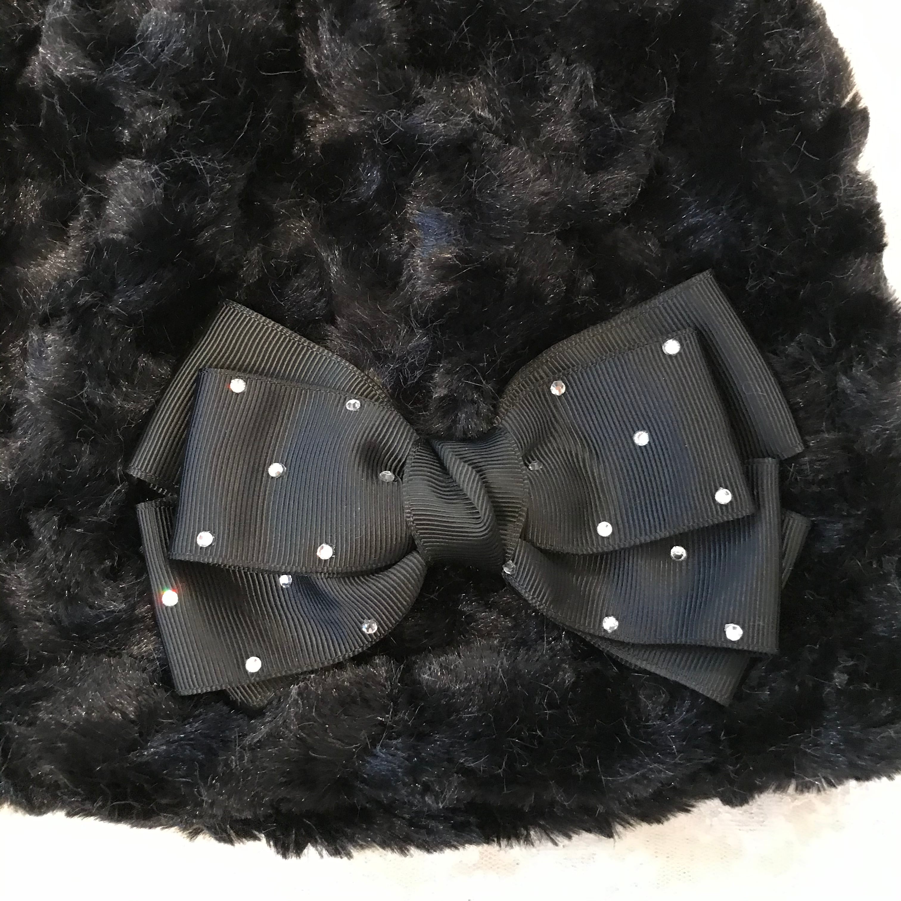 ふわふわモコモコ♡ トルネードファーのケア帽子 黒 ラインストーン付きリボン