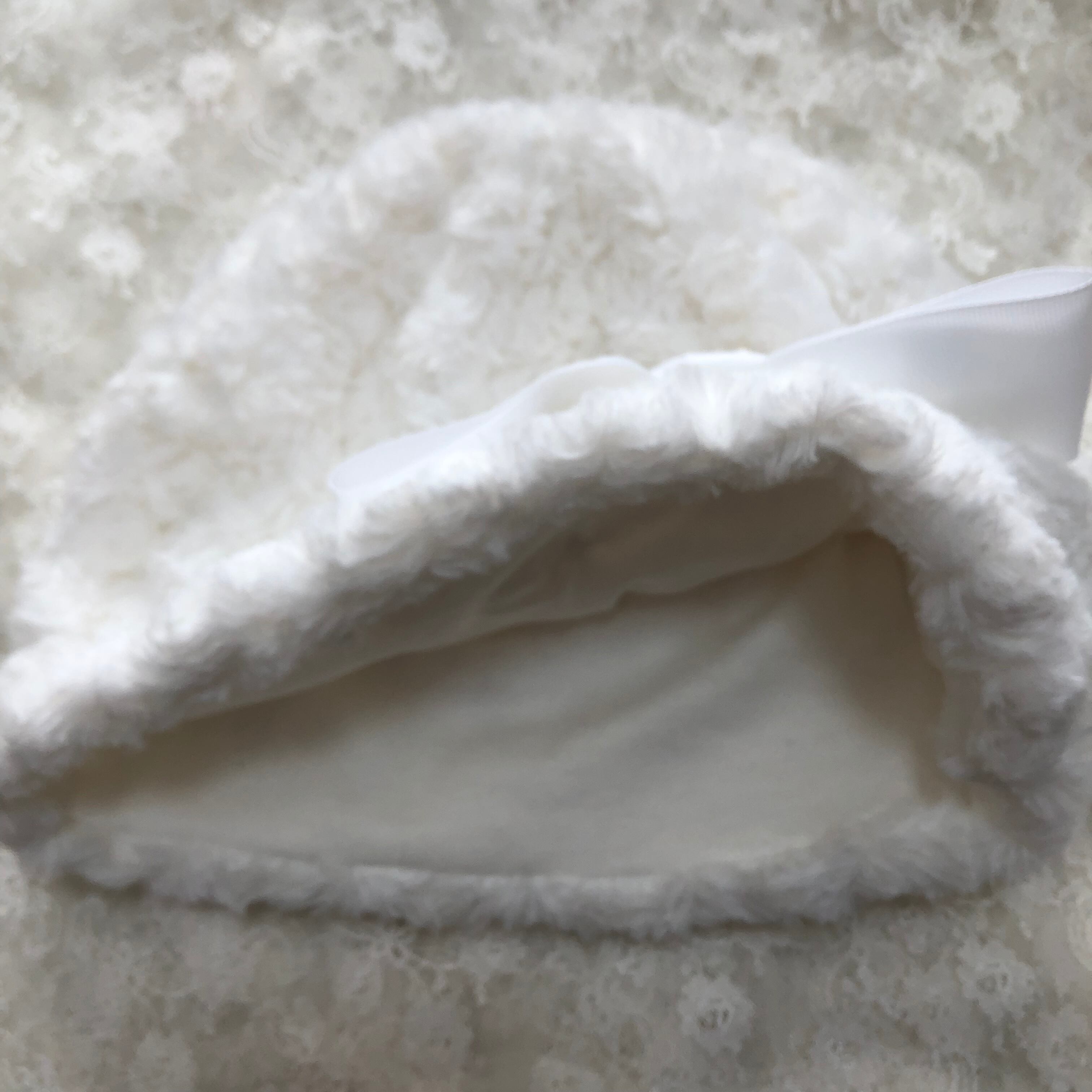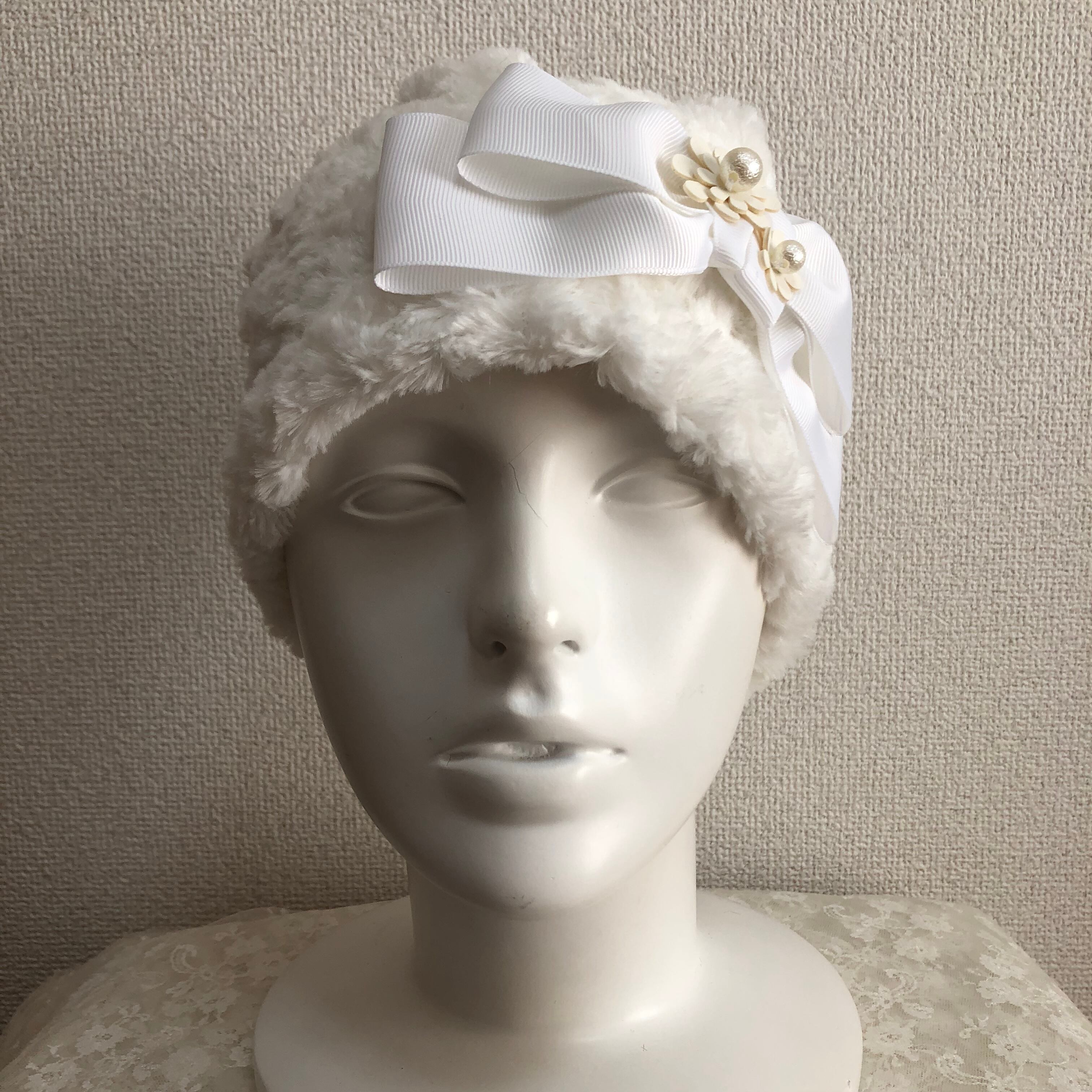 フワフワモコモコ♡トルネードファーのケア帽子 おリボンとお花 ホワイト