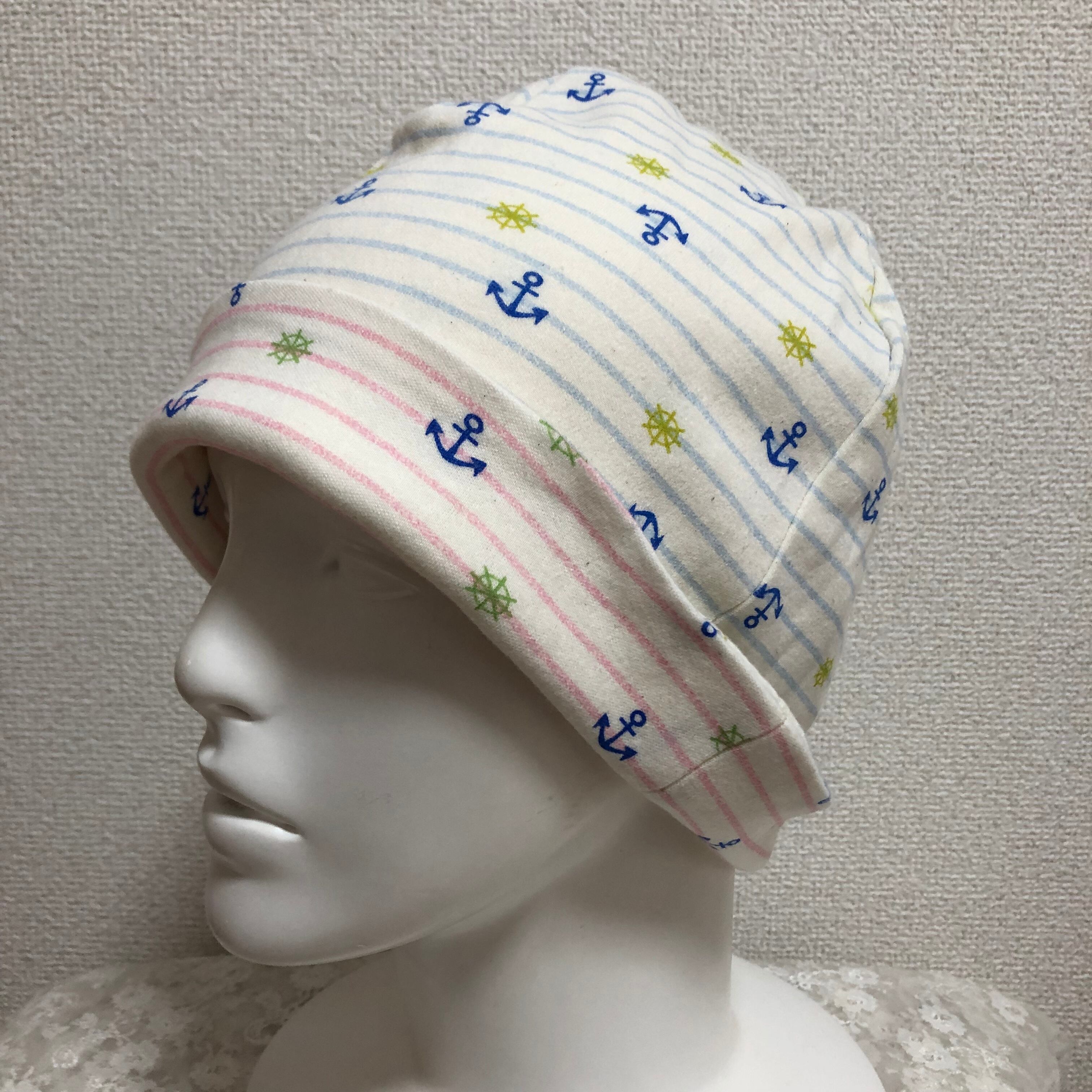 在庫セール 大きめオーガニック リバーシブル コットンイカリ柄ニット生地のケア帽子ピンク×水色