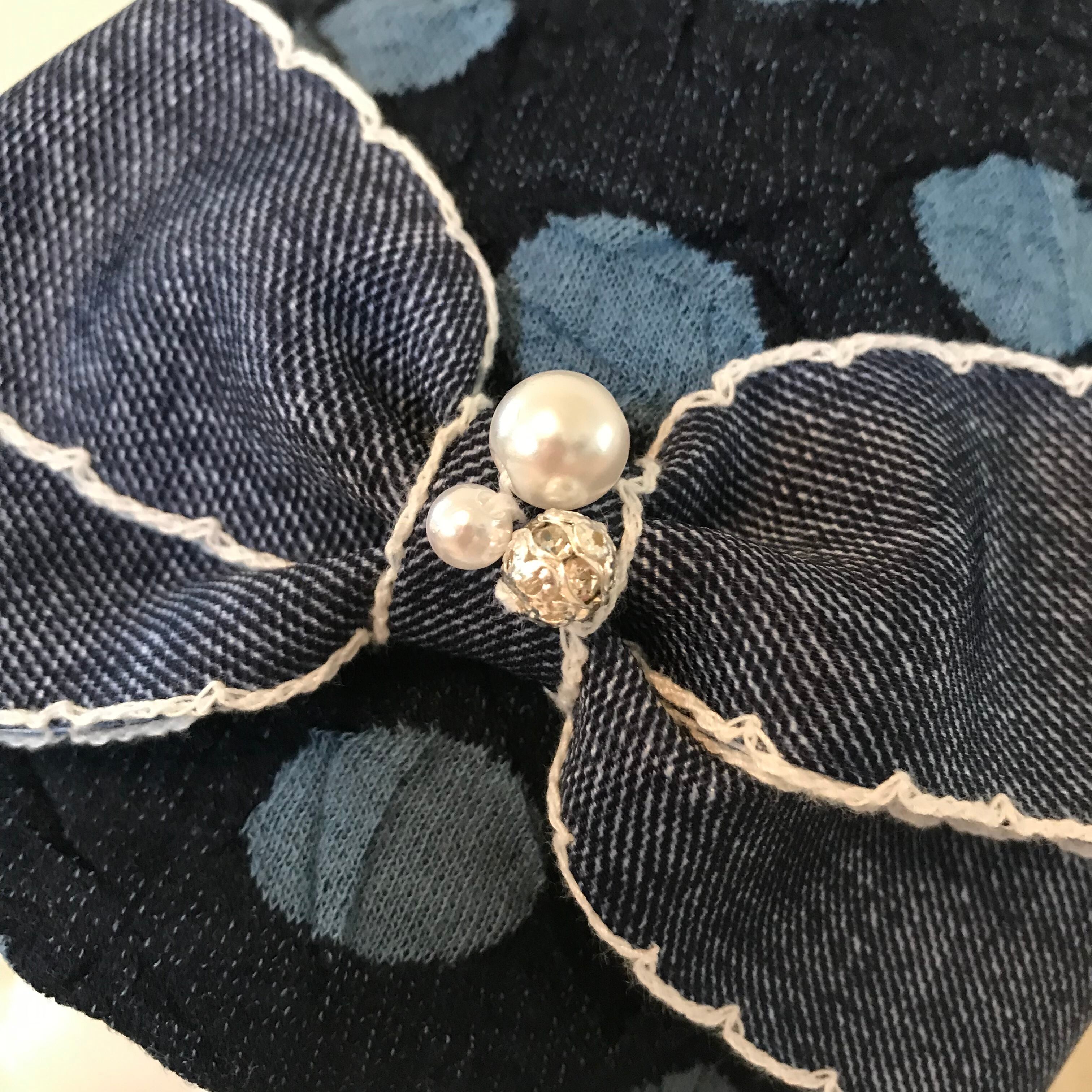パールとピコット付きデニム風リボンのケア帽子 ドット