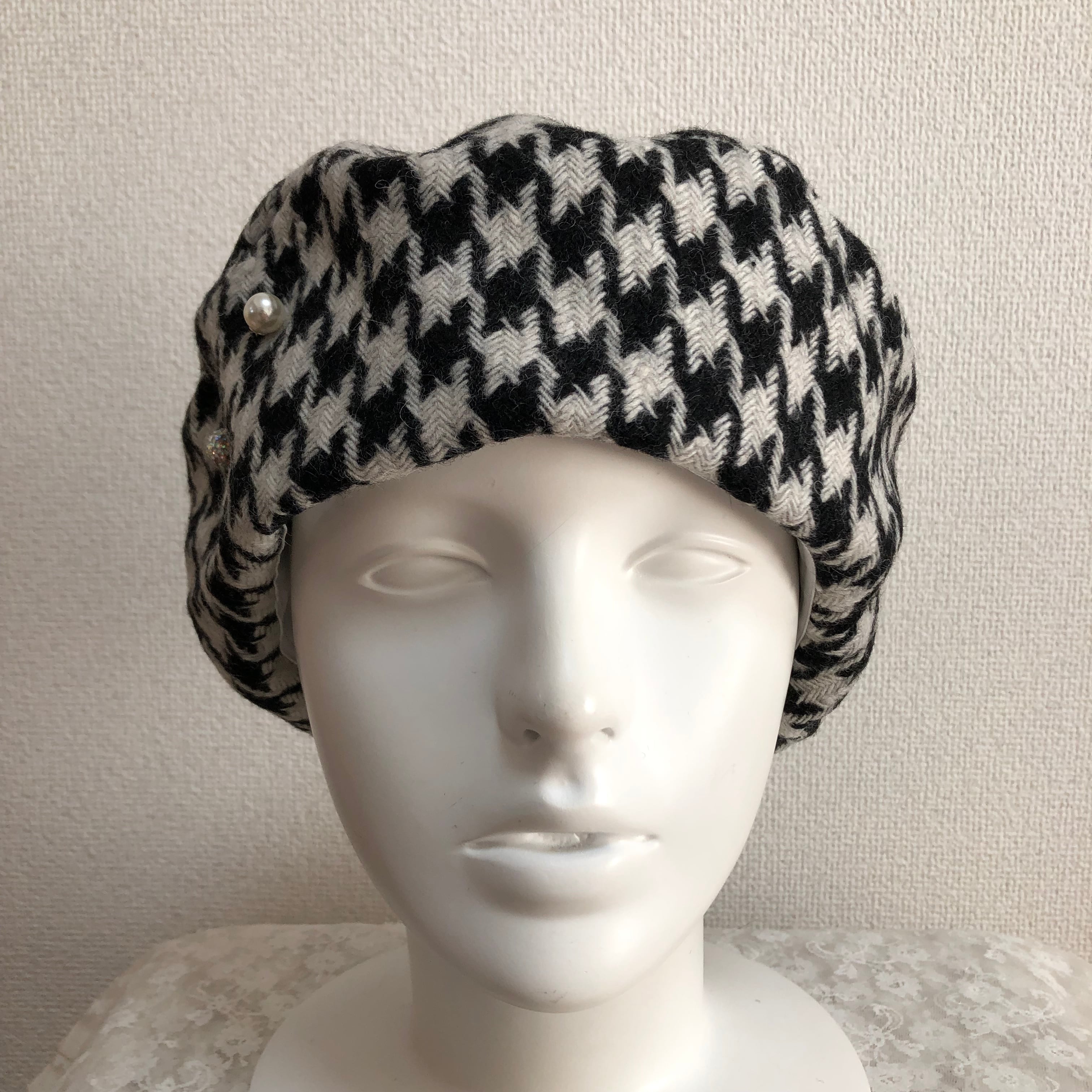 お生地たっぷりベレー帽 白黒千鳥柄