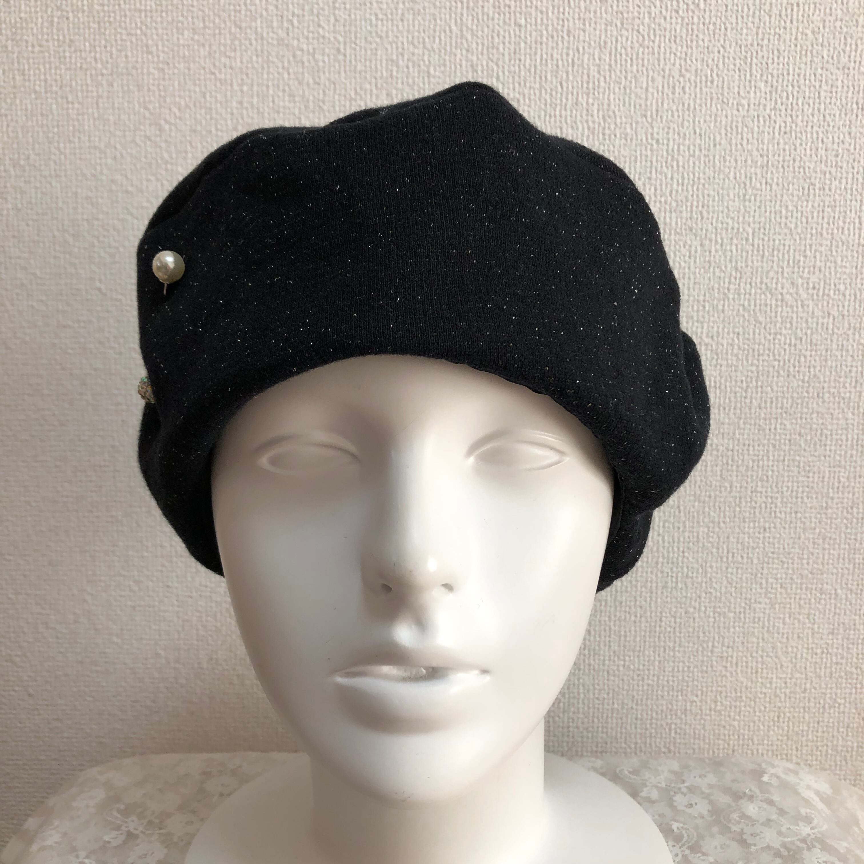 黒ラメ生地をたっぷり使ったベレー帽です。