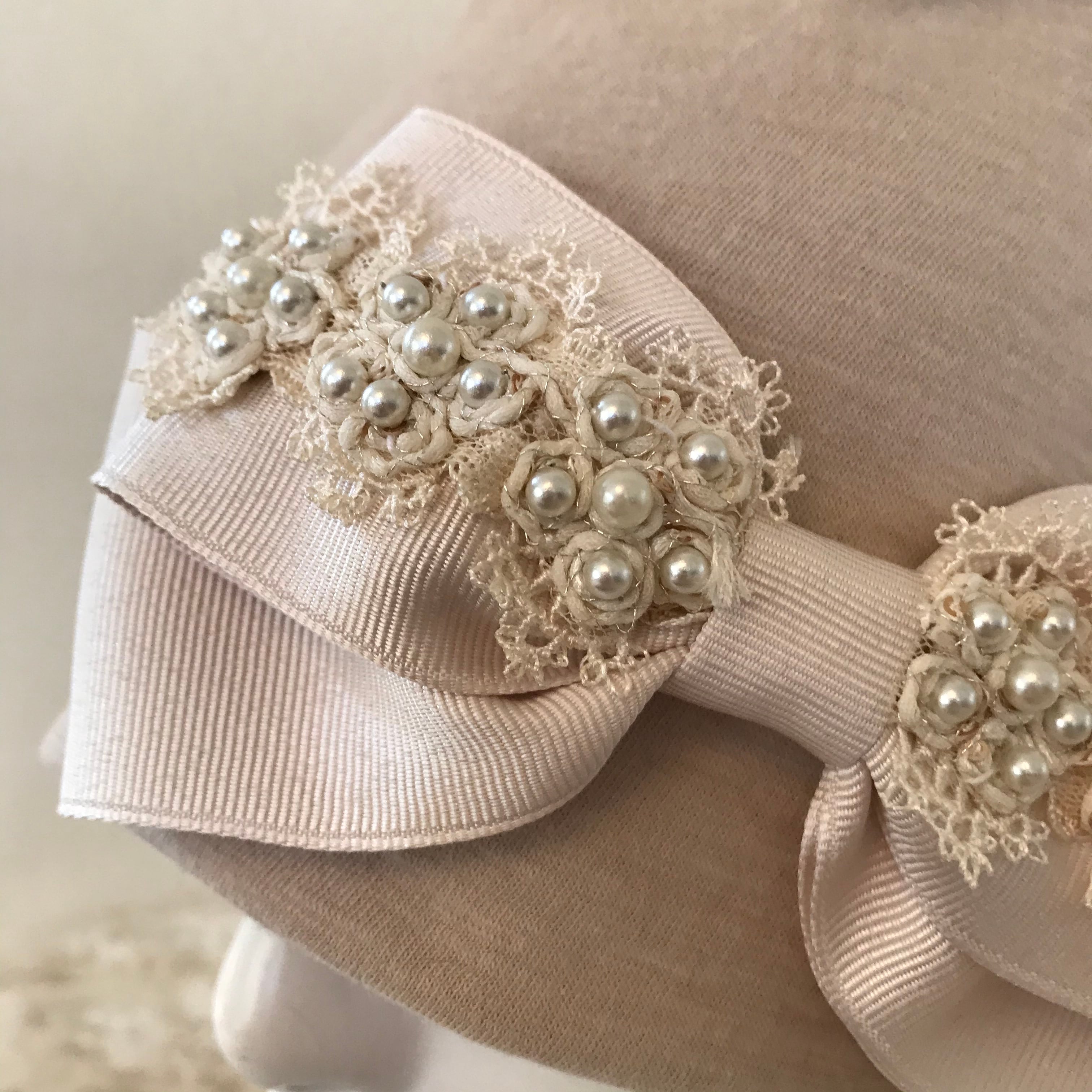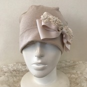 肌触りの良いお生地を使用したお帽子に、パールレース付きグログランリボンを付けた可愛いデザインです。