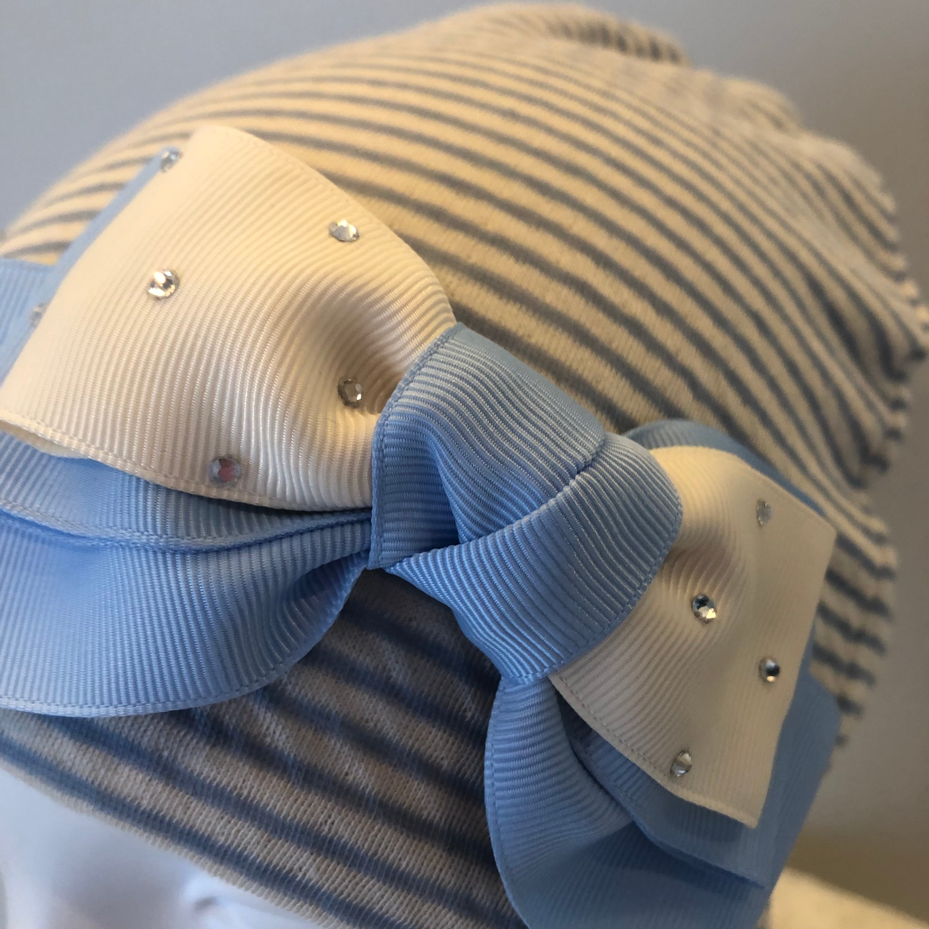 NOCオーガニック認定を受けた100%オーガニック素材の優しい肌触りのお帽子に、ラインストーン付きリボンを付けた可愛いお品です。