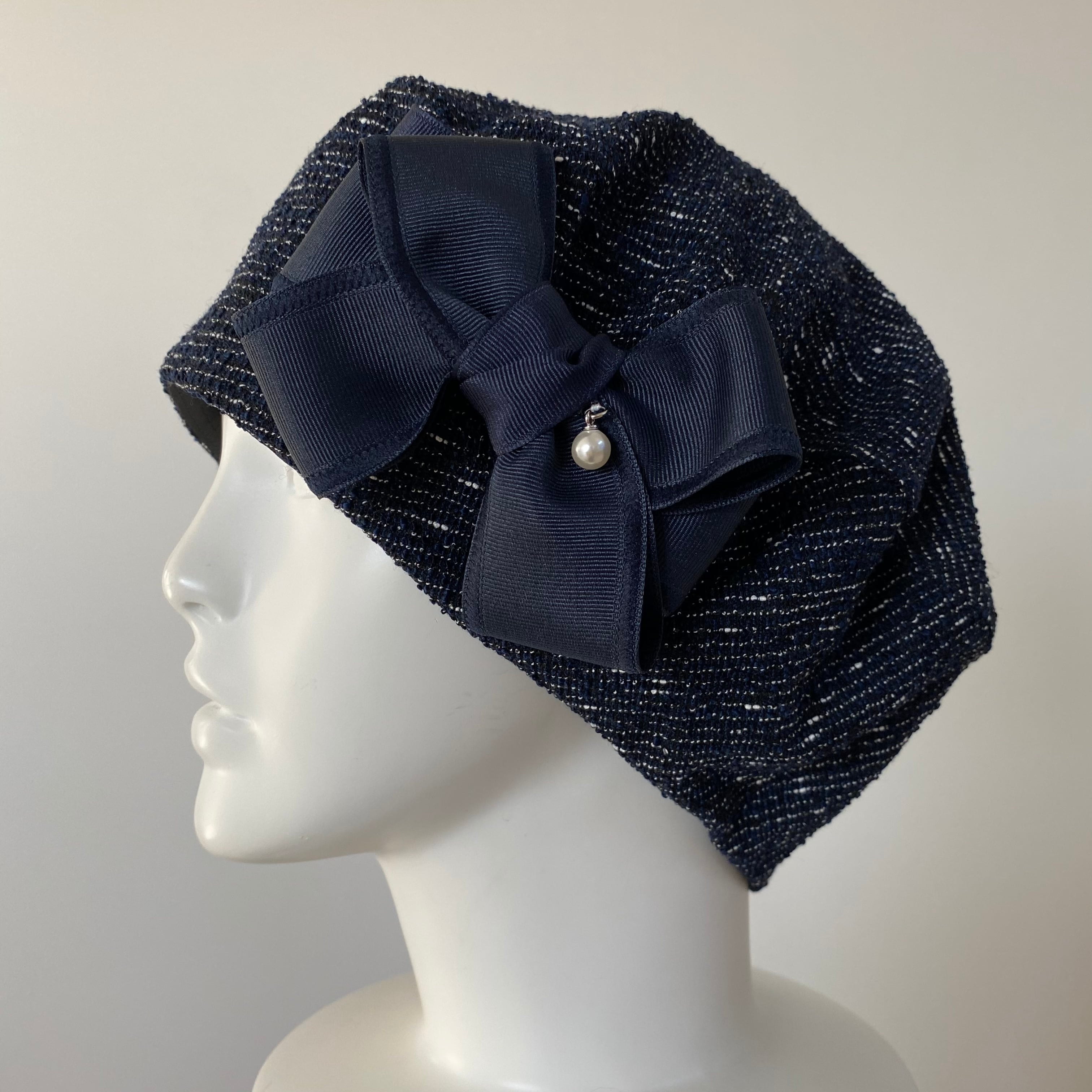 被り口にはグログランリボンを巻いており後ろに少しゴムが入っております。