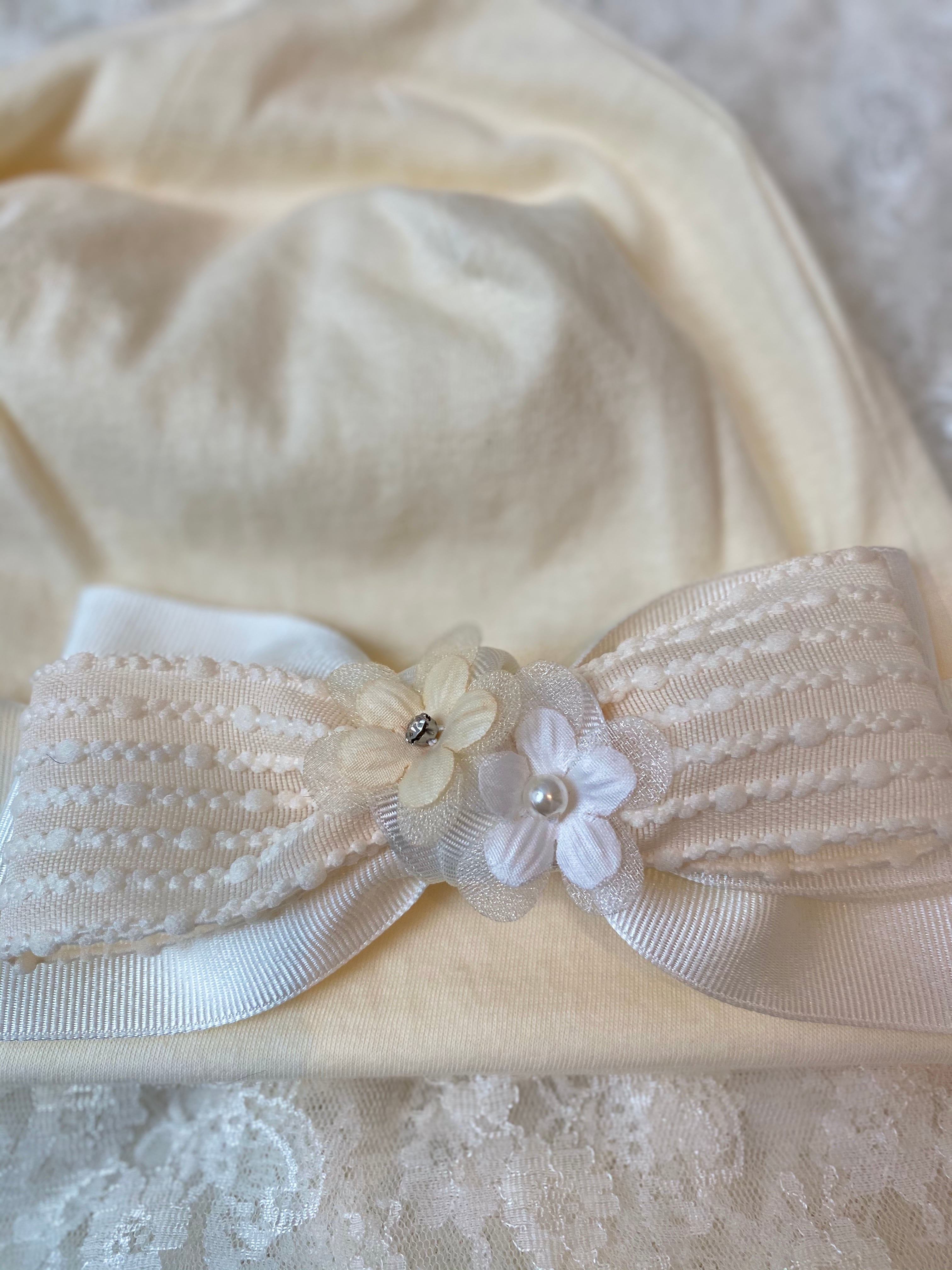 肌触りの良い、伸縮性のあるお生地で作ったお帽子に、チュールでお花付きポップコーンリボンを付けた素敵なデザインです。