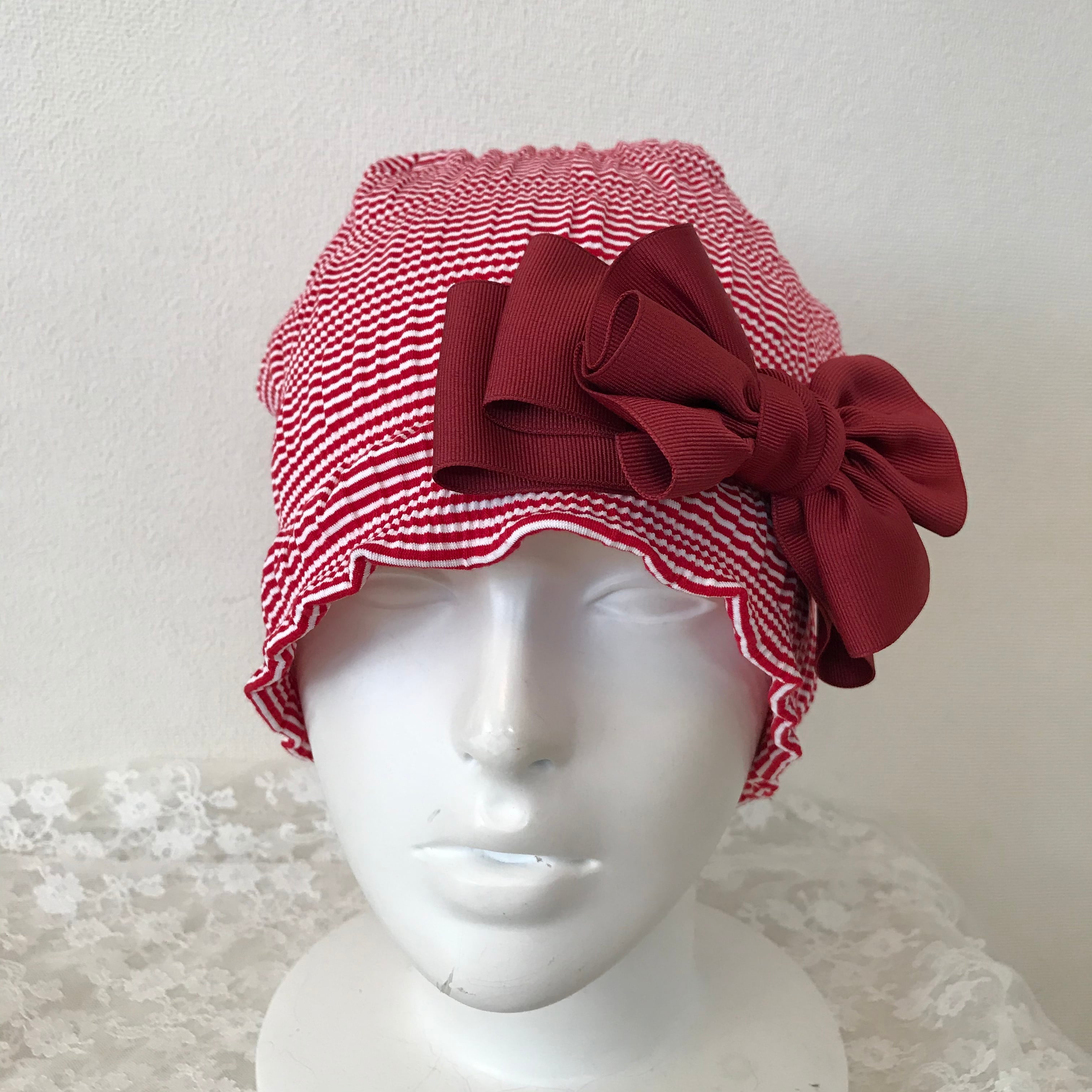 スワロフスキー付きフリルリボンのケア帽子 シャーリング赤