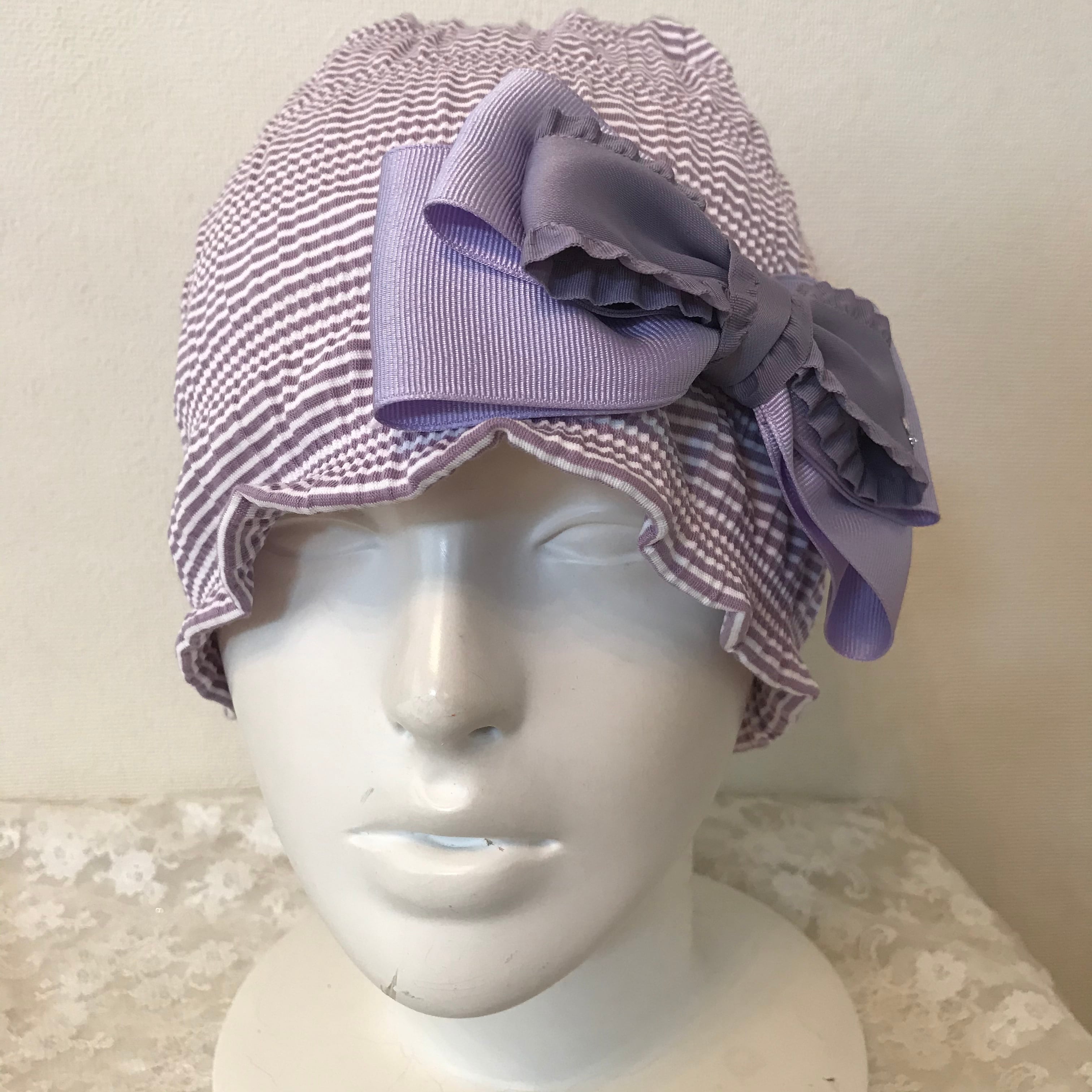 スワロフスキーとフリルリボンのケア帽子 ラベンダー