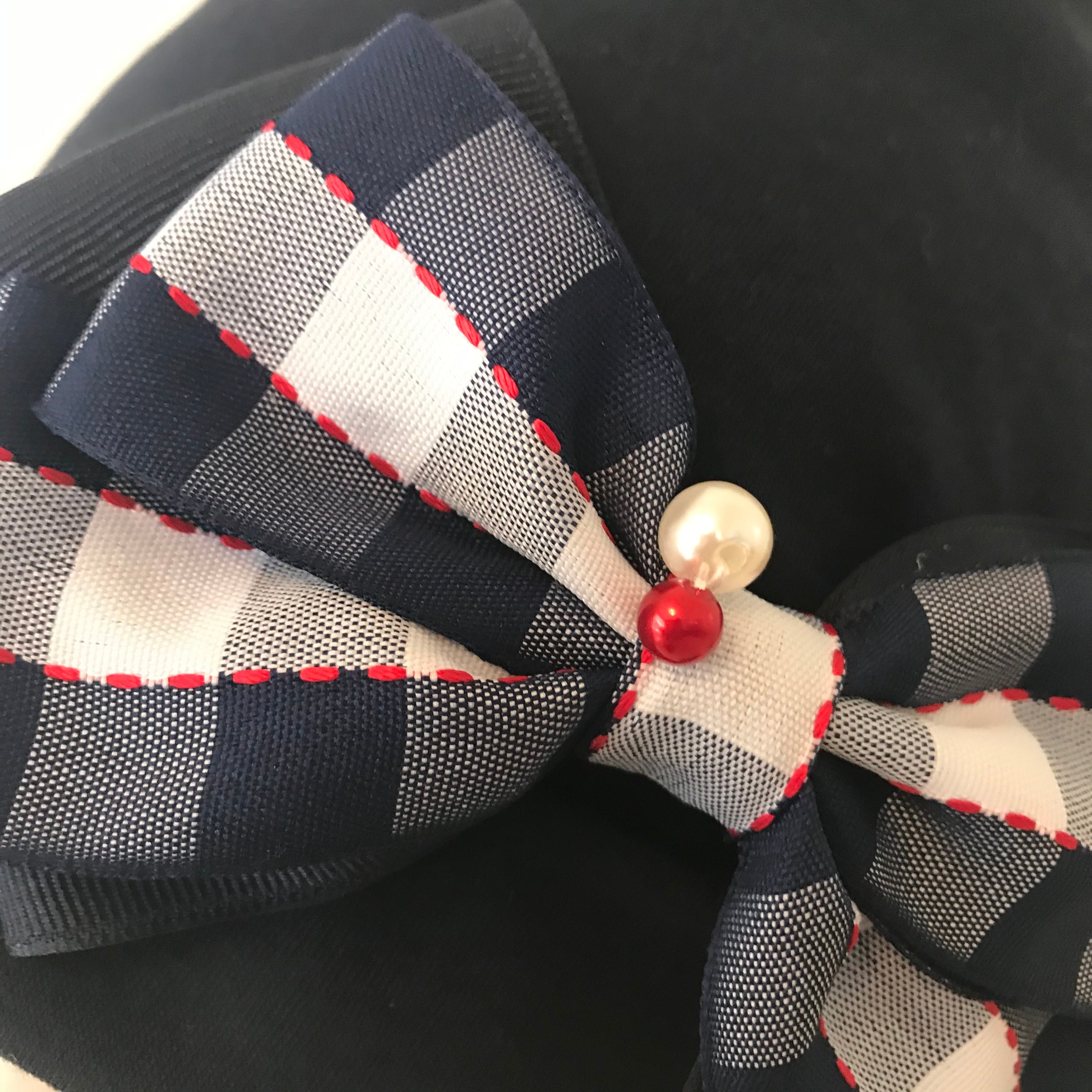 パールと赤ステッチブロックチェックのケア帽子 ネイビー
